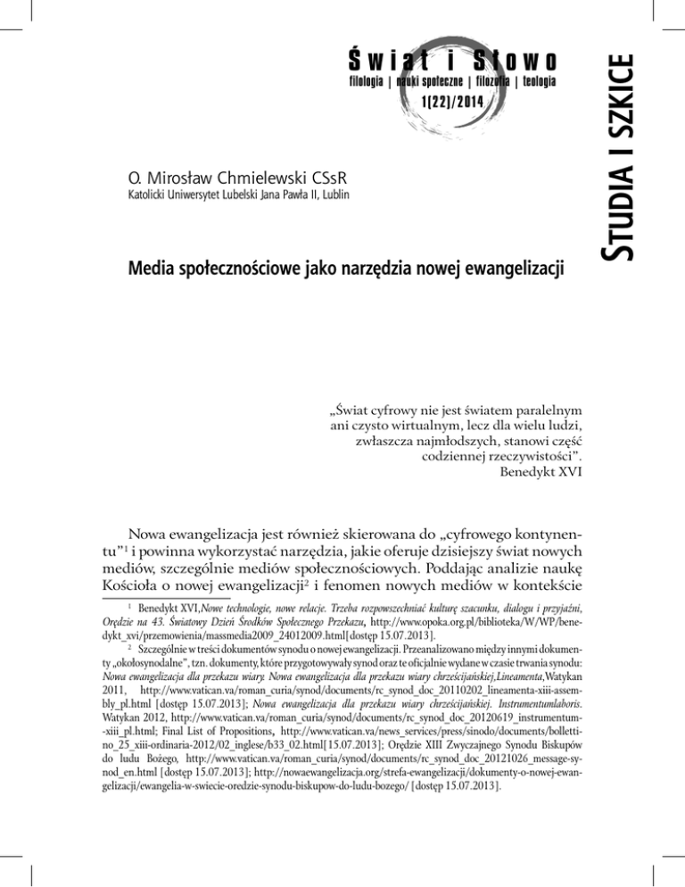 filologia | nauki społeczne | filozofia | teologia 1(22)/2014 O. Mirosław Chmielewski CSsR Katolicki Uniwersytet Lubelski Jana Pawła II, Lublin Media społecznościowe jako narzędzia nowej ewangelizacji „Świat cyfrowy nie jest światem paralelnym ani czysto wirtualnym, lecz dla wielu ludzi, zwłaszcza najmłodszych, stanowi część codziennej rzeczywistości”. Benedykt XVI Nowa ewangelizacja jest również skierowana do „cyfrowego kontynentu”1 i powinna wykorzystać narzędzia, jakie oferuje dzisiejszy świat nowych mediów, szczególnie mediów społecznościowych. Poddając analizie naukę Kościoła o nowej ewangelizacji2 i fenomen nowych mediów w kontekście 1 Benedykt XVI,Nowe technologie, nowe relacje. Trzeba rozpowszechniać kulturę szacunku, dialogu i przyjaźni, Orędzie na 43. Światowy Dzień Środków Społecznego Przekazu, http://www.opoka.org.pl/biblioteka/W/WP/benedykt_xvi/przemowienia/massmedia2009_24012009.html[dostęp 15.07.2013]. 2 Szczególnie w treści dokumentów synodu o nowej ewangelizacji. Przeanalizowano między innymi dokumenty „okołosynodalne”, tzn. dokumenty, które przygotowywały synod oraz te oficjalnie wydane w czasie trwania synodu: Nowa ewangelizacja dla przekazu wiary. Nowa ewangelizacja dla przekazu wiary chrześcijańskiej,Lineamenta,Watykan 2011, http://www.vatican.va/roman_curia/synod/documents/rc_synod_doc_20110202_lineamenta-xiii-assembly_pl.html [dostęp 15.07.2013]; Nowa ewangelizacja dla przekazu wiary chrześcijańskiej. Instrumentumlaboris. Watykan 2012, http://www.vatican.va/roman_curia/synod/documents/rc_synod_doc_20120619_instrumentum-xiii_pl.html; Final List of Propositions, http://www.vatican.va/news_services/press/sinodo/documents/bollettino_25_xiii-ordinaria-2012/02_inglese/b33_02.html[15.07.2013]; Orędzie XIII Zwyczajnego Synodu Biskupów do ludu Bożego, http://www.vatican.va/roman_curia/synod/documents/rc_synod_doc_20121026_message-synod_en.html [dostęp 15.07.2013]; http://nowaewangelizacja.org/strefa-ewangelizacji/dokumenty-o-nowej-ewangelizacji/ewangelia-w-swiecie-oredzie-synodu-biskupow-do-ludu-bozego/ [dostęp 15.07.2013]. STUDIA I SZKICE Świat i Słowo 214 O. Mirosław Chmielewski CSsR kultury medialnej3, w niniejszym artykule została podjęta próba ukazania mediów społecznościowych jako narzędzi nowej ewangelizacji. Nowa ewangelizacja i media społecznościowe – próba ustaleń terminologicznych Ewangelizacja należy do istoty misji Kościoła, której treścią jest głoszenie Dobrej Nowiny o zbawieniu w Jezusie Chrystusie. Obradujący jesienią 2012 roku XIII Synod Biskupów był bez wątpienia ważnym podsumowaniem dotychczasowej refleksji i praktyki Kościoła w zakresie nowej ewangelizacji4. Jednocześnie w czasie obrad synodu nie wypracowano jednej definicji pojęcia nowa ewangelizacja, raczej nastąpiło jego poszerzenie5. W dokumentach pre- i postsynodalnych z roku 2012 mowa jest o: a) osobach, które w ogóle nie znają Chrystusa (missio ad gentes), b) wszystkich wiernych aktywnie uczestniczących w życiu Kościoła oraz c) chrześcijanach, którzy formalnie przynależą do Kościoła, ale oddalili się od niego i Chrystusa6. Czynnikiem zespalającym powyższe trzy grupy adresatów ewangelizacyjnej misji Kościoła jest samo dzieło nowej ewangelizacji, w istocie którego leży dzielenie się wiarą w Jezusa Chrystusa, czyli wejście w sytuację komunikacji z każdą grupą adresatów i z każdym człowiekiem z osobna. Celem tego procesu komunikacji wiary jest umożliwienie adresatom nowej ewangelizacji nawiązania pierwszego kontaktu z Bogiem– Jezusem Chrystusem (1. grupa),bądź pogłębieniem komunii z Bogiem (2. grupa), bądź pomoc w ponownym odnalezieniu drogi do spotkania z Bogiem w osobie Jezusa Chrystusa (3. grupa). W Orędziu wydanym na zakończenie synodu, ojcowie synodalni określi istotę nowej ewangelizacji jako: ukazywanie po raz kolejny, ale w nowy sposób, ludzkim sercom i umysłom, które we współczesnym świecie często są roztargnione i zdezorientowane, „wiecznego piękna i nowości spotkania z Chrystusem”7. 3 Wśród wielu dokumentów poświęconych nowym mediom przede wszystkim należy się odwołać do orędzi Benedykta XVI na Światowy Dzień Środków Społecznego Przekazu, zob. http://www.vatican.va/holy_father/benedict_xvi/messages/communications/index_en.htm [dostęp 25.07.2013]. 4 XIII Zwyczajne Zgromadzenie Ogólne Synodu Biskupówpod hasłem „Nowa ewangelizacja dla przekazu wiary chrześcijańskiej” obradowało 7–28 października 2012 w Rzymie. 5 A. Lewek podaje cały szereg definicji nowej ewangelizacji, zob. A. Lewek. Nowa ewangelizacja, [w:] Leksykon teologii pastoralnej,red. R. Kamiński, W. Przygoda, M. Fiałkowski,Lublin 2006, s.575-578. 6 Por. Homilia Benedykta XVI na zakończenie obrad XIII Synodu Biskupów, 28 października 2012, http:// www.vatican.va/holy_father/benedict_xvi/homilies/2012/documents/hf_ben-xvi_hom_20121028_conclusione-sinodo_pl.html [dostęp 14.07.2013]. 7 Orędzie XIII Zwyczajnego Synodu Biskupów, jw., n. 3. Media społecznościowe jako narzędzia nowej ewangelizacji 215 Papież Benedykt XVI w homilii zamykającej synod ujął te uwarunkowania ewangelizacyjne jako „trzy wskazania duszpasterskie”, a przypominając o niektórych nowych formach ewangelizacji, wskazał tym samym na potrzebę kontynuacji poszukiwań nowych form i metod nowej ewangelizacji8. Jedną z tych dróg głoszenia w nowy sposób Ewangelii jest wykorzystanie narzędzi generowanych przez kulturę medialną, jakimi są internetowe media społecznościowe. W literaturze przedmiotu nie znajdujemy jednorodnej definicji mediów społecznościowych. Jakub Nowak podkreśla, że sam termin media społecznościowe (social media) jest równie młody, jak jego desygnat9. Trudności w zdefiniowaniu social mediów wynikają przede wszystkim z faktu, iż jest to zjawisko dynamicznie i podlega nieustannym przemianom. Niemal każdego dnia pojawiają się w