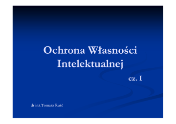 Ochrona Własności Intelektualnej cz. I dr inŜ.Tomasz Ruść Ruść Spis treści Sprawy organizacyjne Historia OWI Przedmiot ochrony prawa autorskiego Prawo autorskie Przeniesienie Praw Autorskich Podsumowanie 2 Sprawy organizacyjne Wykłady 15 godz. Literatura: „Poradnik wynalazcy” – Redakacja Andrzej PyrŜa, Wyd: Urząd Patentowy RP 2008 Broszury: „Znaki towarowe”, „Wzory przemysłowe”, „Wynalazki” – Urząd Patentowy, World Intellectual Property Organization „Ochrona własności intelektualnej w pigułce” – Tomasz Cygan, Regionalna Izba Gospodarcza w Katowicach, Katowice 2010. Zaliczenie: Przedmiot (wykład) zaliczenie z oceną. Przed komputerem program TryPass v1.0 zadający pytania z bazy pytań. Część pytań dostępna tylko po wykładzie na którym była omawiana tematyka. Wykłady nieobowiązkowe ale będą listy obecności. Za 80% frekwencje 20% na egzaminie. 3 Sprawy organizacyjne W1 – Prawo autorskie W2 – Wzory Przemysłowe W3 – Znaki Towarowe W4 – Patenty W5 – Zasady sporządzania dokumentacji zgłoszeń wynalazków i wzorów uŜytkowych w trybie krajowym W6 – Ochrona wynalazków w trybie międzynarodowym i europejskim 4 Prawo Własności Intelektualnej - Prawo Do Firmy - Prawo Do Bazy Danych - Prawo Do KNOW-HOW - Prawo Własności Przemysłowej - Dobra Osobiste - Prawa Autorskie i Prawa Pokrewne 5 Historia OWI Prawo autorskie: Irlandia – pierwszy udokumentowany spór o prawa autorskie (kopia Psałterza) pomiędzy św. Kolumbą a św. Finianem około 560 r. Wyrok: Niech do kaŜdej krowy naleŜy jej cielę, a do kaŜdej ksiąŜki jej córka ksiąŜka. 1223 r. – Statuty Uniwersytetu Paryskiego – zezwolenie Ŝeby kopiowanie tekstów dla dla wewnętrznego uŜytku uniwersyteckiego XV w. przywileje weneckie – wymóg zgody autora na publikacje dzieła 1518r. – pierwszy przywilej drukarski, wydany Anglii przez Ryszarda III na rzecz królewskiego drukarza Richarda Pynsona 1529r. Henryk VIII ustanawia system przywilejów drukarskich dzierŜawionych przez Stationer’s Company (Londyńskie Zrzeszenie Sprzedawców Papieru) 6 Historia OWI XVII w. Anglia unormowania prawne chroniące prawa do publikowania drukiem tekstów, dzieł: „nikomu nie wolno drukować bez uzyskania przywileju zarejestrowania dzieła w Stationers’ Company i zgody właściciela praw” - 1709 – Statut Królowej Anny - został przyjęty przez Parlament Angielski w 1710r. – pierwsza na świecie ustawa o prawie autorskim x okres ochronny: 14 lat (dla wszystkich utworów wydanych przed 1710 r. – 21 lat) x moŜliwość jednorazowego przedłuŜenia ochrony (gdyby autor Ŝył) o dodatkowe 14 lat 7 Historia OWI OWI w Polsce: - 1926r. ustawa F. Zolla – pierwsza polska ustawa autorska bazująca na rozwiązaniach Europejskich (Niemcy, Francja) - 1952r. Ustawa określała sztywne zasady obrotu utworami i regulowane stawki wynagrodzeń autorskich ustalane przez państwo w formie uchwał Rady Ministrów 04.02.1994 ustawa Prawo Autorskie i Prawa Pokrewne 8 Historia OWI Patent – z łaciny „litterae patentes” oznacza „list otwary” – dokumenty urzędowe potwierdzające nadanie podmiotom w nich wymienionym określonych praw i przywilejów albo tytułów 1315r. najstarszy przywilej o charakterze patentowym dla urządzenia technicznego, nadany przez króla czeskiego Jana Luksemburczyka dla konstruktora pompy odwadniającej do kopalń 1409r. ustawa wenecka – pierwszy akt prawny na świecie który nadawał prawa dla twórców nowych rozwiązań. Czyli od wynalazku wymagało się nowości lokalnej, ujawnienia i rzeczywistego zastosowania, a monopol patentowy był ograniczony w czasie. 1449r. pierwszy przywilej patentowy (technologia wyrobu kolorowego szkła) udzielony na 20 lat na rzecz Johna z Utynam 1623r. Angielska ustawa o monopolach, która znosiła monopole z wyjątkiem patenów na wynalazki. Dla uzyskania patentu na wynalazek trzeba było go stosować oraz nauczenia innych prowadzenia produkcji objętej patentem 9 Historia OWI 1762r. edykt Ludwika XVI określał zasady udzielania przywilejów patentowych na wynalazki: wyłączność na 15 lat, konieczność udowodnienia przydatności wynalazku oraz jego rzeczywiste stosowanie 1789r. zagwarantowanie własności intelektualnej w Konstytucji USA Kongres posiada kompetencję ustawodawczą do popierania postępu nauki i sztuk uŜytecznych, poprzez zapewnienie przez ograniczony czas autorom i wynalazcom wyłącznych praw do ich utworów piśmienniczych i odkryć. Patenty w Polsce Od połowy XVI w. przywileje na rozwiązania techniczne udzielane na czas określony (wcześniej wieczyście) np. Zygmunt III Waza w 1611 r. dla Jana Bandefet de Castroforti na młyn popychowy. 1817r. Prawo o patentach swobody oraz o listach przyznania podpisane przez namiestnika królewskiego Józefa Zajączka oraz ks. Stanisława Staszica Patent swobodyswobody- udzielane na fabryki, rękodzielnie lub inne poŜyteczne zakłady nie zaprowadzone jeszcze w kraju, pierwszym którzy się do ich załoŜenia zgłoszą. Patenty te płatnie udzielane na 3,6 lub 9 lat zapewniały ich beneficjentom, Ŝe nikt inny na danym terenie takiego zakładu nie będzie prowadził. 10 Historia OWI 13.12.1918 r. Dekret Tymczsowy o Urzędzie Patentowym wydany przez Naczelnika Józefa Piłsudskiego Art. 1 Przy Ministerstwie Przemysłu i Handlu istnieje Urząd Patentowy z siedzibą w Warszawie, do którego kompetencji naleŜy udzielanie patentów na wynalazki oraz wydawanie świadectw ochronnych na znaki towarowe. 1919 r. dekrety Naczelnika Państwa o patentach na wynalazki, o ochronie wzorów rysunkowych i modeli oraz ochronie znaków towarowych 1924 r. Ustawa o ochronie wynalazków, wzorów i znaków towarowych 1928 r. rozporządzenie Prezydenta Rzeczpospolitej o ochronie wynalazków, wzorów i znaków towarowych 1962 r. ustawa Prawo wynalazcze 1972 r. ustawa o wynalazczości 30.06.2000 r. Ustawa Prawo własności przemysłowej 11 Przedmiot ochrony prawa autorski