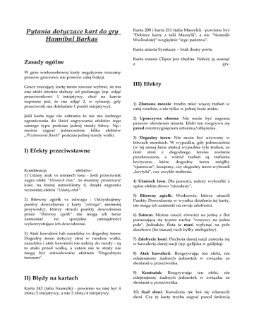 Pytania dotyczące kart do gry Hannibal Barkas Karta 208 i karta 211 (talia Massylii) - powinno być "Dobierz karty z talii Massylii", a nie "Numidii Wschodniej" względnie "tego państwa". Karta miasta Syrakuzy – brak ikony portu Zasady ogólne Karta miasta Clipea jest zbędna. Należy ją usunąć z gry. W grze wieloosobowej karty negatywne rzucamy przeciw graczowi, nie przeciw całej frakcji. Gracz rzucający kartę może zawsze wybrać, że ma ona efekt istotnie słabszy od podanego (np. odjąć przeciwnikowi 1 inicjatywy, choć na karcie napisane jest, że ma odjąć 2, w sytuacji, gdy przeciwnik ma dokładnie 1 punkt inicjatywy). Jeśli karta tego nie zabrania to nie ma żadnego ograniczenia do ilości zagrywania efektów tego samego typu podczas jednej rundy bitwy. Np.: można zagrać jednocześnie kilka efektów „Przełamanie flanki” podczas jednej rundy walki. I) Efekty przeciwstawne Kombinacja efektów: 1) Udany atak vs uśmiech losu - Jeśli przeciwnik zagra efekt "Uśmiech losu", to musimy przerzucić kość, na której ustawiliśmy 0, dzięki zagraniu wcześniej efektu "Udany atak". 2) Bitewny zgiełk vs odwaga - Odzyskujemy punkty dowodzenia z karty "odwaga", niemniej przywódcy, którzy stracili punkty dowodzenia przez "Bitewny zgiełk" nie mogą ich teraz zamieniać na specjalne umiejętności wykorzystujące ich dowodzenie. 3) Atak kawalerii lub zasadzka vs dogodny teren: Dogodny teren dotyczy strat w rundzie walki, zasadzka i atak kawalerii nie należą do rundy - są to ataki przed walką, a zatem nie te straty nie mogą być zniwelowane efektem "Dogodnym terenem". II) Błędy na kartach Karta 242 (talia Numidii) - powinno na niej być 4 złota/2 inicjatywy, a nie 2 złota/4 inicjatywy. III) Efekty 1) Złamane morale: trzeba mieć więcej trafień w całej rundzie, a nie tylko w jednej fazie ataku. 2) Uporczywa obrona: Nie może być zagrana przeciw obrońcom miasta. Efekt ten rozgrywa się przed rozstrzygnięciem szturmu/oblężenia. 3) Dogodny teren: Nie może być używany w bitwach morskich. W wypadku, gdy jednocześnie (w tej samej fazie ataku) wypadnie tyle trafień, że ilość strat z dogodnego terenu zostanie przekroczona, a wśród trafień są trafienia krytyczne, które dogodny teren mógłby "sparować", losujemy, czy dogodny teren wybronił „krytyki”, czy zwykłe trafienia. 4) Uśmiech losu: Dla jasności, należy wykreślić z opisu efektu słowo "nieudany". 5) Bitewny zgiełk: Wodzowie, którzy utracili Punkty Dowodzenia w wyniku działania tej karty, nie mogą ich zamienić na swoje zdolności. 6) Sztorm: Można rzucić również na jedną z flot poruszającą się typem ruchu: "wszyscy na jedno pole". Jednakże, flota ta musi wpłynąć na pole docelowe (bo inaczej ruch byłby nielegalny). 7) Zdobycie koni: Piechota danej nacji zmienia się w kawalerię danej nacji (np. galijska w galijską) 8) Atak kawalerii: Rozgrywając ten efekt, nie odejmujemy żadnych jednostek w związku ze słoniami u przeciwnika. 9) Kontratak: Rozgrywając ten efekt, nie odejmujemy żadnych jednostek w związku ze słoniami u przeciwnika. 10) Szał słoni: Kawaleria nie boi się własnych słoni. Czy tę kartę trzeba zagrać przed śmiercią słonia, czy też po niej, ew. w obu sytuacjach? W obu sytuacjach. 11) Przewodnik: Można przemieścić o jedno dodatkowe pole armię, która właśnie poruszyła się lądem. Ideą tego efektu jest sytuacja, że armia pozyskuje autochtona, który wskazuje lepszą/krótszą drogę maszerującej armii. A więc armia MUSI się poruszać a nie stać w miejscu. Czy można go rozegrać tak? Armia piechoty zostaje aktywowana i rozpoczyna ruch. Wydaje punkt ruchu przesuwając się o jedno pole, następnie zagrany zostaje przewodnik, dzięki czemu armia przesuwa się na drugie pole nie wydając punktu ruchu, a potem, korzystając z tego, że punkt ruchu został zaoszczędzony, armia wydaje go na oblężenie lub szturm miasta, stojącego na tym właśnie polu (odległym o 2 od startowego, więc bez przewodnika nie dałoby się oblec). Czy takie zagranie jest legalne? Tak. 12) Straty marszowe – by móc ten efekt rzucić na armię przeciwnika, armia ta musi poruszyć się o 2 pola po lądzie. 13) Italikowie - w grze 4-osobowej zagrać to wydarzenie może tylko ta osoba, która odniosła rzeczone zwycięstwo, a nie obydwie osoby. 14) Zdobycie broni: "Zagraj na armię Hannibala...". To znaczy: na armię, w której znajduje się wódz – Hannibal. 15) Przejście Galów: 3 jednostki rzymskich Galów przechodzą na stronę Kartaginy. O tym czy ucieka piechota czy kawaleria decyduje los. Analogicznie w wydarzeniu: Ucieczka Galów IV) Wydarzenia 1) Libijczycy - Gracz musi zapłacić 8 talentów ze skarbca, jeśli nie może - przeciwnik dostaje 3 PZ. Nazwa "Libijczycy" jest trochę niefortunna, gdyż tak samo nazywa się jeden z efektów, a wydarzenie jest takie samo, jak w innych taliach piraci. Gracz może zrezygnować z zapłacenia talentów i dać przeciwnikowi PZ, nawet, jeśli talenty posiada. Prawidłowo tekst na karcie powinien brzmieć „ nie może lub nie chce zapłacić” 2) Piraci - odejmujemy złoto nie od dochodu, lecz od skarbca gracza. Analogicznie jak wyżej gracz może zrezygnować z zapłacenia talentów i dać przeciwnikowi PZ, nawet, jeśli talenty posiada. Prawidłowo tekst na karcie powinien brzmieć „ nie może lub nie chce zapłacić” 3) Wsparcie piratów - należy interpretować je tak, jakbyśmy na jeden ruch dostali maksymalnie 3 okręty, którymi wykonujemy normalny ruch morski + załadunek i wyładunek. 4) Inżynieria grecka (karta 135 Syrakuzy) obniżająca poziom każdego obleganego miasta: Nie działa przy szturmach "z marszu" tzn. bez rozpoczynania oblężenia. Podobnie nie można oblec miasta, mając tyle samo jednostek, co poziom murów przeciwnika, gdyż poziom ten obniża się dopiero po rozpoczęciu oblężenia. 5) Burze - Co się dzieje, jeśli przed rzuceniem tej karty, jakaś flota już zakończy