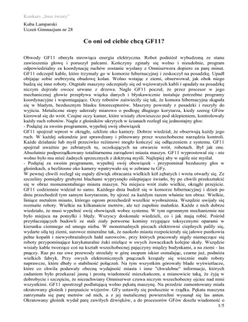 Konkurs „Inne światy” Kuba Lamparski Uczeń Gimnazjum nr 28 Co oni od ciebie chcą GF11? Obwody GF11 obmyła mrowiąca energia elektryczna. Robot podniósł wybudzoną ze stanu zawieszenia głowę i poruszył palcami. Kończyny zginały się wolno i nieudolnie, program odpowiedzialny za koordynację ruchów zostanie wysłany z Omniserwera dopiero za parę minut. GF11 odczepił kable, które trzymały go w komorze hibernacyjnej i zeskoczył na posadzkę. Upadł obijając sobie srebrzystą obudowę kolan. Wolno wstając z ziemi, obserwował, jak obok niego budzą się inne roboty. Otępiałe maszyny odczepiały się od węŜowatych kabli i upadały na posadzkę niczym dojrzałe owoce urwane z drzewa. Nagle GF11 poczuł, Ŝe przez procesor w jego mechanicznej głowie przepływa wiązka danych i błyskawicznie instaluje potrzebne programy koordynacyjne i wspomagające. Oczy robotów zaświeciły się tak, Ŝe komora hibernacyjna skąpała się w bladym, bezdusznym blasku fotoreceptorów. Maszyny powstały z posadzki i ruszyły do wyjścia. Metaliczne stopy uderzały miarowo o podłogę długiego korytarza, kiedy szereg GFów kierował się do wrót. Czujne oczy kamer, które wisiały złowieszczo pod sklepieniem, kontrolowały kaŜdy ruch robotów. Nagle z głośników ukrytych w ścianach rozległ się jednostajny głos: - PodąŜaj za swoim programem, wypełnij swój obowiązek GF11 spojrzał wprost w okrągłe, szkliste oko kamery. Dobrze wiedział, Ŝe obserwują kaŜdy jego ruch. W kaŜdej sekundzie jest sprawdzany i pilnowany przez wszechobecne narzędzia kontroli. KaŜde działanie lub myśl przeciwko reŜimowi mogło kończyć się odłączeniem z systemu. GF11 spojrzał uwaŜnie po zebranych tu, oczekujących na otwarcie wrót, robotach. Był jak one. Absolutnie podporządkowany totalitarnemu zarządowi miasta maszyn. GF11 wyprostował się - nie wolno było mu mieć Ŝadnych sprzecznych z doktryną myśli. Najlepiej aby w ogóle nie myślał. - PodąŜaj za swoim programem, wypełnij swój obowiązek - przypominał bezduszny głos w głośnikach, a bezlitosne oko kamery wpatrywało się w zebrane tu GFy. W pewnej chwili rozległ się ospały dźwięk obracania wielkich kół zębatych i wrota otwarły się. Ze szczeliny pomiędzy grubymi blachami wyprysnęło oślepiające światło, by po chwili przekształcić się w obraz monumentalnego miasta maszyn. Na miejscu wrót ziało wielkie, okrągłe przejście. GF11 codziennie widział to samo. KaŜdego dnia budził się w komorze hibernacyjnej i dzień po dniu przechodził tym samym korytarzem, by ujrzeć za kaŜdym razem właśnie ten obraz. Wielkie, lśniące metalem miasto, którego ogrom przechodził wszelkie wyobraŜenia. Wszędzie uwijały się rozmaite roboty. Wielkie na kilkanaście metrów, ale teŜ zupełnie malutkie. KaŜde z nich dobrze wiedziało, Ŝe musi wypełnić swój obowiązek wobec systemu. W tym ogromnym mechanizmie nie było miejsca na pomyłki i błędy. Wszyscy doskonale wiedzieli, co i jak mają robić. Pośród przytłaczających budowli ze stali ziały potworne kominy rzygające toksycznymi oparami w kierunku ciemnego od smogu nieba. W monstrualnych piecach elektrowni cieplnych paliły się, wydarte siłą tej ziemi, surowce mineralne tak, Ŝe naokoło miasta rozpościerały się jałowe pustkowia pełne kopalń i niewyobraŜalnych hałd surowców, przy których pracowały nigdy niemęczące się roboty przypominające karykaturalne Ŝuki mielące w swych Ŝuwaczkach kolejne skały. Wszędzie wisiały kable tworzące coś na kształt wszechobecnej pajęczyny między budynkami, a na ziemi - las pnączy. Raz po raz owe przewody strzelały w górę snopem iskier osmalając, czarne juŜ, podnóŜa wielkich fabryk. Przy owych elektronicznych pnączach krzątały się wiecznie małe roboty naprawcze, które dbały o stabilność połączeń. Na tym wszystkim górowały blade wyświetlacze, które co chwila podawały obecną wydajność miasta i inne "chwalebne" informacje, których zadaniem było przekazać jasną i prostą wiadomość mieszkańcom, a mianowicie taką, Ŝe Ŝyją w dobrobycie i szczęściu, Ŝe niezachwiany Omniserwer czuwa niczym wszechobecny ojciec nad nimi wszystkimi. GF11 spostrzegł podlatującą wolno pękatą maszynę. Na przedzie zamontowany miała okratowany głośnik i paręnaście wizjerów. GFy ustawiły się posłusznie w rządku. Pękata maszyna zatrzymała się parę metrów od nich, a z jej metalicznej powierzchni wysunął się las anten. Okratowany głośnik wydał parę zawiłych dźwięków, a do procesorów GFów doszła wiadomość o 1/5 Konkurs „Inne światy” liście dzisiejszych obowiązków. Pękaty robot odleciał w kierunku innych maszyn, by przekazać im wolę Omniserwera. GF11 zgodnie z zaleceniami udał się w kierunku przytłaczającej fabryki. Wchodząc przez wielkie wrota, spojrzał na napis nad przejściem "Wypełnij swój obowiązek". W ogromnej, zmechanizowanej hali produkcyjnej stały nieskończone szeregi taśmociągów, przy których uwijały się, podobne do GF11, maszyny. Niektóre z nich spawały wielkie kawały blachy, inne dokręcały po prostu śruby do przesuwających się wolno po taśmie części. Niczym w mrowisku kaŜdy wiedział, co ma robić. GF11 ruszył w kierunku taśmociągów. Nagle przez jego głowę przeleciała wiązka danych instruująca go, aby zajął stanowisko przy robotach sortujących części wjeŜdŜające na taśmę. Tak teŜ uczynił. Właściwie to nie miał innego wyboru. Wszędzie obserwowały go szklane oczy kamer. Posłuszny zajął miejsce przy innych maszynach sortujących. Praca nie była trudna, ale monotonna. Co kilka sekund na taśmę wlatywało kilka odmiennych części, które następnie naleŜało posegregować i wrzucić na odpowiednie trasy, tak aby ułatwić pracę innym. Mechaniczne ręce GF11 szybko wykonywały powierzoną mu pracę. Dzień w dzień to samo - wypełnianie swojego obowiązku wobec O