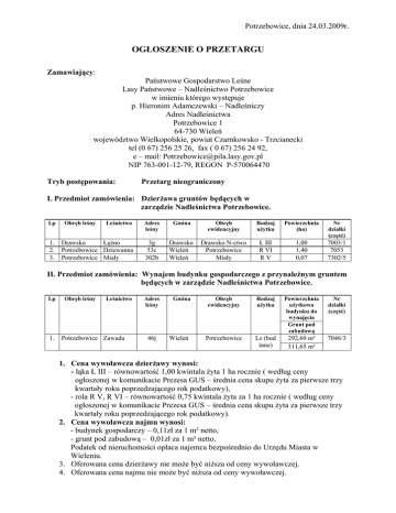 Potrzebowice, dnia 24.03.2009r. OGŁOSZENIE O PRZETARGU Zamawiający: Państwowe Gospodarstwo Leśne Lasy Państwowe – Nadleśnictwo Potrzebowice w imieniu którego występuje p. Hieronim Adamczewski – Nadleśniczy Adres Nadleśnictwa Potrzebowice 1 64-730 Wieleń województwo Wielkopolskie, powiat Czarnkowsko - Trzcianecki tel (0 67) 256 25 26, fax ( 0 67) 256 24 92, e – mail: [email protected] NIP 763-001-12-79, REGON P-570064470 Tryb postępowania: Przetarg nieograniczony I. Przedmiot zamówienia: Dzierżawa gruntów będących w zarządzie Nadleśnictwa Potrzebowice. Lp 1. 2. 3. Obręb leśny Leśnictwo Adres leśny Gmina Obręb ewidencyjny Rodzaj użytku Powierzchnia (ha) Nr działki (część) Drawsko Łężno Potrzebowice Dziewanna Potrzebowice Miały 3g 53c 302b Drawsko Wieleń Wieleń Drawsko N-ctwo Potrzebowice Miały Ł III R VI RV 1,00 1,40 0,07 7003/1 7053 7302/5 II. Przedmiot zamówienia: Wynajem budynku gospodarczego z przynależnym gruntem będących w zarządzie Nadleśnictwa Potrzebowice. Lp 1. Obręb leśny Leśnictwo Potrzebowice Zawada Adres leśny 46j Gmina Wieleń Obręb ewidencyjny Rodzaj użytku Powierzchnia użytkowa budynku do wynajęcia Grunt pod zabudową Nr działki (część) Potrzebowice Ls (bud inne) 292,60 m² 311,65 m² 7046/3 1. Cena wywoławcza dzierżawy wynosi: - łąka Ł III – równowartość 1,00 kwintala żyta 1 ha rocznie ( według ceny ogłoszonej w komunikacie Prezesa GUS – średnia cena skupu żyta za pierwsze trzy kwartały roku poprzedzającego rok podatkowy), - rola R V, R VI – równowartość 0,75 kwintala żyta za 1 ha rocznie ( według ceny ogłoszonej w komunikacie Prezesa GUS – średnia cena skupu żyta za pierwsze trzy kwartały roku poprzedzającego rok podatkowy). 2. Cena wywoławcza najmu wynosi: - budynek gospodarczy – 0,11zł za 1 m² netto, - grunt pod zabudową – 0,01zł za 1 m² netto. Podatek od nieruchomości opłaca najemca bezpośrednio do Urzędu Miasta w Wieleniu. 3. Oferowana cena dzierżawy nie może być niższa od ceny wywoławczej. 4. Oferowana cena najmu nie może być niższa od ceny wywoławczej. 5. Zapłata czynszu z góry, jednorazowa w terminie do końca miesiąca marca każdego roku. 6. Złożona oferta musi zawierać: I. Dzierżawa gruntów: a) nazwisko i imię oraz adres oferenta, b) oznaczenie gruntu którego dotyczy oferta, c) proponowana cenę (ilość kwintali żyta za 1 ha rocznie), d) proponowany okres dzierżawy, e) oświadczenie oferenta, że zapoznał się z przedmiotem przetargu. II. Wynajem budynku z przynależnym gruntem: a) nazwisko i imię oraz adres oferenta, b) oznaczenie gruntu którego dotyczy oferta, c) oznaczenie budynku którego dotyczy oferta, d) proponowana cenę za wynajem budynku rocznie, e) proponowana cenę za wynajem przynależnego gruntu rocznie, f) proponowany okres najmu, g) oświadczenie oferenta, że zapoznał się z przedmiotem przetargu. 7. Oferty należy składać w zamkniętych kopertach opisanych hasłem „ Oferta na dzierżawę i wynajem „ w sekretariacie Nadleśnictwa Potrzebowice, Potrzebowice 1, 64-730 Wieleń w terminie do dnia 08.04.2009r. do godz. 10ºº. 8. Otwarcie ofert nastąpi dnia 08.04.2009r. o godz. 10:15 w salce narad Nadleśnictwa Potrzebowice ( pokój nr 16 ). 9. Kryterium wyboru oferty - cena dzierżawy, najmu = 100 %. 10. Zamawiający nie wymaga wpłacenia wadium. 11. O wynikach przetargu, wszyscy uczestnicy zostaną powiadomieni pisemnie, niezwłocznie po rozstrzygnięciu przetargu. 12. W przypadku równorzędności złożonych ofert, Nadleśnictwo Potrzebowice przeprowadzi dodatkowy przetarg ustny. 13. Informacji na temat przetargu udziela Pan Stanisław Rembarz. 14. Nadleśnictwo Potrzebowice zastrzega sobie prawo odstąpienia od przeprowadzenia przetargu w całości lub jego części bez podania przyczyny, a także bez prawa zgłaszania protestów i odwołań. Podpisał: Nadleśniczy mgr inż. Hieronim Adamczewski
