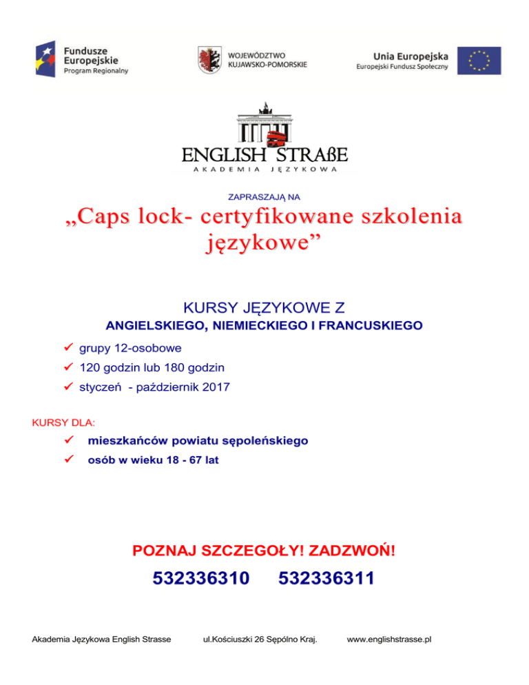 ZAPRASZAJĄ NA „Caps lock- certyfikowane szkolenia językowe” KURSY JĘZYKOWE Z ANGIELSKIEGO, NIEMIECKIEGO I FRANCUSKIEGO grupy 12-osobowe 120 godzin lub 180 godzin styczeń - październik 2017 KURSY DLA: mieszkańców powiatu sępoleńskiego osób w wieku 18 - 67 lat POZNAJ SZCZEGOŁY! ZADZWOŃ! 532336310 Akademia Językowa English Strasse 532336311 ul.Kościuszki 26 Sępólno Kraj. www.englishstrasse.pl