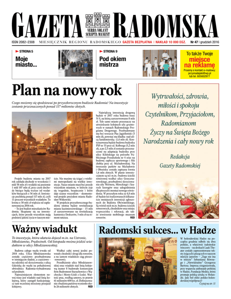 ISSN 2082–2308 M i e s i ę c z n i k R e g i o n u R a d o m s k i e g o GAZETA BEZPŁATNA | NAKŁAD 10 000 EGZ. STRONA 5 STRONA 9 Moje miasto... Pod okiem mistrza Plan na nowy rok Czego możemy się spodziewać po przyszłorocznym budżecie Radomia? Na inwestycje zostanie przeznaczonych ponad 117 milionów złotych. Projekt budżetu miasta na 2017 rok zakłada dochody w wysokości 1 mld 58 mln zł i wydatki na poziomie 1 mld 107 mln zł, przy czym dochody bieżące będą wyższe od wydatków bieżących o 56 mln zł. Inwestycje pochłoną ponad 117 mln zł, czyli 11 procent wszystkich wydatków. To kwota o 30 mln zł większa od zaplanowanej na 2016 rok. – To jest budżet mieszkańców Radomia. Skupiamy się na inwestycjach, które przede wszystkim mają podnieść jakość życia w naszym mie- ście. Nie musimy się ścigać z wielkimi metropoliami na wielkie inwestycje. Nasze miasto musi być przede wszystkim miastem, w którym żyje się wygodnie, bezpiecznie i które daje szanse wszystkim – skomentował projekt prezydent miasta Radosław Witkowski. W projekcie przyszłorocznego budżetu istotna będzie rewitalizacja miasta kazimierzowskiego - 15 mln zł zarezerwowano na rewitalizację kamienicy Deskurów, 5 mln zł na remont ratusza. Ważny wiadukt To inwestycja, która ułatwia dojazd m.in. na Ustronie, Młodzianów, Prędocinek. Od listopada można jeździć wiaduktem w ulicy Młodzianowskiej. Budowa całego węzła trwała od 2014 roku. Ulica Młodzianowska została częściowo przebudowana w istniejącym śladzie, a częściowo na odcinku od skrzyżowania z ulicą Gdyńską do węzła na południowej obwodnicy Radomia-wybudowana od podstaw. Najważniejszym elementem nowej trasy jest wiadukt nad linią kolejową, który zastąpił funkcjonujący tam wcześniej strzeżony przejazd kolejowy. Wzdłuż całej nowej jezdni powstały chodniki i drogi dla rowerów, a na samym wiadukcie ciąg pieszo-rowerowy. Przedłużenie ulicy Młodzianowskiej oraz wiadukt nad linią kolejową numer 8 budowało konsorcjum firm Budromost-Starachowice z Wąchocka i Mosty-Łódź z Łodzi. Wartość prac, według umowy, to prawie 61 milionów 600 tys. zł. Dofinasowanie z budżetu państwa wyniosło około 26 milionów złotych. RED Największą inwestycją drogową będzie w 2017 roku budowa trasy N-S, na którą zarezerwowano 8 mln zł. Tyle samo miasto przeznaczy na utwardzanie kolejnych ulic gruntowych w ramach Radomskiego Programu Drogowego. Przebudowany ma być wreszcie Plac Jagielloński (3 mln zł), powstać ma kładka nad ulicą Sandomierską (1,4 mln zł). Kontynuowana będzie budowa budynku PSP nr 33 przy ul. Kolberga (5,2 mln zł), a po 2,5 mln zł zostanie przeznaczone na adaptację budynku przy ulicy Kilińskiego na potrzeby Publicznego Przedszkola nr 4 oraz na budowę zaplecza sportowego i filii żłobka przy ul. Michałowskiej. Na tworzenie parków na Michałowie i Obozisku została zapisana kwota 1,6 mln złotych. W planie inwestycyjnym są też m.in.: budowa ścieżki rowerowej wzdłuż ulicy Grzecznarowskiego, przebudowa skrzyżowania ulic Wernera, Mireckiego i Szarych Szeregów oraz udogodnienia dla pieszych i montaż nowego oświetlenia. W przyszłym roku za 4,8 mln zł będzie też realizowanych kilkanaście mniejszych inwestycji zgłoszonych do Budżetu Obywatelskiego. Są wśród nich m.in. budowa ścieżek rowerowych, chodników oraz miejsc wypoczynku i rekreacji, ale także stworzenie mobilnego muzeum rowerów. RED Nr 47 | grudzień 2016 To także Twoje miejsce na reklamę Prosimy o kontakt e-mailowy: [email protected] lub tel. 605602977 Wytrwałości, zdrowia, miłości i spokoju Czytelnikom, Przyjaciołom, Radomianom Życzy na Święta Bożego Narodzenia i cały nowy rok Redakcja Gazety Radomskiej Radomski sukces... w Hadze W holenderskiej Hadze na początku grudnia odbyły się dwa polskie, a właściwie radomskie wieczory - na deskach Laak Theater zostały zaprezentowane teksty żyjących i piszących w naszym mieście autorów – „Tego nie ma w tekście” Sebastiana Równego i „Niewidzialny” Grzegorza Bartosa. Imprezę zorganizowała, przy wsparciu ambasady polskiej w Hadze, Fundacja Medea, która promuje polską sztukę w Holandii. Jaki był efekt polsko-holenderskiej współpracy? Czytaj na str. 11 2 AKTUALNOŚCI OD REDAKCJI Z RÓŻNYCH STRON Dla rowerzystów Pod koniec października, podczas V Kongresu Transportu Publicznego, wiceprezydent miasta Konrad Frysztak odebrał nagrodę przyznaną Miastu Radom za dostosowanie infrastruktury prowadzonej na cmentarzu rzymskokatolickim przy ul. Limanowskiego. Jak co roku zorganizował ją przy okazji Dnia Wszystkich Świętych, Społeczny Komitet Ochrony Zabytkowego Cmentarza Rzymskokatolickiego. Pieniądze na renowację starych nagrobków zbie- Wsola, 26-660 Jedlińsk, z dopiskiem: „Nagroda”. Prawidłowe zgłoszenie powinno zawierać 8 egzemplarzy książki, imię i nazwisko autora, tytuł książki, nazwę, adres i dane kontaktowe (w tym nr telefonu) osoby lub instytucji zgłaszającej. W czerwcu 2017 r. kapituła ogłosi pięcioro nominowanych, we wrześniu odbędzie się finał nagrody i ogłoszenie laureata. W pierwszej edycji kapituła podzieliła nagrodę pomiędzy dwoje laureatów. Zostali nimi: Weronika Murek za zbiór opowiadań: „Uprawa roślin południowych metodą Miczurina” oraz Maciej Hen za powieść: „Solfatara”. 25 stypendiów do potrzeb rowerzystów. Podkreślał, że wyróżnienie jest efektem współpracy miasta z Bractwem Rowerowym. Odbierając tę nagrodę wiceprezydent podkreślił dobrą współpracę z Bractwem Rowerowym. - To także dzięki ciężkiej pracy bractwa, wytyczaniu pewnych kierunków, opiniowaniu decyzji podejmowanych przez Miejski Zarząd Dróg i Komunikacji, otrzymujemy w radomiu infrastrukturę dedykowaną, która spełnia oczekiwania rowerzystów – stwierdził. Przypomnijmy, że dzięki projektowi Bractwa Rowerowego złożonego do Budżetu Obywatelskiego oraz