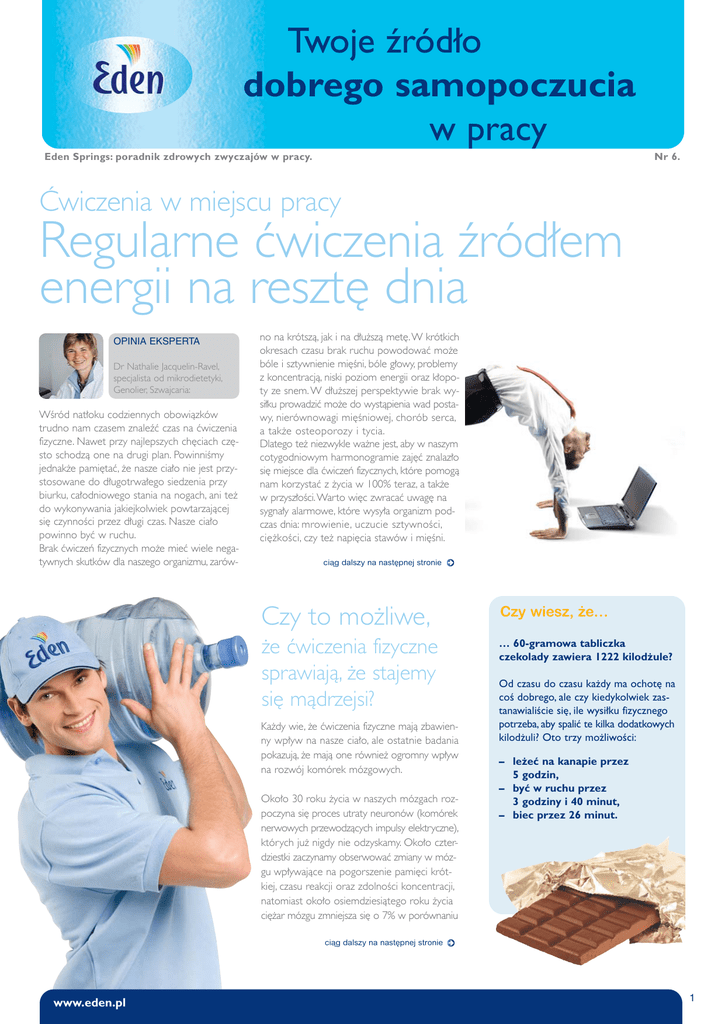 Twoje źródło dobrego samopoczucia w pracy Eden Springs: poradnik zdrowych zwyczajów w pracy. Nr 6. Ćwiczenia w miejscu pracy Regularne ćwiczenia źródłem energii na resztę dnia OPINIA EKSPERTA Dr Nathalie Jacquelin-Ravel, specjalista od mikrodietetyki, Genolier, Szwajcaria: Wśród natłoku codziennych obowiązków trudno nam czasem znaleźć czas na ćwiczenia fizyczne. Nawet przy najlepszych chęciach często schodzą one na drugi plan. Powinniśmy jednakże pamiętać, że nasze ciało nie jest przystosowane do długotrwałego siedzenia przy biurku, całodniowego stania na nogach, ani też do wykonywania jakiejkolwiek powtarzającej się czynności przez długi czas. Nasze ciało powinno być w ruchu. Brak ćwiczeń fizycznych może mieć wiele negatywnych skutków dla naszego organizmu, zarów- no na krótszą, jak i na dłuższą metę. W krótkich okresach czasu brak ruchu powodować może bóle i sztywnienie mięśni, bóle głowy, problemy z koncentracją, niski poziom energii oraz kłopoty ze snem. W dłuższej perspektywie brak wysiłku prowadzić może do wystąpienia wad postawy, nierównowagi mięśniowej, chorób serca, a także osteoporozy i tycia. Dlatego też niezwykle ważne jest, aby w naszym cotygodniowym harmonogramie zajęć znalazło się miejsce dla ćwiczeń fizycznych, które pomogą nam korzystać z życia w 100% teraz, a także w przyszłości.Warto więc zwracać uwagę na sygnały alarmowe, które wysyła organizm podczas dnia: mrowienie, uczucie sztywności, ciężkości, czy też napięcia stawów i mięśni. ciàg dalszy na nast´pnej stronie Czy to możliwe, Czy wiesz, ˝e… że ćwiczenia fizyczne sprawiają, że stajemy się mądrzejsi? … 60-gramowa tabliczka czekolady zawiera 1222 kilodżule? Każdy wie, że ćwiczenia fizyczne mają zbawienny wpływ na nasze ciało, ale ostatnie badania pokazują, że mają one również ogromny wpływ na rozwój komórek mózgowych. Około 30 roku życia w naszych mózgach rozpoczyna się proces utraty neuronów (komórek nerwowych przewodzących impulsy elektryczne), których już nigdy nie odzyskamy. Około czterdziestki zaczynamy obserwować zmiany w mózgu wpływające na pogorszenie pamięci krótkiej, czasu reakcji oraz zdolności koncentracji, natomiast około osiemdziesiątego roku życia ciężar mózgu zmniejsza się o 7% w porównaniu Od czasu do czasu każdy ma ochotę na coś dobrego, ale czy kiedykolwiek zastanawialiście się, ile wysiłku fizycznego potrzeba, aby spalić te kilka dodatkowych kilodżuli? Oto trzy możliwości: – leżeć na kanapie przez 5 godzin, – być w ruchu przez 3 godziny i 40 minut, – biec przez 26 minut. ciàg dalszy na nast´pnej stronie www.eden.pl 1 Twoje źródło dobrego samopoczucia w pracy Eden Springs: poradnik zdrowych zwyczajów w pracy. Czy to możliwe, że ćwiczenia fizyczne sprawiają, że stajemy się mądrzejsi? z poprzedniej strony ze stanem tego organu w kwiecie wieku. Regularne ćwiczenia fizyczne pozwalają uniknąć niektórych umysłowych skutków starzenia się dzięki zwiększeniu ilości krwi doprowadzanej do płatów czołowych mózgu. Płaty czołowe są częściowo odpowiedzialne za naszą zdolność do planowania i podziału uwagi na poszczególne zadania.Wraz z wiekiem ich stan ulega pogorszeniu – dużo bardziej niż w przypadku innych części mózgu. Praca wymaga od nas zwykle radzenia sobie z kilkoma zadaniami w tym samym czasie – ćwiczenia fizyczne pozwalają nam radzić sobie z takimi sytuacjami zarówno pod względem fizycznym, jak i umysłowym. Nr 6. Ćwiczenia w miejscu pracy Regularne ćwiczenia źródłem energii na resztę dnia z poprzedniej strony Jeśli masz problemy ze znalezieniem czasu na regularne ćwiczenia, spróbuj robić to podczas przerw w pracy! Dowolna ilość wysiłku fizycznego, nawet podczas przerwy na lunch lub kawę, spowoduje polepszenie kondycji fizycznej i umysłowej organizmu, jak również sprawi, że będziemy pracować wydajniej, nasze umysły będą czujniejsze, a przy tym ograniczy prawdopodobieństwo wystąpienia poważnych chorób. Oto kilka pomysłów na to, jak zmotywować się do ćwiczeń fizycznych w ciągu dnia. • Idź na spacer lub przebiegnij się podczas przerwy w pracy. Każdego dnia wybieraj inna trasę, dzięki czemu unikniesz znudzenia, lub weź ze sobą kolegę lub koleżankę, abyś miał z kim porozmawiać podczas spaceru. • Zamiast jechać windą, idź po schodach. Jeśli uważasz, że masz do przebycia zbyt wiele pięter, wyjdź z windy kilka pięter wcześniej i przejdź brakujący dystans piechotą. • Zamiast korzystać z telefonu lub wysłać e-maila do kogoś w miejscu pracy, wstań i doręcz taką wiadomość osobiście. • Zapisz się na siłownię, zajęcia jogi, aerobiku itp. blisko miejsca pracy, tak abyś mógł chodzić tam podczas przerwy na lunch lub po pracy. Znajdź osobę, która do ciebie dołączy, co pozwoli wam motywować się nawzajem, kiedy nie będzie chciało się wam iść. • Jeśli pracujesz daleko, poproś szefa o udostępnienie sprzętu do ćwiczeń w miejscu pracy, tak abyś mógł ćwiczyć podczas przerw, np. na bieżni lub row erze treningowym. • Jeśli korzystasz ze środków transportu publicznego, wysiądź kilka przystanków wcześniej, lub jeśli jeździsz samochodem, zaparkuj trochę dalej i zrób sobie spacer do pracy. Najlepszy sposób, aby utrzymać ćwiczenia fizyczne na pierwszym miejscu listy priorytetów, to przywyknąć do traktowania ich jak każdego innego obowiązku. Zapisuj daty ćwiczeń w terminarzu i trzymaj się ich zawsze (chyba, że wystąpią okoliczności łagodzące). Poświęć część dnia na aktywność fizyczną, co pozwoli poprawić ogólny stan twojego zdrowia, poziom sprawności fizycznej, oraz sprawność umysłową! Czy wiesz, e… Nie masz czasu na ćwiczenia? Spróbuj chodzić po schodach! Naukowcy nakłonili 12 kobiet prowadzących siedzący tryb życia do codziennego pokonywania schodam