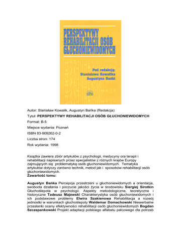 Autor: Stanisław Kowalik, Augustyn Bańka (Redakcja) Tytuł: PERSPEKTYWY REHABILITACJI OSÓB GŁUCHONIEWIDOMYCH Format: B-5 Miejsce wydania: Poznań ISBN 83-909262-0-2 Liczba stron: 174 Rok wydania: 1998 Książka zawiera zbiór artykułów z psychologii, medycyny ora terapii i rehabilitacji napisanych przez specjalistów z różnych krajów Europy zajmujących się problematyką osób głuchoniewidomych. Tematyka artykułów dotyczy zarówno technik, metod jak i sposobów rehabilitacji osób głuchoniewidomych. Zawartość tomu: Augustyn Bańka Percepcja przestrzeni u głuchoniewidomych a orientacja, swoboda działania i poczucie jakości życia w środowisku Siergiej Sirotkin Głuchoślepota w psychologii. Aspekty metodologiczne, teoretyczne i historyczne Tadeusz Majewski Charakterystyka osób głuchoniewidomych i ich podstawowe problemy Elwira Szakienowa Rehabilitacja a rozwój jednostki w warunkach głuchoślepoty Waldemar Domachowski Niewerbalne przesłanki oceny efektywności rehabilitacji osób głuchoniewidomych Bogdan Szczepankowski Projekt adaptacji polskiego alfabetu palcowego dla potrzeb osób głuchoniewidomych Witold Szyfler, Joanna Łgczkowska-Przybylska, Jakub Pazdrowski Zastosowanie wszczepu ślimakowego w wybranej grupie osób głuchoniewidomych Barbara Dobrzańska-Socha Pomoc psychologiczna dla rodzin osób głuchoniewidomych Ewa Skrzetuska Wykorzystanie treningów niemowlęcia do nawiązania kontaktu z dzieckiem głuchoniewidomym we wczesnym okresie jego rozwoju Marzenna Zaorska Rewalidacja indywidualna głuchoniewidomych dzieci w wieku przedszkolnym Urszula Chudoba Przebieg rehabilitacji dziecka słabowidzącego-głuchego Piotra M. Marzenna Zaorska, Stanisław Szymelfenig O kierunkach działalności Sekcji Rodziców Dzieci Głuchoniewidomych przy PTG Władysław Dykcik Problemy kształcenia kadr dla potrzeb rehabilitacji osób głuchoniewidomych Stanisław Kowalik Subiektywny świat problemów osób pozbawionych wzroku i słuchu. Wyniki pewnego eksperymentu symulacyjnego. Autor: Karol Orłowski Tytuł: ZASTOSOWANIE PAKIETU STATISTICA W ANALIZIE WYNIKÓW BADAŃ SPOŁECZNYCH Format: B-5 Miejsce wydania: Poznań ISBN 83-916521-0-6 Liczba stron: 130 Rok wydania: 2001 Książka przedstawia zastosowanie pakietu STATISTICA w analizie badań społecznych i psychologicznych. W sposób przystępny pokazuje podstawowe kroki, jakie musi wykonać badacz w procedurze empirycznej i kolejne kroki obliczeniowe, jakie powinien i może wykonać, by uzyskać wartościowe rezultaty. Autor: Katarzyna Popiołek (Redakcja) Tytuł: CZŁOWIEK W SYTUACJI ZAGROŻENIA. KRYZYSY, KATASTROFY, KATAKLIZMY (TOM 1) Format: B-5 Miejsce wydania: Poznań ISBN 83-909262-2-9 Liczba stron: 354 Rok wydania: 2001 Książka obejmuje zbiór 23 atrykułów empirycznych i teoretycznych na temat katastrof, kataklizmów oraz kryzysów. Problematyka ta jest analizowana zarówno od strony reakcji psychologicznych, jak i społecznych. Zawartość tomu: Zofia Ratajczak Oblicza ludzkiej zaradności Dariusz Doliński Ciemna strona optymistycznych iluzji Zbigniew Spendel Podmiotowość jednostki a katastrofa psychologiczna Maryla Goszczyńska Czy Polacy chcą być mądrzy przed szkodą czyli o podejmowaniu decyzji ubezpieczeniowych Maria Kliś Mechanizm międzypokoleniowej transmisji przemocy przejawianej wobec rodziny Danuta Rode w pułapce destruktywnych przekonań czyli o „zaprogramowaniu na życie we dwoje, za wszelką cenę” Hanna PrzybyłaBasista Decyzja o podjęciu mediacji w sytuacji kryzysu rozwodowego Justyna Trepka-Starosta, Bernadetta Izydorczyk Kryzys wieku średniego i jego wpływ na pełnienie ról społecznych Mieczysław Plopa Z badań nad lękiem marynarzy w warunkach rejsu dalekomorskiego Irena Pilch, Renata Rosmus Lekarze wobec reformy służby zdrowia reforma czy katastrofa? Joanna Różańska-Kowal Sytuacje kryzysowe w pracy zawodowej i życiu prywatnym psychologów Krystyna Surowiec Radzenie sobie ze stresem w sytuacjach zagrożeń górniczych Agnieszka Pietrzyk Diagnoza: nowotwór złośliwy – jak z tym żyć? Czy tak postawione pytanie może stać się pytaniem naukowym? Wiesław Błaszczak Kryzys wywołany doświadczeniem realnego zagrożenia życia jako szansa rozwoju Barbara Dobrzańska-Socha Trudne rozmowy – wyobrażenie sytuacji własnej śmierci Renata Kleszcz-Szczyrba Dynamika wsparcia w okresie żałoby u kobiet po staracie współmałżonka Jakub Kołodziej Sposoby przeżywania kryzysu jako źródło zagrożenia życia ludzkiego. Badania młodzieży po próbach samobójczych Anna Wolska Zabójstwo – różne oblicza zagrożeń Tomasz Maruszewski, Anna Maria Stawiska Pamięć autobiograficzna po traumie Ryszard Studenski Zarządzanie bezpieczeństwem w sytuacji zagrożenia katastrofą lub kataklizmem Ryszard Makarowski Czynnik ludzki w katastrofach i wypadkach lotniczych w lotnictwie cywilnym w Polsce w latach 1990-1999 Barbara Dolińska Łyżka miodu w beczce dziegciu, czyli o tym co dobrego może wyniknąć z przeżycia kataklizmu Katarzyna Popiołek Deficyty wsparcia społecznego w sytuacji klęski żywiołowej Autor: Irena Heszen-Niejodek (Redakcja) Tytuł: TEORETYCZNE I KLINICZNE PROBLEMY RADZENIA SOBIE ZE STRESEM Format: B-5 Miejsce wydania: Poznań ISBN 83-916521-5-7 Liczba stron: 197 Rok wydania: 2001 Praca zawiera 8 artykułów poświęconych teoretycznym i klinicznym problemom stresu oraz sposobu radzenia sobie. Omawiane są różne rodzaje stresu, mechanizmy powstawania i zwalczania zjawiska. Zawartość tomu: Helena Sęk Potoczna wiedza o stresie a naukowe koncepcje stresu i radzenia sobie Zofia Ratajczak Stres przeklęty – stres błogosławiony. O psychologicznych mechanizmach zaradności w sytuacjach zagrożenia Tadeusz Marian Ostrowski Motywacja noetyczna w psychologicznej koncepcji radzenia sobie ze stresem Dorota Kubacka-Jasiecka Od stresu do kryzysu – kryzys emocjonalny jako zagrożenie tożsamości Kazimierz Wrześniewski, Małgorzata Guzowska Mechanizm obro