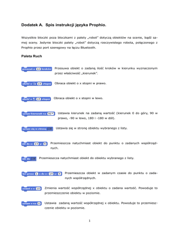 Dodatek A. Spis instrukcji języka Prophio. Wszystkie bloczki poza bloczkami z palety „robot” dotyczą obiektów na scenie, bądź samej sceny. Jedynie bloczki palety „robot” dotyczą rzeczywistego robota, połączonego z Prophio przez port szeregowy na łączu Bluetooth. Paleta Ruch Przesuwa obiekt o zadaną ilość kroków w kierunku wyznaczonym przez właściwość „kierunek”. Obraca obiekt o x stopni w prawo. Obraca obiekt o x stopni w lewo. Ustawia kierunek na zadaną wartość (kierunek 0 do góry, 90 w prawo, -90 w lewo, 180 i -180 w dół). Ustawia się w stronę obiektu wybranego z listy. Przemieszcza natychmiast obiekt do punktu o zadanych współrzędnych. Przemieszcza natychmiast obiekt do obiektu wybranego z listy. Przemieszcza obiekt w zadanym czasie do punktu o zadanych współrzędnych. Zmienia wartość współrzędnej x obiektu o zadana wartość. Powoduje to przemieszczenie obiektu w poziomie. Ustawia zadaną wartość współrzędnej x obiektu. Powoduje to przemieszczenie obiektu w poziomie. 1 Zmienia wartość współrzędnej y obiektu o zadana wartość. Powoduje to przemieszczenie obiektu w pionie. Ustawia zadaną wartość współrzędnej y obiektu. Powoduje to przemieszczenie obiektu w pionie. Po osiągnięciu krawędzi sceny poruszający się obiekt odbija się od niej, zgodnie z zasadą równości kątów padania i odbicia. Funkcja zwracająca wartość współrzędnej x obiektu. Funkcja zwracająca wartość współrzędnej y obiektu. Funkcja zwracająca wartość właściwości „kierunek” obiektu. Paleta Wygląd Zmienia kostium obiektu na kostium wybrany z listy. Na liście wyboru dostępne są kostiumy zaimportowane wcześniej w zakładce „kostiumy”. Zmienia kostium obiektu na kolejny kostium z listy zaimportowanych wcześniej w zakładce „kostiumy”. Funkcja zwracająca wartość właściwości „kostium” obiektu ( numer kostiumu). Wyświetla zadany tekst w dymku przez zadany czas. Wyświetla zadany tekst w dymku. Zadanie pustego tekstu kasuje dymek. Wyświetla zadany tekst w dymku przez zadany czas. Wyświetla zadany tekst w dymku. Zadanie pustego tekstu kasuje dymek”. Zmienia wybrany z listy efekt graficzny obiektu o zadaną wartość. Ustawia wybrany z listy efekt graficzny obiektu na zadaną wartość. Przywraca pierwotny wygląd obiektu – anuluje wszystkie zastosowane efekty graficzne. Zmienia własciwość „rozmiar” obiektu o zadaną wartość. Ustawia rozmiar obiektu na zadaną wartość wyrażoną w % rozmiaru oryginalnego (100%). Funkcja zwracająca wartość właściwości „rozmiar” obiektu, wyrażoną w % rozmiaru oryginalnego. Pokazuje (wyświetla) obiekt na scenie. Ukrywa obiekt na scenie (obiekt nadal istnieje ale jest niewidoczny, jego skrypt działa). Przesuwa obiekt na pierwszy plan, przed wszystkimi innymi obiektami. Przesuwa obiekt na dalszy plan o zadana liczbę poziomów. Paleta Dźwięk Graj dźwięk wybrany z listy i przejdź natychmiast do kolejnego bloczka. Graj dźwięk wybrany z listy i poczekaj na jego zakończenie. Zatrzymaj odtwarzanie wszystkie dźwięków. 3 Graj dźwięk bęben ... przez ...taktów. Pauzuj przez … taktów . Graj wybraną z listy nutę przez … taktów (im większa wartość tym wyższy dźwięk). Ustawia instrument na wybrany z listy (aktualnie wybrany instrument używany jest przez instrukcję „graj nutę”). Zmienia głośność o zadaną wartość. Ustawia głośność na zadaną wartość (max. 100%). Funkcja zwracająca aktualną wartość właściwości „głośność” obiektu. Zmienia tempo o zadaną wartość. Ustawia tempo na zadaną wartość. Funkcja zwracająca aktualną wartość właściwości „tempo” obiektu. Paleta Pisak Czyści scenę ze wszystkich elementów stworzonych pisakiem i stemplem. Opuszcza pisak w miejsce aktualnych współrzędnych obiektu. opuszczonym pisakiem poruszając się będzie zostawiać ślad. Podnosi pisak. Obiekt z Ustawia kolor pisaka na kolor wybrany z listy. Zmienia kolor pisaka o zadaną wartość. Ustawia kolor pisaka na zadaną wartość w granicach od 0 (czerwony) do 100 (niebieski). Zmienia odcień pisaka o zadaną wartość. Ustawia odcień pisaka na zadaną wartość w granicach od 0 (ciemny) do 100 (jasny). Zmienia rozmiar pisaka o zadaną wartość. Ustawia rozmiar pisaka na zadaną wartość. Stempluje scenę obrazem obiektu. Paleta Robot Uruchamia wybrany silnik z zadaną prędkością (0100). Prędkość równa 0 zatrzymuje silnik. Ujemna wartość prędkości zmienia kierunek obrotów. Uruchamia wybrany silnik z zadaną prędkością i liczbą obrotów. Po uruchomieniu silnika(-ów) program przechodzi natychmiast do kolejnego bloczka. Uruchamia wybrany silnik z zadaną prędkością i liczbą obrotów. Program czeka aż wybrany silnik wykona zadaną liczbę obrotów. 5 Funkcja zwracająca wartość napięcia na wybranym wejściu sterownika. Może współpracować z czujnikami z wyjściem napięciowym 0-5V. Funkcja zwracająca odległość (w cm) z dalmierza SHARP GP2Y0A21 podłączonego do wybranego wejścia sterownika. Funkcja logiczna zwracająca wartość PRAWDA gdy wybrane wejście jest w stanie wysokim. Do współpracy z czujnikami o wyjściach cyfrowych. Funkcja logiczna zwracająca wartość PRAWDA gdy wybrane wejście jest w stanie niskim. Do współpracy z czujnikami o wyjściach cyfrowych. Funkcja logiczna zwracająca wartość PRAWDA jeżeli wybrany silnik osiągnął pozycję, czyli wykonał zadaną wcześniej liczbę obrotów. Paleta Kontrola Uruchamia skrypt po kliknięciu zielonej flagi Uruchamia skrypt po wciśnięciu wybranego klawisza Uruchamia skrypt po kliknięciu obiektu Wstrzymuje wykonywanie skryptu przez zadany czas Powtarza w nieskończoność instrukcje umieszczone wewnątrz pętli Wykonuje zadaną liczbę powtórzeń instrukcji umieszczonych wewnątrz pętli Wysyła do wszystkich obiektów komunikat o wybranej, wcześniej zdefiniowanej treści. Wysyła do wszystkich obiektów