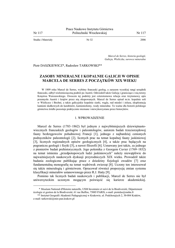 Nr 117 Studia i Materiały Prace Naukowe Instytutu Górnictwa Politechniki Wrocławskiej Nr 117 Nr 32 2006 Marcel de Serres, historia geologii, Galicja, Wieliczka, surowce mineralne Piotr DASZKIEWICZ*, Radosław TARKOWSKI** ZASOBY MINERALNE I KOPALNIE GALICJI W OPISIE MARCELA DE SERRES Z POCZĄTKÓW XIX WIEKU W 1809 roku Marcel de Serres, wybitny francuski geolog, a zarazem wysokiej rangi urzędnik francuski, odbył wielomiesięczną podróż po Austrii. Odwiedził także Galicję i graniczące z nią tereny Księstwa Warszawskiego. Owocem tej podróży jest czterotomowa relacja oraz trzytomowy opis przemysłu Austrii i krajów przez nią okupowanych. Marcel de Serres opisał m.in. kopalnie soli w Wieliczce i Bochni, a także galicyjskie kopalnie siarki, węgla, rud miedzi i żelaza, eksploatację kamieni skałkowych do karabinów, kamieniołomy, wody mineralne. To ważne dla historii polskiego górnictwa źródło pozostaje praktycznie nieznane i niewykorzystane przez historyków. 1. WPROWADZENIE Marcel de Serres (1783–1862) był jednym z najwybitniejszych dziewiętnastowiecznych francuskich geologów i paleontologów, autorem badań trzeciorzędowej fauny bezkręgowców południowej Francji [1], jednego z najbardziej cenionych podręczników paleontologii [2], licznych prac na temat kopalnej fauny jaskiniowej [3], licznych regionalnych opisów geologicznych [4], a także prac będących na pograniczu geologii i fizyki [5], a nawet filozofii [6]. Uznawany jest także, za jednego z pionierów badań prehistorycznych. Jego polemika z Georgem Cuvier (1769–1832) na temat istnienia „przedpotopowych ludzi jaskiniowych” należy niewątpliwie do najważniejszych naukowych dyskusji przyrodniczych XIX wieku. Prowadził także badania zoologiczne publikując prace z dziedziny fizjologii owadów [7] oraz fundamentalną monografię na temat wędrówek zwierząt [8]. Uczony ten interesował się także mineralogią i górnictwem. Opracował również propozycję zmian systemu klasyfikacji minerałów ustanowionego przez R.J. Haüy [9]. Pomimo tak licznych badań naukowych i publikacji, Marcel de Serres nie był uniwersyteckim uczonym mogącym poświęcić się karierze akademickiej. * Muséum National d'Histoire naturelle, USM Inventaire et suivi de la Biodiversité, Département écologie et gestion de la Biodiversité, 61 rue Buffon, 75005 PARIS, e-mail: [email protected] ** Instytut Geografii Akademii Pedagogicznej w Krakowie, ul. Podchorążych 2, 30-084 Kraków, e-mail: [email protected] 32 Z wykształcenia prawnik, był także wysokiej rangi urzędnikiem państwowym, szczególnie cenionym w okresie napoleońskim. Nic dziwnego, że właśnie jemu powierzano odbywanie podróży uznawanych za szczególnie ważne dla francuskich interesów państwowych. W okresie francuskiej okupacji Austrii, Marcel de Serres odbył podróż po tym kraju. Owocem tej pracy jest czterotomowa relacja z podróży [10] jak i trzytomowy opis przemysłu Austrii [11], traktowanej przecież przez Francję jako jedno z najbardziej niebezpiecznych pod względem militarnym i politycznym wrogich im państw. W trakcie swojej podróży Marcel de Serres odwiedził także Galicję i przygraniczne tereny Księstwa Warszawskiego. W jego relacji znalazł się także opis przemysłu części Polski znajdującej się pod austriackim zaborem. Zważywszy na wojenny okres i cel podróży Marcela de Serres łatwo zrozumieć, że surowce uznawane za strategiczne wzbudzały szczególnie duże zainteresowanie francuskiego podróżnika. Z jednej strony była to oczywiście sól eksploatowana w Wieliczce, a także surowce używane dla produkcji wojskowej: kamienie skałkowe, siarka, żelazo. 2. WIZYTA W WIELICZCE Kopalnia w Wieliczce była znana we Francji na długo przed podróżą Marcela de Serres. Odwiedziło i opisało ją kilku francuskich uczonych i inżynierów [12]. Kopalnia interesowała francuskich uczonych i inżynierów zarówno z naukowego jak i polityczno-ekonomicznego punktu widzenia. Choć Francja nie była w tym okresie zależna od importu soli, odsalanie wody morskiej dawało jej bowiem samowystarczalność, zdawano sobie powszechnie sprawę z ekonomicznego i politycznego znaczenia kopalni w Wieliczce. Francja sama stosowała politykę zróżnicowanych cen soli jako środek nacisku na kraje skazane na import tego surowca. Po rozbiorze Polski, Wieliczka stała się własnością Austrii, jednego z tradycyjnych przeciwników Francji i pozostała nią, z wyjątkiem krótkiego okresu istnienia Księstwa Warszawskiego, przez cały XIX wiek. Opis złóż i kopalni soli w Wieliczce jest najważniejszą częścią dotyczących Polski fragmentów relacji Marcela de Serres, który zwiedził ją w bardzo dobrym dla francuskich podróżników, z politycznego punktu widzenia, okresie. Francuscy przyrodnicy odwiedzali Wieliczkę zarówno przed, jak i po upadku Rzeczypospolitej. Berniard był zapewne pierwszym zachodnioeuropejskim uczonym, który odwiedził Wieliczkę po tym jak kopalnia, w rezultacie pierwszego rozbioru Polski dostała się pod austriacką okupację. Jak wielu późniejszych autorów pisał o administracyjnych utrudnieniach na jakie napotykali cudzoziemcy pragnący odwiedzić Wieliczkę przypominając, że w czasach Rzeczypospolitej wystarczyło cudzoziemcowi stawić się przy bramie kopalni aby gościnnie ułatwiono mu wejście i zwiedzane. Po rozbiorach, aby odwiedzić kopalnię koniecznym było uzyskanie zezwolenia wydawanego przez radcę górniczego „jego cesarsko-królewskiej mości”. 33 Zakazanym było sporządzanie planów i szkiców. Szpiegomania i tak bardzo dziwiąca Francuzów, paranoiczna wręcz podejrzliwość wobec cudzoziemców, opisywana zresztą także przez Stanisława Staszica przy okazji zwiedzania Wiednia, niewątpliwie utrudniała uzyskiwanie wiarygodnych danych na temat wielickich złóż. Zezwolenie wydawane przez radcę górniczego było następnie kontrolowane przez górniczą straż. W