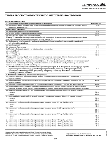 TABELA PROCENTOWEGO TRWAŁEGO USZCZERBKU NA ZDROWIU Compensa Towarzystwo Ubezpieczeń S.A. Vienna Insurance Group KRS 6691, Sąd Rejonowy dla m.st. Warszawy, XII Wydzia∏ Gospodarczy KRS, NIP 526 02 14 686, Kapita∏ zak∏adowy: 179 851 957,00 z∏ – op∏acony w ca∏ości Al. Jerozolimskie 162, 02-342 Warszawa Compensa Kontakt: +48 22 501 61 00, 801 120 000 1/17 05.09.2012 USZKODZENIA GŁOWY 1. Uszkodzenie powłok czaszki (bez uszkodzeń kostnych): Wskaźnik % a) uszkodzenia tkanek miękkich (rany, blizny w obrębie owłosionej skóry głowy w zależności od rozmiaru, stopnia 1-10 oszpecenia, bolesności, itp.) Utrata skóry owłosionej : 1-10 b) poniżej 25% powierzchni skóry owłosionej c) od 25% do 75% powierzchni skóry owłosionej 11-20 d) powyżej 75% powierzchni skóry owłosionej 21-30 Uwaga: W przypadku skutecznej replantacji skalpu lub uzupełnienia ubytku skóry owłosionej przeszczepem skóry oraz odtworzenia własnego owłosienia należy oceniać wg poz. 1a 2. Uszkodzenia kości sklepienia i podstawy czaszki (wgłobienia, szczeliny, fragmentacja) w zależności od rozległości uszkodzeń: a) szczeliny złamań 1-5 b) wgłobienia, fragmentacja 1-10 3. Ubytek w kościach czaszki – w zależności od rozmiarów: a) poniżej 10 cm2 1-10 b) od 10 do 50 cm2 11-15 c) powyżej 50 cm2 16-25 Uwaga: Jeżeli powstały ubytek kości został uzupełniony operacją plastyczną z dobrym efektem, odsetek trwałego uszczerbku na zdrowiu, oceniony wg poniższej zasady, należy zmniejszyć o połowę. Jeżeli przy uszkodzeniach i ubytkach kości czaszki (poz.2 i 3) występują jednocześnie uszkodzenia powłok czaszki (poz.1) należy osobno oceniać stopień trwałego uszczerbku na zdrowiu za uszkodzenia lub ubytki kości wg poz. 2 lub 3 i osobno za uszkodzenia powłok czaszki wg poz.1. 4. Powikłania towarzyszące uszkodzeniom wymienionym w poz. 1, 2, 3 w postaci: nawracającego wycieku płynu mózgowo-rdzeniowego, przewlekłego zapalenia kości, ropowicy podczepcowej leczonej 1-15 operacyjnie, zakrzepicy powłok, przepukliny mózgowej – ocenia się dodatkowo – w zależności od rodzaju i stopnia powikłań: 5. Porażenia i niedowłady pochodzenia mózgowego: a) porażenie połowicze, porażenie kończyn dolnych uniemożliwiające samodzielne stanie i chodzenie 0-1o 100 wg skali Lovette'a b) głęboki niedowład połowiczy lub obu kończyn dolnych znacznie utrudniający sprawność kończyn 2o lub 2/3o 60-80 wg skali Lovette’a c) średniego stopnia niedowład połowiczy lub niedowład obu kończyn dolnych 3o lub 3/4o wg skali Lovette’a 40-60 d) nieznacznego stopnia (niewielki, dyskretny) niedowład połowiczy lub obu kończyn dolnych 4o lub 4/5o wg skali 5-40 Lovette’a, dyskretny deficyt siły przy obecności zaburzeń napięcia mięśniowego, niedostateczności precyzji ruchów itp. e) porażenie kończyny górnej 0-1o wg skali Lovette’a z niedowładem kończyny dolnej 3-4o wg skali Lovette’a: – prawej 70-90 – lewej 60-80 f) niedowład kończyny górnej 3-4o wg skali Lovette’a z porażeniem kończyny dolnej 0-1o wg skali Lovette’a – prawej 70-90 – lewej 60-80 g) monoparezy pochodzenia ośrodkowego dotyczące kończyny górnej 0-1o wg skali Lovette’a – prawa 50-60 – lewa 40-50 h) monoparezy pochodzenia ośrodkowego dotyczące kończyny górnej 2o-2/3o wg skali Lovette’a – prawa 30-50 – lewa 20-40 i) monoparezy pochodzenia ośrodkowego dotyczące kończyny górnej 3-4o wg skali Lovette’a – prawa 10-30 – lewa 5-20 j) monoparezy pochodzenia ośrodkowego dotyczące kończyny dolnej 0-1o wg skali Lovett’a 40-50 k) monoparezy pochodzenia ośrodkowego dotyczące kończyny dolnej 2-2/3o wg skali Lovett’a 25-40 l) monoparezy pochodzenia ośrodkowego dotyczące kończyny dolnej 3-3/4o wg skali Lovett’a 15-25 ł) monoparezy pochodzenia ośrodkowego dotyczące kończyny dolnej 4-4/5o wg skali Lovett’a 5-15 Uwaga: W przypadku współistnienia zaburzeń mowy pochodzenia ośrodkowego oceniać dodatkowo wg poz. 11, uwzględniając, że całkowity uszczerbek na zdrowiu z tytułu uszkodzenia mózgu nie może przekroczyć 100%. W przypadku współistnienia deficytu ruchowego z innymi objawami ograniczonego uszkodzenia mózgu należy oceniać wg poz. 9. W przypadku różnicy w nasileniu niedowładu pomiędzy kończynami dolnymi, należy oceniać według poz. 5 g oddzielnie dla każdej kończyny SKALA LOVETTE’A 0o – brak czynnego skurczu mięśnia – brak siły mięśniowej 1o – ślad czynnego skurczu mięśnia – 5 % prawidłowej siły mięśniowej 2o – wyraźny skurcz mięśnia i zdolność wykonywania ruchu przy pomocy i odciążeniu odcinka ruchomego – 20% prawidłowej siły mięśniowej 3o – zdolność do wykonywania ruchu czynnego samodzielnego z pokonaniem ciężkości danego odcinka – 50% prawidłowej siły mięśniowej 4o – zdolność do wykonywania czynnego ruchu z pewnym oporem – 80% prawidłowej siły mięśniowej 5o – prawidłowa siła, tj. zdolność wykonywania czynnego ruchu z pełnym oporem – 100% prawidłowej siły mięśniowej 6. Zespoły pozapiramidowe: a) utrwalony zespół pozapiramidowy znacznie upośledzający sprawność ustroju i wymagający opieki osób trzecich b) zespół pozapiramidowy upośledzający sprawność ustroju z zaburzeniami mowy, napadami ocznymi itp. c) zaznaczony zespół pozapiramidowy 7. Zaburzenia równowagi pochodzenia móżdżkowego: a) zaburzenia równowagi uniemożliwiające chodzenie b) zaburzenia równowagi utrudniające w dużym stopniu chodzenie c) zaburzenia równowagi utrudniające w małym stopniu chodzenie d) dyskretnie wpływające na sposób chodu i niewielkie upośledzenie zborności i precyzji ruchów 8. Padaczka: a) padaczka z bardzo częstymi napadami – 3 napady w tygodniu lub więcej b) padaczka za napadami – powyżej 2 na miesiąc c) padaczka z napadami – 2 i mniej na miesiąc d) padaczka z napadami o różnej morfologii – bez utraty przytomności Uwaga: P