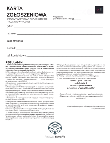 KARTA ZGŁOSZENIOWA (PROSIMY WYPEŁNIAĆ DUŻYMI LITERAMI i MOŻLIWIE WYRAŹNIE) Nr zgłoszenia (wypełnia kierownik selekcji) ............... tytuł: __________________________________________________________________ reżyser: _______________________________________________________________ czas trwania: __________________________________________________________ e-mail: ________________________________________________________________ tel. kontaktowy: ________________________________________________________ REGULAMIN: 1. 10. Festiwal Kina Offowego FILMOFFO organizuje Gmina Opole Lubelskie, Opolskie Centrum Kultury i nieformalna grupa SORRY FILM POLSKA. Festiwal odbędzie się w dniach 24-25.02.2017r. w Opolu Lubelskim w Opolskim Centrum Kultury (Lubelska 30). 2. Filmy zgłoszone do konkursu będą podlegały selekcji. Do konkursu można zgłaszać filmy których czas trwania nie przekracza 30 minut. 3. Głównym wydarzeniem festiwalu jest konkurs filmów offowych, które walczą o nagrodę przyznawaną przez publiczność festiwalu w głosowaniu – Złotego Jeża (statuetka + nagroda pieniężna 1 000 zł lub nagroda rzeczowa o wartości 1 000 zł). 4. Organizatorzy nie zwracają nadesłanych kopii filmów. Filmy te pozostają w archiwum festiwalu. 5. Twórcy zgłoszonych filmów wyrażają zgodę na bezpłatne ich wyświetlanie w ramach FESTIWALU KINA OFFOWEGO FILMOFFO oraz w ramach retrospektyw Festiwalu Filmoffo i innych wydarzeń promujących festiwal. 6. Jeśli zwycięzca festiwalu nie będzie na nim obecny, zostanie mu przesłana statuetka. W takim wypadku traci natomiast prawo do nagrody pieniężnej lub rzeczowej. 7. Kompetentni do rozstrzygania kwestii nieujętych w regulaminie są organizatorzy festiwalu FILMOFFO. 8. Twórcy filmów zakwalifikowanych do konkursu zostają zaproszeni na festiwal. Organizatorzy zapewniają nocleg, wyżywienie oraz bezpłatny wstęp na festiwal i wszystkie wydarzenia towarzyszące. Organizatorzy nie zwracają kosztów przejazdu. 9. Prosimy o przesyłanie filmów na płytach DVD. Preferujemy formaty avi, mkv, mp4 w jakości Full HD (minimum jakość DVD). 10. Istnieje możliwość zgłoszenia filmu za pośrednictwem internetu poprzez darmowe serwisy hostingowe niewymagające logowania (np. WeTransfer). W takiej sytuacji należy wysłać email z linkiem do pobrania filmu wraz ze skanem podpisanej karty zgłoszeniowej i regulaminu na adres: selekcja@ filmoffo.eu 11. W przypadku gdy przesłana kopia filmu jest wadliwa, organizator nie ma obowiązku informowania o tym osobę zgłaszającą film. Jeśli nadesłana kopia jest wadliwa - film nie bierze udziału w selekcji. W przypadku pojawienia się kopii wadliwej - uniemożliwiającej odtworzenie - osoba zgłaszająca film zostanie powiadomiona o tym fakcie oraz poproszona o nadesłanie nowej kopii, pod warunkiem, że nie zakończył się czas selekcji. 12. Prosimy o opisanie płyt (tytuł, czas, imię inazwisko reżysera). 13. Filmy należy nadsyłać do 30 stycznia 2017 roku na adres: Gmina Opole Lubelskie ul. Lubelska 4 24-300 Opole Lubelskie z dopiskiem „Festiwal Filmoffo” Zapoznałem się z treścią regulaminu i w pełni go akceptuje. Oświadczam także, że mój film nie narusza praw autorskich osób trzecich. .......................................................................................................................................................... festiwal filmoffo data i podpis reżysera lub innej osoby upoważnionej do zgłoszenia filmu