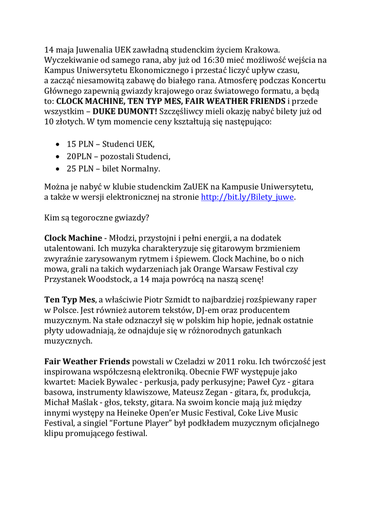14 maja Juwenalia UEK zawładną studenckim życiem Krakowa. Wyczekiwanie od samego rana, aby już od 16:30 mieć możliwość wejścia na Kampus Uniwersytetu Ekonomicznego i przestać liczyć upływ czasu, a zacząć niesamowitą zabawę do białego rana. Atmosferę podczas Koncertu Głównego zapewnią gwiazdy krajowego oraz światowego formatu, a będą to: CLOCK MACHINE, TEN TYP MES, FAIR WEATHER FRIENDS i przede wszystkim – DUKE DUMONT! Szczęśliwcy mieli okazję nabyć bilety już od 10 złotych. W tym momencie ceny kształtują się następująco: 15 PLN – Studenci UEK, 20PLN – pozostali Studenci, 25 PLN – bilet Normalny. Można je nabyć w klubie studenckim ZaUEK na Kampusie Uniwersytetu, a także w wersji elektronicznej na stronie http://bit.ly/Bilety_juwe. Kim są tegoroczne gwiazdy? Clock Machine - Młodzi, przystojni i pełni energii, a na dodatek utalentowani. Ich muzyka charakteryzuje się gitarowym brzmieniem zwyraźnie zarysowanym rytmem i śpiewem. Clock Machine, bo o nich mowa, grali na takich wydarzeniach jak Orange Warsaw Festival czy Przystanek Woodstock, a 14 maja powrócą na naszą scenę! Ten Typ Mes, a właściwie Piotr Szmidt to najbardziej rozśpiewany raper w Polsce. Jest również autorem tekstów, DJ-em oraz producentem muzycznym. Na stałe odznaczył się w polskim hip hopie, jednak ostatnie płyty udowadniają, że odnajduje się w różnorodnych gatunkach muzycznych. Fair Weather Friends powstali w Czeladzi w 2011 roku. Ich twórczość jest inspirowana współczesną elektroniką. Obecnie FWF występuje jako kwartet: Maciek Bywalec - perkusja, pady perkusyjne; Paweł Cyz - gitara basowa, instrumenty klawiszowe, Mateusz Zegan - gitara, fx, produkcja, Michał Maślak - głos, teksty, gitara. Na swoim koncie mają już między innymi występy na Heineke Open’er Music Festival, Coke Live Music Festival, a singiel “Fortune Player” był podkładem muzycznym oficjalnego klipu promującego festiwal. Duke Dumont, czyli światowa czołówka DJ’ów, pierwszy raz w Polsce. Piosenki takie jak: I Got U, Need You (100%) czy Won’t Look Back są grane w klubach i rozgłośniach radiowych na całym świecie. W samym tylko 2015 roku otrzymał nominację Grammy za najlepsze nagranie, a także Brit Award za najlepszy brytyjski singiel i teledysk. Ale Juwenalia UEK to nie tylko Koncert Główny. To wielkie przedsięwzięcie, za które odpowiada ponad setka osób. Startujemy już 29 kwietnia. Oto juwenaliowy rozkład jazdy: 29 kwietnia – Wybory Najmilszej Studentki i Super Studenta oraz koncert zespołu Dwa Sławy. W tym roku będą miały miejsce w Klubie Kwadrat. Przygotowania są już na ostatniej prostej. W tym roku szykujemy dla Was wiele atrakcji, w tym koło fortuny, przy którym będzie można zgarnąć mnóstwo nagród. Szykujcie się na świetną zabawę połączoną z dużą dawką humoru! FB:http://on.fb.me/1P73YQ3 5-6 maja – X-tremalia. W tym roku na Kampusie Uczelni będzie miała miejsce niezliczona ilość atrakcji, a wśród nich: streetball, warsztaty muzyki elektronicznej, warsztaty lacrosse i futbolu amerykańskiego, warsztaty kickboxing, turniej piłki nożnej, gra w skate (czyli walka na triki deskorolkowe) i wiele więcej! FB: http://on.fb.me/1HN6ski 7 maja – Przegląd Kapel Rockowych. Ogólnopolski konkurs dla młodych zespołów rockowych z ognistym potencjałem. W tym roku startujemy już po raz siódmy! Wszystko będzie miało miejsce w Klubie Fabryka, a po 10-ciu konkursowych występach kapel rockowych czeka nas wielki finał – koncert zespołu Farben Lehre! FB: http://on.fb.me/1zDI65P 11 maja – UEK Gaming Stage. W tym roku na Hali SportowoWidowiskowej będzie pękać w szwach od ludzi spragnionych rywalizacji. To w czym będzie można uczestniczyć to turniej League of Legends przy współpracy z MSI Polska, turniej Fify15 oraz turniej na siedmiu pokerowych stołach w Texas Hold’em. FB: http://on.fb.me/1E3NDrv 12 maja – Fashion Night. Tegoroczne wydarzenie promuje hasło „Młodzi Zdolni”, pod którym skrywają się liczni projektanci, styliści, firmy czy blogerzy. Nie tylko ci znani, ale w szczególności tacy, przed którymi drzwi do świata mody wciąż stoją szeroko otwarte. FB: http://on.fb.me/1KejJjC 13 maja – Zmagania Wydziałów. Biorą w nim udział studenci UEK-u, którzy reprezentują wydziały : Zarządzania, Ekonomii i Stosunków Międzynarodowych, Finansów oraz Towaroznawstwa. Podczas Zmagań Wydziałów studenci rywalizują w nietypowych konkurencjach o puchar Rektora. W tym roku odbędzie się między innymi ślizg na klacie, mecz quidditcha czy pchanie busa na Kampusie. FB: http://on.fb.me/1bejFWu 13 maja – Noc Kinowa. Gwieździste niebo, piękny księżyc, koc, przyjaciele… i film! Z ogromnym entuzjazmem informujemy, że prace do kolejnej edycji Nocy Kinowej już trwają. Gwarantujemy mocną dawkę dobrego kina, świetną atmosferę i mnóstwo atrakcji. FB:http://on.fb.me/1QbMG5R 147 dni. 3 528 godzin. 211 680 minut. Tyle czasu będą trwać przygotowania do tych 16 dni niesamowitej zabawy, atmosfery i szaleństwa. Wszystkie informacje dotyczące tego tych wydarzeń można znaleźć na stronie http://juwenaliauek.pl/ oraz na fanpage’u https://www.facebook.com/JuwenaliaUEK?fref=ts . Wszystkie informacje dotyczące projektów można znaleźć na ich stronach internetowych oraz fanpage’ach. W tym roku celujemy w better, higher, louder!