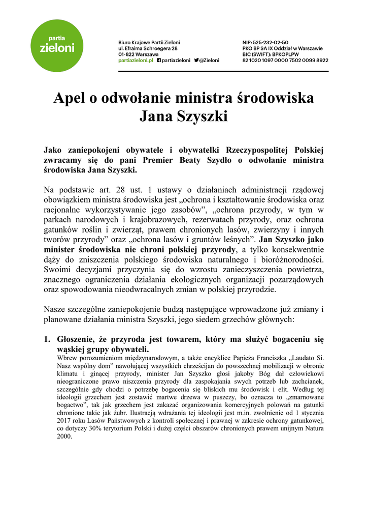 Apel o odwołanie ministra środowiska Jana Szyszki Jako zaniepokojeni obywatele i obywatelki Rzeczypospolitej Polskiej zwracamy się do pani Premier Beaty Szydło o odwołanie ministra środowiska Jana Szyszki. Na podstawie art. 28 ust. 1 ustawy o działaniach administracji rządowej obowiązkiem ministra środowiska jest „ochrona i kształtowanie środowiska oraz racjonalne wykorzystywanie jego zasobów”, „ochrona przyrody, w tym w parkach narodowych i krajobrazowych, rezerwatach przyrody, oraz ochrona gatunków roślin i zwierząt, prawem chronionych lasów, zwierzyny i innych tworów przyrody” oraz „ochrona lasów i gruntów leśnych”. Jan Szyszko jako minister środowiska nie chroni polskiej przyrody, a tylko konsekwentnie dąży do zniszczenia polskiego środowiska naturalnego i bioróżnorodności. Swoimi decyzjami przyczynia się do wzrostu zanieczyszczenia powietrza, znacznego ograniczenia działania ekologicznych organizacji pozarządowych oraz spowodowania nieodwracalnych zmian w polskiej przyrodzie. Nasze szczególne zaniepokojenie budzą następujące wprowadzone już zmiany i planowane działania ministra Szyszki, jego siedem grzechów głównych: 1. Głoszenie, że przyroda jest towarem, który ma służyć bogaceniu się wąskiej grupy obywateli. Wbrew porozumieniom międzynarodowym, a także encyklice Papieża Franciszka „Laudato Si. Nasz wspólny dom” nawołującej wszystkich chrześcijan do powszechnej mobilizacji w obronie klimatu i ginącej przyrody, minister Jan Szyszko głosi jakoby Bóg dał człowiekowi nieograniczone prawo niszczenia przyrody dla zaspokajania swych potrzeb lub zachcianek, szczególnie gdy chodzi o potrzebę bogacenia się bliskich mu środowisk i elit. Według tej ideologii grzechem jest zostawić martwe drzewa w puszczy, bo oznacza to „zmarnowane bogactwo”, tak jak grzechem jest zakazać organizowania komercyjnych polowań na gatunki chronione takie jak żubr. Ilustracją wdrażania tej ideologii jest m.in. zwolnienie od 1 stycznia 2017 roku Lasów Państwowych z kontroli społecznej i prawnej w zakresie ochrony gatunkowej, co dotyczy 30% terytorium Polski i dużej części obszarów chronionych prawem unijnym Natura 2000. 2. Masowa wycinka drzew w Puszczy Białowieskiej, w tym ponad stuletnich starodrzewów Naruszając kompromis wypracowany przez zespół powołany przez ś.p. prezydenta Lecha Kaczyńskiego, wbrew opinii Państwowej Rady Ochrony Przyrody, Komitetu Ochrony Przyrody PAN i naukowców przyrodników i ekologów z większości polskich uniwersytetów, minister Szyszko zatwierdził w dniu 25.03.2016 roku Aneks do Planu Urządzenia Lasu Nadleśnictwa Białowieża na lata 2012-2021, zezwalając na praktycznie trzykrotny wzrost wycinki drzew w tym nadleśnictwie. W ciągu pięciu lat ma być wycięte w Puszczy Białowieskiej 122.000 m3 drzew, przy czym zniesiono zakaz wycinania wartościowych dla ekosystemów drzew ponad stuletnich. 3. Stworzenie z Polski Rzeczypospolitej Myśliwskiej kosztem zwierząt, obywateli i obywatelek Minister Szyszko opracował zmiany w prawie łowieckim. Przyjęcie przez Sejm tego projektu doprowadzi do znaczącego pogorszenia standardów ochrony dzikich zwierząt, odda w ręce myśliwych absurdalnie szeroki zakres uprawnień, zlekceważy fundamentalne prawa milionów właścicieli i właścicielek nieruchomości oraz uniemożliwi Polkom i Polakom korzystanie z uroków ojczystej przyrody. Ustawa ta, dotycząca nas wszystkich, w większości nie-myśliwych, została napisana pod dyktando osób, które uprawiają krwawe hobby polegające na zabijaniu zwierząt. 4. Przyzwolenie na masowe i niekontrolowane wycinki drzew Od 1 stycznia 2017 roku wchodzi w życie nowelizacja ustawy o ochronie przyrody. Przyjęte zmiany niosą ogromne zagrożenie dla polskich drzew w miastach i gminach wiejskich. Łagodząc przepisy dotyczące ochrony drzew, skazuje się je na niekontrolowaną wycinkę, mieszkańców i mieszkanki miast na życie na wygrzanej od upałów betonowej pustyni i ogromne zanieczyszczenie powietrza, a rolników na zmniejszenie plonów. Ponadto naraża się nas wszystkich na dotkliwe susze i powodzie. Masowe niszczenie kuluarów ekologicznych i wartościowych siedlisk jakie stanowią drzewa i krzewy, będzie miało także katastrofalne skutki dla polskiej przyrody. 5. Likwidacja demokracji środowiskowej i przyzwolenie na szkodliwe inwestycje Minister Szyszko prowadzi politykę konsekwentnego przejmowania lub likwidacji demokratycznych instytucji i procedur służących kontroli decyzji środowiskowych, mających chronić przyrodę i zapewnić obywatelom i obywatelkom prawo do czystego i zdrowego środowiska. Jest to dewastacyjna polityka w czterech punktach: 1. Podporządkowanie ministrowi środowiska niezależnych dotąd naukowych organów doradczych ds. ochrony przyrody. 2. Brak przejrzystości i konsultacji przy wprowadzaniu radykalnych zmian w systemie ochrony przyrody i środowiska. 3. Podporządkowanie ministrowi środowiska systemu decyzji środowiskowych i finansowania działań na rzecz przyrody i środowiska 4. Odebranie możliwości działania na rzecz ochrony przyrody i środowiska organizacjom ekologicznym. 6. Skandaliczna polityka klimatyczna Jako kategoryczny klimatosceptyk, nie uznający światowej wiedzy naukowej raportowanej przez Międzyrządowy Panel ds. Zmian Klimatu (IPCC) i będącej podstawą międzynarodowych negocjacji klimatycznych, minister Szyszko promuje jak najdłuższe utrzymanie paliw kopalnych, zwalcza efektywność energetyczną, a rozwój OZE podporządkowuje wyłącznie interesom finansowym bliskich mu grup interesów: finansowanie przez państwo nowych instalacji geotermalnych eksploatowanych przez redemptorystów ojca Rydzyka oraz rozwój współspalania z węglem biomasy energetycznej, głównie z lasów, aby zwiększać przychody leśników. Państwo polskie mogłoby mieć swoją dobrą drogę, która by zarówno dawała ludziom autonomię energetyc
