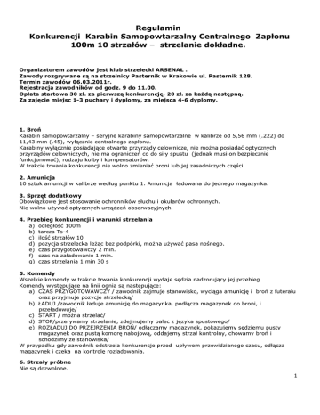 Regulamin Konkurencji Karabin Samopowtarzalny Centralnego Zapłonu 100m 10 strzałów – strzelanie dokładne. Organizatorem zawodów jest klub strzelecki ARSENAŁ . Zawody rozgrywane są na strzelnicy Pasternik w Krakowie ul. Pasternik 128. Termin zawodów 06.03.2011r. Rejestracja zawodników od godz. 9 do 11.00. Opłata startowa 30 zł. za pierwszą konkurencję, 20 zł. za każdą następną. Za zajęcie miejsc 1-3 puchary i dyplomy, za miejsca 4-6 dyplomy. 1. Broń Karabin samopowtarzalny – seryjne karabiny samopowtarzalne w kalibrze od 5,56 mm (.222) do 11,43 mm (.45), wyłącznie centralnego zapłonu. Karabiny wyłącznie posiadające otwarte przyrządy celownicze, nie można posiadać optycznych przyrządów celowniczych, nie ma ograniczeń co do siły spustu (jednak musi on bezpiecznie funkcjonować), rodzaju kolby i kompensatorów. W trakcie trwania konkurencji nie wolno zmieniać broni lub jej zasadniczych części. 2. Amunicja 10 sztuk amunicji w kalibrze według punktu 1. Amunicja ładowana do jednego magazynka. 3. Sprzęt dodatkowy Obowiązkowe jest stosowanie ochronników słuchu i okularów ochronnych. Nie wolno używać optycznych urządzeń obserwacyjnych. 4. Przebieg konkurencji i warunki strzelania a) odległość 100m b) tarcza Ts-4 c) ilość strzałów 10 d) pozycja strzelecka leżąc bez podpórki, można używać pasa nośnego. e) czas przygotowawczy 2 min. f) czas na załadowanie 1 min. g) czas strzelania 1 min 30 s 5. Komendy Wszelkie komendy w trakcie trwania konkurencji wydaje sędzia nadzorujący jej przebieg Komendy występujące na linii ognia są następujące: a) CZAS PRZYGOTOWAWCZY / zawodnik zajmuje stanowisko, wyciąga amunicję i broń z futerału oraz przyjmuje pozycje strzelecką/ b) ŁADUJ /zawodnik ładuje amunicję do magazynka, podłącza magazynek do broni, i przeładowuje/ c) START / można strzelać/ d) STOP/przerywamy strzelanie, zdejmujemy palec z języka spustowego/ e) ROZŁADUJ DO PRZEJRZENIA BROŃ/ odłączamy magazynek, pokazujemy sędziemu pusty magazynek oraz pustą komorę nabojową, oddajemy strzał kontrolny, chowamy broń i schodzimy ze stanowiska/ W przypadku gdy zawodnik odstrzela konkurencje przed upływem przewidzianego czasu, odłącza magazynek i czeka na kontrolę rozładowania. 6. Strzały próbne Nie są dozwolone. 1 7. Punktacja i wyniki Wynikiem jest suma wartości przestrzelin w tarczy, przy czym jeśli przestrzelina jest styczna do linii dzielącej pola oceniane, zaliczana jest pola o wyższej wartości. Ocena tarczy odbywa się w obecności zawodnika. 8. Bezpieczeństwo W czasie trwania zawodów oraz w konkurencji, zawodników obowiązują zasady bezpieczeństwa zgodne z niniejszym regulaminem. Podczas trwania konkurencji należy zwrócić szczególną uwagę na: a) przenoszenie broni na terenie strzelnicy tylko lufą do góry lub do dołu zabezpieczona bez podłączonego magazynka; b) ładowanie magazynka i broni i tylko na stanowisku strzeleckim i na komendę sędziego; c) zakaz jakichkolwiek nieregulaminowych manewrów załadowaną bronią; d) zachowanie bezpiecznego kierunku zwracania wylotu lufy broni; e) nie wysuwanie żadnej części ciała przed płaszczyznę wylotu lufy, w momencie oddawania strzału; f) kładzenie palca na języku spustowym tylko po skierowaniu broni w stronę celu; g) zabrania się wychodzenia zawodnikom lub innym osobą za linię ognia w czasie trwania konkurencji; h) zabrania się ładowania więcej niż jednego magazynka; i) zabrania się ładowania do magazynka więcej niż 10 szt. amunicji Wyznacza się na strzelnicy miejsce bezpieczne gdzie zawodnicy mogą składać się do strzału, czyścić, rozbierać, manipulować, wymieniać magazynki itp. ,dobywać z futerałów i przygotowywać się do strzelania. Broń ta nie może być załadowana i nie można wyjmować na tym stanowisku naboi nawet ćwiczebnych. Manipulowanie bronią w innych miejscach jest zabronione. Poruszanie się z karabinkami na strzelnicy możliwe jest tylko w pozycji na pasie ,lufą do góry lub do dołu. Dozwolone jest dobywanie karabinka z futerału i przygotowywanie się do strzelania na stanowisku ogniowym. 9. Kary Od końcowego wyniku odjęte zostaną 2 punkty: a) za każdy strzał oddany po podpowiedzi udzielonej przez inną osobę; b) za każdy strzał oddany ponad przewidzianą w konkurencji ilość, przy czym odejmowana jest wartość najlepszej przestrzeliny uzyskanej w ostrzelanej tarczy; c) za każdy strzał oddany po komendzie STOP jeżeli nie stanowił zagrożenia bezpieczeństwa przy czym odejmowana jest wartość najlepszej przestrzeliny uzyskanej w ostrzelanej tarczy; d) przy pierwszym przewinieniu polegającym na stosowanie podpórki w trakcie konkurencji. Następną karą za stosowanie podpórki jest dyskwalifikacja. Opuszczenie stanowiska po odstrzelaniu konkurencji bez sprawdzenia rozładowania broni przez sędziego karane jest dyskwalifikacją. Nieprzestrzeganie zasad bezpieczeństwa karane jest dyskwalifikacją. Zadziałanie broni w sposób automatyczny karane jest dyskwalifikacją. Oddanie strzału przed komendą START karane jest dyskwalifikacją. 10. Problemy techniczne z bronią lub amunicją Za wszelkiego rodzaju problemy z bronią lub amunicją odpowiada zawodnik. W przypadku wystąpienia niewypału dopuszcza się dodatkowe doładowanie broni w trakcie trwania konkurencji, pod warunkiem że nastąpi ono po odstrzeleniu naboi znajdujących się w broni i będzie wykonane w sposób bezpieczny. 11. Protesty Zawodnik nie zgadzający się z orzeczeniem sędziego, może złożyć protest bezpośrednio po zaistnieniu spornego zdarzenia (jeśli protest dotyczy uzyskanego przez zawodnika wyniku lub nałożonej kary należy złożyć go przed podpisaniem metryczki). Odwołanie decyzji należy kierować do Przewodniczącego Komisji Klasyfikacyjnej, a jego decyzja jest ostateczna. 2