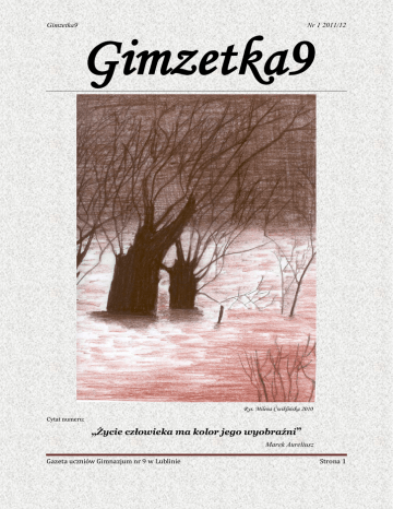 Gimzetka9 Nr 1 2011/12 Gimzetka9 Rys. Milena Ćwiklińska 2010 Cytat numeru: „Życie człowieka ma kolor jego wyobraźni” Marek Aureliusz Gazeta uczniów Gimnazjum nr 9 w Lublinie Strona 1 Gimzetka9 Nr 1 2011/12 Od redakcji .......................................................................................................................................... 3 Informacje ............................................................................................................................................... 3 I ty też możesz pomóc… .......................................................................................................................... 4 Sonda ....................................................................................................................................................... 5 Powiedz jakiej muzyki słuchasz, a powiem ci kim jesteś? ....................................................................... 5 Czas refleksji ............................................................................................................................................ 6 Co było nie wróci, ale … ........................................................................................................................... 6 Do przemyślenia… na co dzieo, nie tylko od święta… ............................................................................ 7 Wywiad z panem Wojciechem Markiem, nauczycielem w-f ................................................................... 8 Szkoła Współpracy Polsko – Ukraińskiej................................................................................................ 10 Poranne „Finish Him!” ........................................................................................................................... 11 KONKURS GIMZETKI z nagrodami ......................................................................................................... 11 Poznaj swój kraj ..................................................................................................................................... 12 Pasjonaci ................................................................................................................................................ 13 BECZKA ŚMIECHU ................................................................................................................................. 14 Z okazji nadchodzących Świąt Bożego Narodzenia i Nowego Roku 2012 wszystkim Nauczycielom, Pracownikom oraz Koleżankom i Kolegom najlepsze życzenia składa Redakcja. „Aby Święta były wyjątkowymi dniami w roku, by choinka w każdych oczach zalśniła blaskiem, By kolacja wigilijna wniosła w serca spokój, a radość pojawiała się z każdym nowym brzaskiem. By prezenty ucieszyły każde smutne oczy, by spokojna przerwa ukoiła złość By Sylwester zapewnił szampańską zabawę, a kolędowych śpiewów nie było dość!” http://www.e-zyczenia.pl/zyczenia/bozonarodzeniowe/ Gazeta uczniów Gimnazjum nr 9 w Lublinie Strona 2 Gimzetka9 Nr 1 2011/12 Od redakcji: Jesień to piękna pora roku. Owady już nie przeszkadzają, światło słoneczne prześwituje przez zwiędłe liście. Wtedy nawet w mieście robi się kolorowo. Jesień to spokojny czas, ale to od nas zależy, czy znajdziemy w nim trochę szaleństwa i emocji. Niedługo, mam nadzieję, zima ze śniegiem. W czasie przedświątecznego zabiegania nie zapomnijcie o otaczającej was przyrodzie i miłych spacerach z rodziną lub przyjaciółmi. Zapraszamy wszystkich do wspólnego redagowania naszej gazety – piszcie teksty, dostarczajcie rysunki i zdjęcia, zgłaszajcie pomysły na tematy, o których warto mówić. Informacje Do okręgowego etapu konkursów przedmiotowych pod patronatem Lubelskiego Kuratora Oświaty przeszło 60 uczniów naszej szkoły. Życzymy im powodzenia w kolejnych zmaganiach, które rozpoczęły się 28 listopada. W październiku do naszej szkoły przyjechali goście (uczniowie i nauczyciele) ze szkół partnerskich z Ukrainy - z Majaków koło Łucka i z Beresteczka. Zwiedzali Lublin, wspólnie ze swoimi polskimi kolegami podejmowali różnorodne działania. 16 listopada uczniowie pod opieką pani Małgorzaty Grabskiej zorganizowali kiermasz zdrowej żywności w celu zebrania pieniędzy na rzecz schroniska dla bezdomnych zwierząt. Biblioteka szkolna we współpracy z Miejską Biblioteką Publiczną przeprowadziła konkurs pięknego czytania i konkurs plastyczny w ramach Festiwalu Słowa i Obrazu. Tegoroczna edycja odbyła się pod hasłem „Po drugiej stronie lustra...”- z okazji 180 rocznicy urodzin autora książki „Alicja w krainie czarów”. Naszą szkołę odwiedziło ponad 40 uczniów z różnych lubelskich szkół. Finał imprezy miał miejsce 23 listopada w Filii nr 35 Miejskiej Biblioteki Publicznej przy ul. Bursztynowej. Ponadto młodzież uczestniczyła w warsztatach plastycznych (w naszej szkole) oraz dziennikarskich (w Radio Lublin). Od 14 do 18 listopada uczniowie z Klubu Szkoły Humanitarnej (klasa 2a, 2c, 2g) pod opieką pani Iwony Kryczki zaangażowali się w organizację Tygodnia Edukacji Globalnej. Uczestniczyli w warsztatach prowadzonych przez przedstawicieli Polskiej Akcji Humanitarnej, poznali warunki życia i edukacji swoich rówieśników w Afganistanie, podejmowali szereg działań pod hasłem „Działaj dla świata”. Na początku października w kawiarnio-księgarni „Spółdzielnia” odbył się festiwal – Świat na talerzu, a dokładnie warsztaty pt. „Skutki zmian klimatu pogłębiają ubóstwo krajów Globalnego Południa - przykład Afryki’’. Była to bardzo ciekawa lekcja o antropologicznych zmianach klimatu. Gimnazjaliści spotkali się także z Panią Alicją Trzaską - germanistką, która wyjechała do Boliwii w ramach misji. Wspominała swoje przygody, a dzięki zdjęciom uczestnicy mogli się przenieść do Ameryki Płd. W mieście, które znajduje s