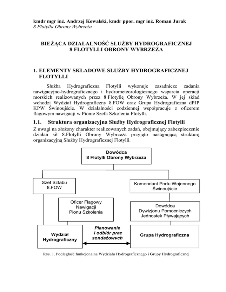 kmdr mgr inż. Andrzej Kowalski, kmdr ppor. mgr inż. Roman Jurak 8 Flotylla Obrony Wybrzeża BIEŻĄCA DZIAŁALNOŚĆ SŁUŻBY HYDROGRAFICZNEJ 8 FLOTYLLI OBRONY WYBRZEŻA 1. ELEMENTY SKŁADOWE SŁUŻBY HYDROGRAFICZNEJ FLOTYLLI Służba Hydrograficzna Flotylli wykonuje zasadnicze zadania nawigacyjno-hydrograficznego i hydrometeorologicznego wsparcia operacji morskich realizowanych przez 8 Flotyllę Obrony Wybrzeża. W jej skład wchodzi Wydział Hydrograficzny 8.FOW oraz Grupa Hydrograficzna dPJP KPW Świnoujście. W działalności codziennej współpracuje z oficerem flagowym nawigacji w Pionie Szefa Szkolenia Flotylli. 1.1. Struktura organizacyjna Służby Hydrograficznej Flotylli Z uwagi na złożony charakter realizowanych zadań, obejmujący zabezpieczenie działań sił 8.Flotylli Obrony Wybrzeża przyjęto następującą strukturę organizacyjną Służby Hydrograficznej Flotylli. Dowódca 8 Flotylli Obrony Wybrzeża Szef Sztabu 8.FOW Komendant Portu Wojennego Świnoujście Oficer Flagowy Nawigacji Pionu Szkolenia Wydział Hydrograficzny Planowanie i odbiór prac sondażowych Dowódca Dywizjonu Pomocniczych Jednostek Pływających Grupa Hydrograficzna Rys. 1. Podległość funkcjonalna Wydziału Hydrograficznego i Grupy Hydrograficznej 1.2. Zadania, przeznaczenie i organizacja Wydziału Hydrograficznego. Wydział Hydrograficzny jest wewnętrzną komórką Sztabu podległą bezpośrednio szefowi Sztabu Flotylli1. Całokształtem działalności Wydziału kieruje szef Wydziału Hydrograficznego i jest przełożonym wszystkich żołnierzy. Odpowiada za organizację nawigacyjno-hydrograficznego zabezpieczenia działań sił Flotylli na zasadach określonych przez Biuro Hydrograficzne Marynarki Wojennej (BHMW) oraz wyszkolenie podległych specjalistów i przygotowanie ich do wykonywania zadań w warunkach bojowych. Uprawniony jest do prowadzenia nadzorów, udzielania instruktaży oraz wydawania zaleceń w sprawach dotyczących działalności merytorycznej Pionu Funkcjonalnego oraz utrzymywania współpracy z instytucjami cywilnymi w sprawach należących do zakresu działania Wydziału. Zakres działania Wydziału Hydrograficznego jest następujący: określanie zadań komórkom nawigacyjno-hydrograficznego i hydrometeorologicznego zabezpieczenia Jednostek Wojskowych Flotylli; opracowywanie i przedstawianie szefowi Sztabu Flotylli wniosków i propozycji dotyczących nawigacyjno-hydrograficznego, hydrologiczno-meteorologicznego i topograficznego zabezpieczenia działań sił Flotylli w warunkach codziennych i wyższych stanach gotowości bojowej, wyszkolenia oraz wyposażenia JW Flotylli w sprzęt i materiały hydrograficzne; udział w opracowaniu dokumentacji związanej z osiąganiem WSGB Flotylli, w części dotyczącej zabezpieczenia nawigacyjnohydrograficznego; nadzór nad opracowywaniem i dostarczaniem materiałów sondażowych zainteresowanym jednostkom wojskowym lub przełożonym; utrzymywanie współpracy z BHMW w zakresie merytorycznej działalności Wydziału; utrzymywanie współpracy z instytucjami cywilnymi w zakresie wyposażenia nawigacyjnego, bezpieczeństwa żeglugi oraz wymiany informacji hydrograficznych; sprawowanie nadzoru nad przebiegiem prac remontowych oraz montażem sprzętu nawigacyjno-hydrograficznego na jednostkach pływających Flotylli, wykonywanymi przez Warsztaty Remontowe Techniki Morskiej (WRTM) Komendy Portu Wojennego (KPW) Świnoujście i inne zakłady remontowe; nadzór nad obiegiem informacji nautycznej; 1 Dowództwo Marynarki Wojennej, Zakres działania 8 Flotylli Obrony Wybrzeża w czasie pokoju. Gdynia 2007 koordynowanie działań w celu zapewnienia dowódcom zespołu okrętów dowódcom okrętów i pjp dokładnej, terminowej i wiarygodnej informacji w zakresu oceanografii operacyjnej; prowadzenie i udostępnianie danych siłom Flotylli zawartych w numerycznej bazie danych hydrograficznych; prowadzenie studiów i dokonywanie analiz pod względem nawigacyjno-hydrograficznym zachodniego wybrzeża; udział w kontrolach i przyjmowaniu zadań programowych, ogniowych i specjalnych organizowanych przez Dowództwo Flotylli; ukierunkowywanie i prowadzenie szkolenia specjalistycznego z podległymi specjalistami; współpraca z oficerem flagowym nawigacji Flotylli w zakresie wyposażenia i eksploatacji sprzętu nawigacyjnego i meteorologicznego w zespołach okrętów Flotylli. Strukturę organizacyjną Wydziału Hydrograficznego przedstawia rys. 2. Wydział Hydrograficzny 8.FOW określa zakres zadań a następnie weryfikuje prace sondażowe wykonywane przez Grupę Hydrograficzną Dywizjonu Pomocniczych Jednostek Pływających KPW Świnoujście. Wydział Hydrograficzny 8.FOW Szef Wydziału Hydrograficznego Specjalista WH Podoficer WH Rys. 2. Struktura organizacyjna Wydziału Hydrograficznego 8.FOW Źródło: Opracowanie własne 1.3. Zadania, przeznaczenie i organizacja Grupy Hydrograficznej dywizjonu Pomocniczych Jednostek Pływających KPW Świnoujście. Grupa Hydrograficzna jest jednym z pododdziałów dywizjonu Pomocniczych Jednostek Pływających KPW Świnoujście1. W skład grupy wchodzą kuter K-7 i motorówka M-35. Zakres działania Grupy Hydrograficznej, w ramach zabezpieczenia nawigacyjno-hydrograficznego działań okrętów 8.FOW jest następujący: wykonanie podstawy geodezyjnej sondażu; wykonywanie prac sondażowych w miejscach bazowania okrętów oraz na poligonach ćwiczeń 8 FOW; wystawianie nabieżników i innych znaków nawigacyjnych dla potrzeb sił 8.FOW; wykonywanie pełnej dokumentacji sprawozdawczej ze zrealizowanych prac; wykonanie podstawowych pomiarów geodezyjnych. Utworzona struktura organizacyjna Grupy Hydrograficznej dPJP KPW Świnoujście ma na celu realizację postawionych zadań, obejmujących opracowanie danych dotyczących: głębokości, charakteru i konfiguracji dna, oraz przeszkód nawigacyjnych. Strukturę organizacyjną Grupy Hydrograficznej, w tym Zespołu Pomiarów i Opracowań Hydrograficznych oraz motorówki hydrogr