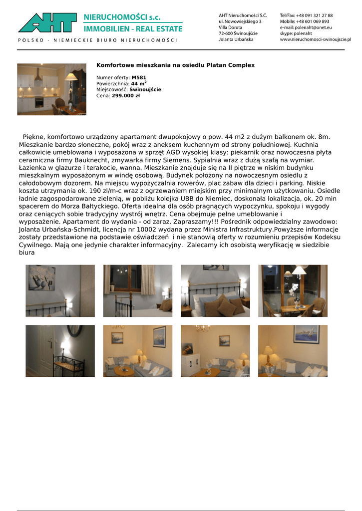 Komfortowe mieszkania na osiedlu Platan Complex Numer oferty: M581 Powierzchnia: 44 m2 Miejscowość: Świnoujście Cena: 299.000 zł Piękne, komfortowo urządzony apartament dwupokojowy o pow. 44 m2 z dużym balkonem ok. 8m. Mieszkanie bardzo słoneczne, pokój wraz z aneksem kuchennym od strony południowej. Kuchnia całkowicie umeblowana i wyposażona w sprzęt AGD wysokiej klasy: piekarnik oraz nowoczesna płyta ceramiczna firmy Bauknecht, zmywarka firmy Siemens. Sypialnia wraz z dużą szafą na wymiar. Łazienka w glazurze i terakocie, wanna. Mieszkanie znajduje się na II piętrze w niskim budynku mieszkalnym wyposażonym w windę osobową. Budynek położony na nowoczesnym osiedlu z całodobowym dozorem. Na miejscu wypożyczalnia rowerów, plac zabaw dla dzieci i parking. Niskie koszta utrzymania ok. 190 zl/m-c wraz z ogrzewaniem miejskim przy minimalnym użytkowaniu. Osiedle ładnie zagospodarowane zielenią, w pobliżu kolejka UBB do Niemiec, doskonała lokalizacja, ok. 20 min spacerem do Morza Bałtyckiego. Oferta idealna dla osób pragnących wypoczynku, spokoju i wygody oraz ceniących sobie tradycyjny wystrój wnętrz. Cena obejmuje pełne umeblowanie i wyposażenie. Apartament do wydania - od zaraz. Zapraszamy!!! Pośrednik odpowiedzialny zawodowo: Jolanta Urbańska-Schmidt, licencja nr 10002 wydana przez Ministra Infrastruktury.Powyższe informacje zostały przedstawione na podstawie oświadczeń i nie stanowią oferty w rozumieniu przepisów Kodeksu Cywilnego. Mają one jedynie charakter informacyjny. Zalecamy ich osobistą weryfikację w siedzibie biura