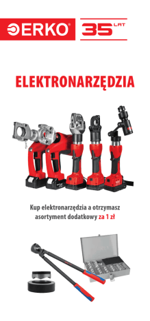 ELEKTRONARZĘDZIA Kup elektronarzędzia a otrzymasz asortyment dodatkowy za 1 zł Elektropraska Wycinarka akumulatorowa Otrzymasz zestaw matryc do zaciskania ZS_K-K8 Otrzymasz 5 standardowych wycinaków okrągłych typu WO w zakresie od 16,5 do 60,5 każdy wycinak EPZ 300N w cenie 1 zł netto EWHE 80 w cenie 1 zł netto Elektropraska EPZC 300 Otrzymasz zestaw matryc do zaciskania ZS_K-K8 w cenie 1 zł netto Elektrohydrauliczne nożyce EGC 45 Elektropraska EPZ 120 Otrzymasz zestaw matryc do zaciskania ZSM_K-K8 w cenie 1 zł netto Otrzymasz nożyce RC_27 w cenie 1 zł netto Regulamin promocji „Elektronarzędzia” §1. Organizator promocji Organizatorem promocji, „Elektronarzędzia” są Zakłady Metalowe ERKO R. Pętlak spółka jawna Bracia Pętlak z siedzibą w Jonkowie przy ul. Hanowskiego 7 – zwane dalej Producentem. §2. Przedmiot promocji Za zakup narzędzi przedstawionych w ulotce Klient otrzymuje wymieniony asortyment dodatkowy w promocyjnej cenie. Asortyment dodatkowy przyznany za zakup narzędzi zostanie zafakturowany przez Producenta łącznie z pozostałymi pozycjami faktury dotyczącymi promocji. Promocja dotyczy jedynie nowych i kompletnych wyrobów Producenta. §3. Czas trwania promocji Promocja trwa od 10.10.2016 r. do 31.12.2016 r. lub do wyczerpania zapasów. Za decydującą o udziale w promocji datę przyjmuje się datę złożenia zamówienia. Promocja może zostać wydłużona/skrócona/odwołana przez Producenta bez wcześniejszego powiadomienia. §4. Uczestnicy promocji Promocja obejmuje wszystkich Klientów Producenta oraz Klientów jego Dystrybutorów nie posiadających wobec niego zaległości płatniczych. §5. Warunki promocji Zakupiony promocyjnie towar musi być odebrany w całości i terminowo opłacony oraz nie podlega zwrotowi ani wymianie. §6. Postanowienia końcowe Producent zastrzega sobie prawo do zmiany zasad i warunków promocji bez wcześniejszego powiadomienia. Producent nie ponosi odpowiedzialności w stosunku do żadnego Klienta za jakiekolwiek straty finansowe poniesione przez niego w wyniku odmowy, anulacji lub wycofania Promocji oraz za niewykorzystanie przez Klienta lub niemożność skorzystania z Promocji z jakichkolwiek powodów. Uczestnikom promocji nie przysługuje prawo otrzymania ekwiwalentu pieniężnego lub rzeczowego z tytułu promocji. * Regulamin promocji na www.erko.pl. Promocja obowiązuje od 10.10.2016 do 31.12.2016 lub do wyczerpania zapasów. ERKO sp.j. 11-042 Jonkowo, ul. Hanowskiego 7, Polska tel./fax +48 89 512 92 73 dział sprzedaży: [email protected] www.erko.pl