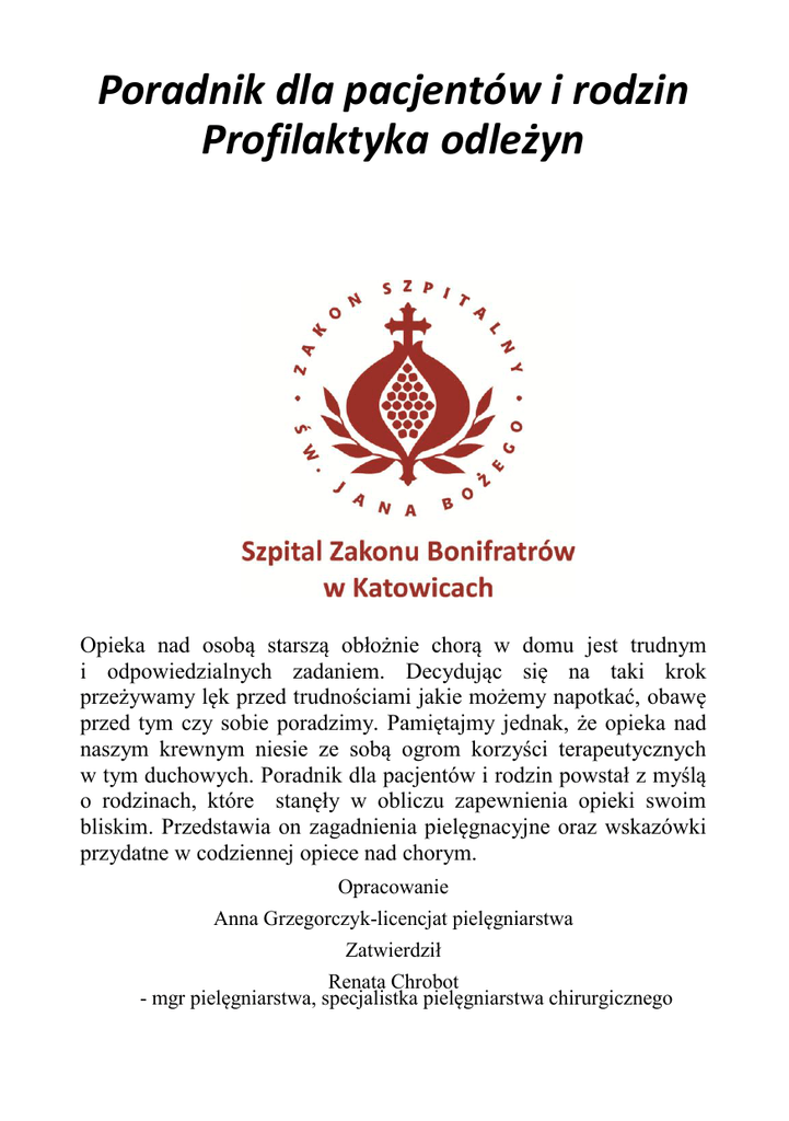 Poradnik dla pacjentów i rodzin Profilaktyka odleżyn Opieka nad osobą starszą obłożnie chorą w domu jest trudnym i odpowiedzialnych zadaniem. Decydując się na taki krok przeżywamy lęk przed trudnościami jakie możemy napotkać, obawę przed tym czy sobie poradzimy. Pamiętajmy jednak, że opieka nad naszym krewnym niesie ze sobą ogrom korzyści terapeutycznych w tym duchowych. Poradnik dla pacjentów i rodzin powstał z myślą o rodzinach, które stanęły w obliczu zapewnienia opieki swoim bliskim. Przedstawia on zagadnienia pielęgnacyjne oraz wskazówki przydatne w codziennej opiece nad chorym. Opracowanie Anna Grzegorczyk-licencjat pielęgniarstwa Zatwierdził Renata Chrobot - mgr pielęgniarstwa, specjalistka pielęgniarstwa chirurgicznego U chorych leżących należy obserwować skórę, ponieważ jest ona narażona na podrażnienia, które mogą prowadzić do niebezpiecznych zmian – odparzeń i odleżyn. 2 CO TO SĄ ODLEŻYNY I JAK POWSTAJĄ? Odleżyny są to obszary uszkodzonej skóry i tkanki. Powstają w wyniku zbyt długiego siedzenia lub leżenia w jednej pozycji, co powoduje zbyt duży nacisk na pewien obszar ciała Krew nie może krążyć prawidłowo w naczyniach odżywiających uciskane miejsce i tkanki powoli zaczynają obumierać. Pojawienie się odleżyn znacznie pogarsza jakość życia chorych, zwiększając ich cierpienie oraz pogłębiając ograniczenia wywołane chorobą podstawową Istnieje wiele czynników zdrowotnych sprzyjających powstawaniu ran odleżynowych, które trudno wyeliminować pielęgniarce czy lekarzowi, gdyż wiążą się z ogólnym stanem chorego i upośledzoną pracą wielu narządów. Do najczęściej spotykanych czynników ryzyka należą: masa ciała pacjenta - zarówno nadwaga jak i niedowaga skóra sucha, pergaminowa niewłaściwa dieta - niedożywienie, niedobory witaminowe, czy białkowe nietrzymanie moczu i stolca - środowisko wilgotne i kwaśny odczyn moczu zmienia PH skóry wiek - osoby starsze są bardziej narażone na powstanie odleżyn z powodu mniejszej aktywności fizycznej, zmian i starzenia skóry niektóre choroby np. cukrzyca, anemia, stwardnienie rozsiane, choroby nowotworowe stosowane leczenie - chemioterapia, leczenie steroidowe temperatura otoczenia - zbyt wysoka powoduje przegrzanie, nadmierną potliwość, prowadzi do odparzeń. 3 MIEJSCA NAJBARDZIEJ POWSTANIE ODLEŻYN NARAŻONE NA Barki Pośladki Uszy Palce Łokcie Kolana 4 Odleżyna to poważna rana, łatwo i szybko powstająca na skórze. Czasami wystarcza kilka godzin w jednej pozycji, okruchy w pościeli, czy mokre prześcieradło, by zauważyć nieblednące zaczerwienienie, czy nawet ranę. Odleżyna nie zawsze powstaje z winy osoby opiekującej się. Czasem nie mamy możliwości zapobiec jej powstaniu, należy jednak podjąć wszelkie starania, aby ograniczyć ryzyko jej wystąpienia. Jeżeli pomimo podjętych działań przeciwodleżynowych doszło po powstania odleżyny należy jak najszybciej podjąć leczenie. W tym celu proszę skontaktować się ze specjalistą-pielęgniarką środowiskową w ośrodku zdrowia/ pielęgniarką długoterminową i lekarzem pierwszego kontaktu. Obecnie dostępne są specjalistyczne opatrunki na odleżyny, które różnią się zastosowaniem w zależności od stopnia zmian, są jednak dość kosztowne. Warto zaufać i leczenie odleżyn powierzyć wykwalifikowanej osobie. CO TO SĄ ODPARZENIA? To zmiany zapalne skóry wywołane współdziałaniem gorąca, nadmiernej wilgotności (pot, mocz), tarcia o siebie dwóch przylegających powierzchni skóry, ocieranie o przylegającą odzież, słaby dostęp powietrza. Skóra ulega przekrwieniu, zaczerwienieniu może piec i swędzieć. Odparzenia najczęściej występują w pachwinach, pod piersiami, w fałdach skórnych brzucha. 5 KILKA PRAKTYCZNYCH RAD DOTYCZĄCYCH PIELĘGNACJI CHOREGO W DOMU codzienna higiena osoby leżącej - obłożnie chorej ma ogromne znaczenie dla zdrowia i dobrego samopoczucia psychicznego. skórę chorego myjemy ciepłą woda z dodatkiem łagodnych środków myjących. podczas osuszania umytej skory pamiętajmy, aby dokładnie osuszać ręcznikiem dotykając, unikamy pocierania, bo prowadzi ono do drobnych uszkodzeń naskórka. toaletę całego ciała trzeba wykonywać codziennie, najlepiej rano. po umyciu zalecane jest zastosowanie nawilżających preparatów (kremy o lekkiej konsystencji, oliwka dla dzieci), aby skóra nie była zbyt sucha. preparat należy wklepać lub wmasować delikatnymi ruchami, poprawi to ukrwienie skóry i nawilży. nie zaleca się stosowania zasypek, pudrów i ciężkich kremów, ponieważ powodują tworzenie grudek, często zasychają tworząc skorupę trudną do usunięcia i sprzyjającą powstaniu odleżyn. osoba leżąca często ma problemy ze swobodnym odkasłaniem wydzieliny z płuc i oskrzeli, aby zapobiec zapaleniu płuc chorego układamy w pozycji wysokiej. można zastosować gimnastykę oddechową (podać choremu do nadmuchiwania baloniki lub butelkę z wodą i słomką, aby wydmuchiwał powietrze z płuc) jeżeli nie ma przeciwwskazań zdrowotnych (można zastosować oklepywanie klatki piersiowej i płuc, należy pamiętać, aby nie oklepywać wyniosłości kostnych, okolicy nerek). 6 podczas codziennej pielęgnacji pamiętajmy, aby oglądać całe ciało chorego, zwracając uwagę na objawy odleżyn (zaczerwienienia, zgrubienia, uszkodzenia). skórę chorego należy utrzymać czystą, suchą i zdrową. bielizna osobista i pościelowa powinny być wykonane z naturalnych materiałów (bawełna, flanela) pozbawiona guzików, niekrochmalona, zawsze czysta, bez okruchów jedzenia i sucha. ważne jest, aby unikać wilgoci w związku z nietrzymaniem moczu, poceniem. dobrym rozwiązaniem jest stosowanie pieluchomajtek , wkładek, które absorbują wilgoć i zmieniać je, gdy tylko są mokre. wilgotna skóra sprzyja maceracji i otarciu naskórka, a przede wszystkim jest dogodnym środowiskiem dla bakterii. bieliznę 