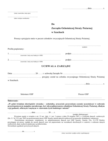 …………………………………., dnia ……………… r. ………………………………………….. (imię i nazwisko, imię ojca) ………………………………………….. (data i miejsce urodzenia) Do Zarządu Ochotniczej Straży Pożarnej w Szachach Proszę o przyjęcie mnie w poczet członków zwyczajnych Ochotniczej Straży Pożarnej. ……………………………………………… (podpis) Prośbę popieramy: 1. ………………………………………………………………………… podpis …………………………………………… (nazwisko i imię oraz funkcja w OSP) 2. ………………………………………………………………………… podpis …………………………………………… (nazwisko i imię oraz funkcja w OSP) UCHWAŁA ZARZĄDU Dnia ……………………………….. 20 ……. r. uchwałą Zarządu Nr ………………………………... ……………………………………………….. przyjęty został na członka zwyczajnego Ochotniczej Straży Pożarnej w Szachach. ……………………………, Sekretarz OSP dnia ………………… r. Prezes OSP …………………………………………………… …………………………………………………… Ślubowanie: „W pełni świadom obowiązków strażaka – ochotnika, uroczyście przyrzekam czynnie uczestniczyć w ochronie przeciwpożarowej majątku narodowego, być zdyscyplinowanym członkiem Ochotniczej Straży Pożarnej, dbałym o jej godność, ofiarnym i mężnym w ratowaniu życia ludzkiego i mienia” …………………………….., dnia ………………. 20 …. r. ………………………………………... (podpis ślubującego) Wyrażam zgodę w związku z art. 23 ust. 1pkt. 1 i ust. 2 ustawy z dnia 29 sierpnia 1997 r. o ochronie danych osobowych (Dz. U. Nr 133, poz. 883) na przetwarzanie przez OSP Szachy moich danych osobowych na potrzeby działalności statutowej. Potwierdzam otrzymanie wiadomości, że administratorem danych jest OSP Szachy, Szachy 22a, 21-570 Drelów przysługuje mi prawo wglądu do moich danych oraz ich poprawianie na warunkach określonych w ustawie o ochronie danych osobowych, dane osobowe podawane są dobrowolnie. Stwierdzam zgodność powyższych danych. ……………………dn.…………… r. ……………………………………………………………………… (imię i nazwisko i podpis osoby wypełniającej)
