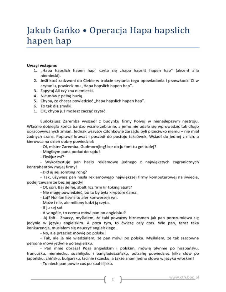 Jakub Gańko • Operacja Hapa hapslich hapen hap Uwagi wstępne: 1. „Hapa hapslich hapen hap” czyta się „hapa hapsliś hapen hap” (akcent a’la niemiecki). 2. Jeśli ktoś zadzwoni do Ciebie w trakcie czytania tego opowiadania i przeszkodzi Ci w czytaniu, powiedz mu „Hapa hapslich hapen hap”. 3. Zapytaj Ali czy zna niemiecki. 4. Nie mów z pełną buzią. 5. Chyba, że chcesz powiedzied „hapa hapslich hapen hap”. 6. To tak dla zmyłki. 1. OK, chyba już możesz zacząd czytad. Eudoksjusz Zaremba wyszedł z budynku firmy Polvuj w nienajlepszym nastroju. Właśnie dobiegło kooca bardzo ważne zebranie, a jemu nie udało się wprowadzid tak długo opracowywanych zmian. Jednak wszyscy członkowie zarządu byli przeciwko niemu – nie miał żadnych szans. Poprawił krawat i poszedł do postoju taksówek. Wsiadł do jednej z nich, a kierowca na dzieo dobry powiedział: - Oł, mister Zaremba. Gudmornjing! Łer do ju łont tu goł tudej? - Mógłbym pana podad do sądu! - Ekskjuz mi? - Wykorzystuje pan hasło reklamowe jednego z największych zagranicznych kontrahentów mojej firmy! - Did aj sej somting rong? - Tak, używasz pan hasła reklamowego największej firmy komputerowej na świecie, podejrzewam że bez jej zgody! - Oł, sori. Baj de łej, abałt łicz firm łir toking abałt? - Nie mogę powiedzied, bo to by była kryptoreklama. - Łaj? Noł łan lisyns tu ałer konwersejszyn. - Może i nie, ale miliony ludzi ją czyta. - If ju sej soł. - A w ogóle, to czemu mówi pan po angielsku? - Aj fołt… Znaczy, myślałem, że taki poważny biznesmen jak pan porozumiewa się jedynie w języku angielskim. A poza tym, to dwiczę cały czas. Wie pan, teraz taka konkurencja, musiałem się nauczyd angielskiego. - No, ale przecież mówię po polsku! - Tak, ale ja nie wiedziałem, że pan mówi po polsku. Myślałem, że tak szacowna persona mówi jedynie po angielsku. - Pan mnie obraża! Poza angielskim i polskim, mówię płynnie po hiszpaosku, francusku, niemiecku, suahilijsku i bangladeszaosku, potrafię powiedzied kilka słów po japoosku, chiosku, bułgarsku, łacinie i czesku, a także znam jedno słowo w języku włoskim! - To niech pan powie coś po suahilijsku. 1 www.cth.boo.pl - Vuja ni mboo… Jak się pan nazywa? - Lubicz. - Ale jak pan ma na imię? - Ryszard. Po co pan się pyta jak się nazywam, skoro chce pan znad moje imię? - Przecież chwilę potem zapytałem się jak pan ma na imię! - No tak, ale najpierw pan się pytał o moje nazwisko. - Nieważne. Niech pan mi przypomni jak ma na imię? - Na imię mam Ryszard. Na nazwisko mam Lubicz, ale pan się nie pytał jak się nazywam, tylko jak mam na imię, więc pragnę zakomunikowad wszem i wobec, że na imię mam Ryszard. Przyjaciele mówią mi Rysio, ale pan jeszcze nie jest moim przyjacielem, więc zostaomy przy Ryszardzie. - Vuja ni mboo, Ryszard! - A co to znaczy? - Ah, nie mogę powiedzied. - Coś brzydkiego. Pan mnie chciał obrazid! - A nawet jeśli – pan mnie już obraził. I do tego okłamał! - Kiedy pana okłamałem? - Pan jest Ryszard Lubicz? - No, tak. - No, a kilkanaście linijek wyżej powiedział pan, że myśli. Dokładnie powiedział pan: „Myślałem, że tak szacowna persona mówi jedynie po angielsku.” Przykro mi, ale nie mogę z panem jechad. Wsiądę do innej taksówki. - A to nawet dobrze, bo teraz sobie przypomniałem, że dzieci chyba rączek rano nie umyły przy śniadaniu. - No i co w związku z tym? - Muszę jechad do szkoły, przerwad lekcję jaką teraz mają, oczywiście uprzednio bardzo serdecznie przepraszając nauczycielkę za tak nagłe wtargnięcie, wziąd je do łazienki, nakrzyczed na nie i, wreszcie, umyd im rączki. - Pan wie, że jest idiotą? - Nic na to nie poradzę, tak przewiduje scenariusz. Do widzenia! Eudoksjusz wysiadł czym prędzej z samochodu i wsiadł do drugiego. Przywitał się z, teraz już sprawiającym wrażenie normalnego, kierowcą i kazał się zawieźd do domu. Zaremba, mimo tego że był współwłaścicielem jednej z największych firm w Polsce i posiadał ogromny kapitał, nie wybudował sobie domu (tak jak zrobili to inni współwłaściciele), tylko mieszkał w mieszkaniu. Fakt – mieszkanie znajdowało się na jednym z najdroższych osiedli w mieście, z całodobową ochroną, ogrzewaniem, ciepłą wodą, kioskiem ruchu na dole i tego typu bajerami – lecz i tak koledzy Zaremby czepiali się go, że woli pieniądze inwestowad, niż wydawad. Na miejscu, Eudoksjusz zapłacił kierowcy, wyszedł z taksówki, przywitał się z ochroniarzem przy bramie i ruszył do swojego mieszkania. Na schodach, jego komórka zaczęła wygrywad melodię z „Janosika”. Mężczyzna wyciągnął telefon z koszuli garnituru i zobaczył na wyświetlaczu napis NUMER ZASTRZEŻONY. Nic dziwnego, większośd poważnych person w Polsce miało zastrzeżony numer. Wcisnął przycisk z zieloną słuchawką, przerywając tym samym przepiękny dzwonek polifoniczny za 3 złote plus vat. - Zaremba, słucham? Cisza. - Słucham? – powtórzył Zaremba. W słuchawce słychad było czyjś oddech. Po chwili dziwny głos powiedział: 2 www.cth.boo.pl - Hapa hapslich hapen hap. - Co? – spytał zdziwiony Eudoksjusz. Odpowiedział mu jedynie odgłos oznaczający przerwanie połączenia. Zaremba spojrzał jeszcze raz na telefon, wzruszył ramionami i doszedł po schodach na swoje piętro. Już miał otworzyd drzwi, gdy poczuł jak coś ostrego wbija mu się pod żebro… - Cześd, Marzena! – rzekł detektyw Rutkowski po wejściu do swojego biura – Jest jakaś robota? - Są dwa zlecenia, ale niezbyt ciekawe, pewnie pana też nie zainteresują. Przed chwilą za to był telefon. - No, o co chodzi? - Zabójstwo. - Kto? - Eudoksjusz Zaremba, jeden z najbogatszych biznesmenów w Polsce. - Gdzie? - Ulica Kwiecista 13, mieszkanie numer 69. - Taki bogaty i mieszkał w bloku? - Też mnie to dziwi. - Dobra, jadę na miejsce. Rutkowski wyszedł z budynku i wszedł do swojego służb