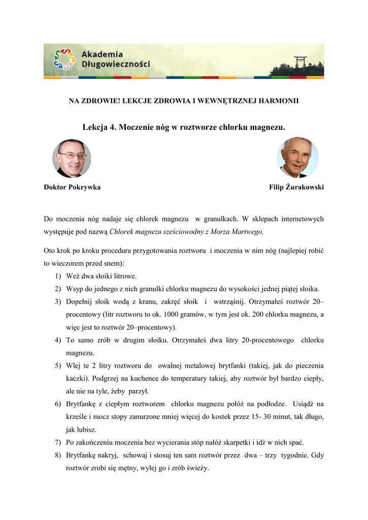 NA ZDROWIE! LEKCJE ZDROWIA I WEWNĘTRZNEJ HARMONII Lekcja 4. Moczenie nóg w roztworze chlorku magnezu. Doktor Pokrywka Filip Żurakowski Do moczenia nóg nadaje się chlorek magnezu w granulkach. W sklepach internetowych występuje pod nazwą Chlorek magnezu sześciowodny z Morza Martwego. Oto krok po kroku procedura przygotowania roztworu i moczenia w nim nóg (najlepiej robić to wieczorem przed snem): 1) Weź dwa słoiki litrowe. 2) Wsyp do jednego z nich granulki chlorku magnezu do wysokości jednej piątej słoika. 3) Dopełnij słoik wodą z kranu, zakręć słoik i wstrząśnij. Otrzymałeś roztwór 20– procentowy (litr roztworu to ok. 1000 gramów, w tym jest ok. 200 chlorku magnezu, a więc jest to roztwór 20–procentowy). 4) To samo zrób w drugim słoiku. Otrzymałeś dwa litry 20-procentowego chlorku magnezu. 5) Wlej te 2 litry roztworu do owalnej metalowej brytfanki (takiej, jak do pieczenia kaczki). Podgrzej na kuchence do temperatury takiej, aby roztwór był bardzo ciepły, ale nie na tyle, żeby parzył. 6) Brytfankę z ciepłym roztworem chlorku magnezu połóż na podłodze. Usiądź na krześle i mocz stopy zanurzone mniej więcej do kostek przez 15- 30 minut, tak długo, jak lubisz. 7) Po zakończeniu moczenia bez wycierania stóp nałóż skarpetki i idź w nich spać. 8) Brytfankę nakryj, schowaj i stosuj ten sam roztwór przez dwa – trzy tygodnie. Gdy roztwór zrobi się mętny, wylej go i zrób świeży. Tak prostego, praktycznego i szczegółowego opisu sposobu przygotowania roztworu do moczenia nóg nie znajdziesz nigdzie, nawet w naszej książce. Został on przygotowany specjalnie dla czytelników Lekcji Zdrowia i Wewnętrznej Harmonii. Na czym polega przewaga metalowej brytfanki? Po pierwsze brytfanka idealnie obejmuje dwie stopy złożone razem dorosłego człowieka i roztwór sięga wtedy do kostek albo powyżej kostek. Po drugie nie musisz codziennie przelewać roztworu ze słoików do miedniczki i z powrotem. Jeśli jednak nie masz i nie zamierzasz kupować metalowej brytfanki, możesz używać do moczenia nóg małej okrągłej plastikowej miedniczki. Wtedy będziesz podgrzewał roztwór ze słoików w metalowym naczyniu i ciepły wlewał do miedniczki. Codziennie po moczeniu będziesz zlewał roztwór do słoików i chował do następnego wieczora. Roztwór w miedniczce będzie sięgał poniżej kostek, ale to też jest ok. W naszych lekcjach tak wiele miejsca poświęcamy magnezowi, ponieważ to właśnie magnez i propagowane przez nas sposoby jego stosowania wzbudzają największe zainteresowanie słuchaczy naszych wystąpień w radiu i telewizji, a także uczestników naszych szkoleń na temat zdrowego stylu życia. Zdjęcie: Szymon Kliszewski Coś dla ducha Harmonia i duchowość oznacza rozwój. I ten rozwój u mnie oznacza, że nie kopiuję już płyt – szanuję prawa autorskie. Pożyczyłem od koleżanki płytę z filmem „Baby są jakieś inne” (znakomita komedia, boki zrywać) i nie skopiuję jej. Jeśli zechcę ją stosować na szkoleniach o treningu mózgu (na temat różnic miedzy mózgiem kobiety i mężczyzny), wtedy ją sobie kupię. Przecież chcę, żeby ludzie kupowali moje książki, prawda? Więc i ja kupuję, a nie kopiuję. Nie kopiuję już także płyt z muzyką. Pożyczam je z biblioteki (tak, w Wałbrzychu w Bibliotece Pod Atlantami jest znakomicie wyposażona fonoteka) albo kupuję. NOWA KSIĄŻKA! Bestseller Sensusa www.drpokrywka.pl www.filip-zurakowski.com Zapraszamy też do odsłuchania wywiadu Redaktor Grażyny Dobroń z Filipem Żurakowskim w radiowej Trójce: http://www.polskieradio.pl/9/306/Artykul/1155689,Omagnezie-czyli-jak-zachowac-zdrowe-kosci-miesnie-i-radosc-zycia