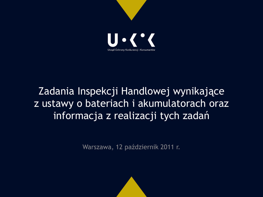 Zadania Inspekcji Handlowej wynikające z ustawy o bateriach i akumulatorach oraz informacja z realizacji tych zadań Warszawa, 12 październik 2011 r. Zadania Inspekcji Handlowej Inspekcja Handlowa jest wyspecjalizowanym organem kontroli powołanym do ochrony interesów i praw konsumentów oraz interesów gospodarczych państwa. Zgodnie z art. 3 ust. 1 pkt 2b) ustawy z dnia 15 grudnia 2000 roku o Inspekcji Handlowej (Dz. U. z 2009 r., nr 151, poz. 1219 z późn. zm.) do zadań Inspekcji Handlowej należy kontrola przestrzegania przez sprzedawców detalicznych i sprzedawców hurtowych przepisów art. 8, art. 9, art. 10 ust. 1, art. 11, art. 31 ust. 3, art. 48-50, art. 53 oraz art. 54 ust. 1 i 2 ustawy z dnia 24 kwietnia 2009 r. o bateriach i akumulatorach (Dz. U. Nr 79, poz. 666). Departament Inspekcji Handlowej Kontrola baterii i akumulatorów W 2010 roku Inspekcja Handlowa przeprowadziła na terenie całego kraju kontrolę prawidłowości obrotu akumulatorami i bateriami. Głównym celem kontroli było przeprowadzenie rozeznania, w jakim stopniu przedsiębiorcy wywiązują się z obowiązków wynikających z ustawy o bateriach i akumulatorach. Kontrolą objęto przedsiębiorców będących w rozumieniu ustawy o bateriach i akumulatorach sprzedawcą detalicznym, hurtowym, przedsiębiorcą świadczącym usługi w zakresie wymiany zużytych baterii lub zużytych akumulatorów oraz sprzedawcą hurtowym i detalicznym oferującym sprzęt elektryczny lub elektroniczny w całości albo w części zasilany bateriami lub akumulatorami lub przystosowany do tego rodzaju zasilania. Ogółem skontrolowano 73 przedsiębiorców, a różnego rodzaju nieprawidłowości stwierdzono u 28 z nich (38,4 proc. skontrolowanych). Departament Inspekcji Handlowej Kontrola baterii i akumulatorów Poza kontrolą podmiotów oferujących baterie i akumulatory sprawdzano także czy wyroby znajdujące się w obrocie spełniają wymagania przepisów. Kontrolą objęto baterie i akumulatory przenośne, baterie i akumulatory samochodowe oraz sprzęt elektryczny lub elektroniczny, który jest w całości albo w części zasilany bateriami lub akumulatorami lub jest przystosowany do tego rodzaju zasilania. Kontrolą objęto 551 partii wyrobów, w tym 294 partie baterii oraz 249 partii akumulatorów oraz 8 partii sprzętu elektrycznego lub elektronicznego zasilanego bateriami lub akumulatorami. Zakwestionowano 48 partii skontrolowanych wyrobów, tj. 8,7 proc. wszystkich skontrolowanych, w tym 35 partii baterii i 13 partii akumulatorów. Departament Inspekcji Handlowej Kontrola baterii i akumulatorów Zgodnie z art. 8 ust. 1 ustawy o bateriach i akumulatorach wprowadzane do obrotu baterie i akumulatory, w tym baterie i akumulatory zamontowane w sprzęcie, nie mogą zawierać więcej niż 0,0005 % wagowo rtęci, z tym że ogniwa guzikowe nie mogą zawierać więcej niż 2 % wagowo rtęci. Ponadto wprowadzane do obrotu baterie przenośne i akumulatory przenośne, w tym zamontowane w sprzęcie, nie mogą zawierać więcej niż 0,002 % wagowo kadmu (art. 8 ust. 2 ww. ustawy) z wyjątkiem baterii przenośnych i akumulatorów przenośnych przeznaczonych do użytku w: systemach awaryjnych i alarmowych, w tym w oświetleniu awaryjnym, urządzeniach medycznych, elektronarzędziach bezprzewodowych (art. 8 ust. 3 ww. ustawy). Departament Inspekcji Handlowej Kontrola baterii i akumulatorów W toku kontroli u sprzedawców hurtowych pobrano do badań 16 partii baterii oraz akumulatorów. Na podstawie badań przeprowadzonych w Specjalistycznym Laboratorium Produktów Włókienniczych i Analizy Instrumentalnej Urzędu Ochrony Konkurencji i Konsumentów w Łodzi w zakresie zawartości kadmu, ołowiu i rtęci, zakwestionowano ogółem 4 partie (co stanowiło 25 proc. przebadanych) z uwagi na: zawyżoną zawartość rtęci – 2 partie wyrobów (w 1 próbce stwierdzono obecność rtęci w ilości 0,0129 ±0,0037 proc., a w drugiej 0,0275 ±0,0077 proc. przy dopuszczalnym poziomie 0,0005 proc.), niewłaściwe oznakowanie, tj. niespełnienie wymagań art. 9 ust. 2 pkt 1 lit. b ustawy o bateriach i akumulatorach z uwagi, że w badanej próbce nieoznakowanej symbolem chemicznym Pb, wykryto obecność ołowiu w ilości przekraczającej 0,004 % wagowo ołowiu – 1 partia wyrobu, Departament Inspekcji Handlowej Kontrola baterii i akumulatorów zawyżoną zawartość kadmu oraz niewłaściwe oznakowanie, tj. niespełnienie wymagań art. 9 ust. 2 pkt 1 lit. a oraz lit. b ustawy o bateriach i akumulatorach – 1 parta produktu. Wobec ujawnionych nieprawidłowości na podstawie art. 10 ust. 5 ustawy o bateriach i akumulatorach wydano 3 decyzje zakazujące na okres 2 miesięcy od dnia doręczenia decyzji, dalszego przekazywania użytkownikowi, konsumentom i dystrybutorom zakwestionowanych wyrobów i zgodnie z art. 10 ust. 7 ww. ustawy przekazano informacje o wynikach kontroli oraz kopie decyzji Głównemu Inspektorowi Ochrony Środowiska. Departament Inspekcji Handlowej Kontrola baterii i akumulatorów Prawidłowość oznakowania baterii i akumulatorów sprawdzano w oparciu o art. 9 ust. 1 ustawy o bateriach i akumulatorach, zgodnie z którym wprowadzane do obrotu baterie i akumulatory, w tym zestawy oraz ogniwa guzikowe, powinny być w sposób widoczny, czytelny i trwały, oznakowane symbolem selektywnego zbierania. W toku kontroli zakwestionowano pod tym względem 5 partii wyrobów z czego: 1 partia baterii została wprowadzona do obrotu w lutym 2009, tj. przed dniem wejścia w życie ustawy o bateriach i akumulatorach, a tym samym na podstawie art. 118 ww. ustawy nie podlegała wycofaniu z obrotu, wobec wprowadzającego 1 partię skierowano wystąpienie pokontrolne. Importer podjął działania naprawcze poprzez oznaczenie baterii symbolem selektywnego zbierania, 3 partie nieoznakowanych baterii zostały wycofane z obrotu i zwrócone do dostawców. Departament Inspekcji Handlowej Kontrola baterii i akumulatorów Wobec jednego z kontrolowanych przedsię