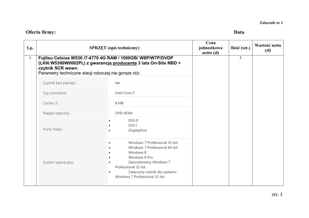 Za cznik nr 2 Oferta firmy: Lp. 1 Data SPRZ T (opis techniczny) Fujitsu Celsius W530 i7-4770 4G RAM / 1000GB/ W8P/W7P/DVDP (LKN:W5300W0002PL) z gwarancj producenta 3 lata On-Site NBD + czytnik SCR wewn. Parametry techniczne stacji roboczej nie gorsze ni : Czytnik kart pami ci tak Typ procesora Intel Core i7 Cache L3 8 MB Nap d optyczny DVD-ROM Porty Video System operacyjny Cena jednostkowa netto (z ) Ilo (szt.) Warto netto (z ) 3 DVI-D DVI-I DisplayPort Windows 7 Professional 32-bit Windows 7 Professional 64-bit Windows 8 Windows 8 Pro Zainstalowany Windows 7 Professional 32-bit Za czony no nik dla systemu Windows 7 Professional 32-bit str. 1 Interfejs sieciowy 10/100/1000 Mbit/s Obudowa Brak danych Rodzaj pami ci DDR3 Taktowanie procesora 3.4 GHz Pozosta e informacje o procesorze Intel ® Core ™ i7-4770 4rdzenie Wy wietlacz Brak yta g ówna Zainstalowana pami D3227 (µATX) RAM 32 GB Pozosta e informacje o pami ci RAM Obs uga pami ci dwukana owych. Co najmniej dwa modu y pami ci. Wydajno na kana musi by taka sama. Pojemno 1000 GB HDD Pozosta e parametry HDD Dysk twardy HDD SATA III, 7200 rpm, 1000 GB, 3.5 cala Karta graficzna Intel® HD Graphics P4600 Karta d wi kowa Realtek ALC671 cza dost pne na p ycie cza zewn trzne - 1 x PCI-Express 3.0 x16 - 1x PCI-Express 2.0 x4 - 2 x PCI-Express x1 - 1 x Audio: wej cie liniowe / mikrofon - 1 x Audio: wej cie liniowe - 1 x Audio: wyj cie liniowe - 1 x Przednie audio: s uchawkowe - 1 x Przednie audio: mikrofon - 9 x USB 2.0 cznie - 2x 2.0/ 2x 3.0 x USB przód str. 2 - 2x 2.0 + 1x 2.0 x Wewn trzny port USB - 4x 2.0 / 2x 3.0 x Tylny port USB - 1 (opcjonalne drugie z cze DisplayPort) x DisplayPort - 1 (opcja) x Równoleg y (25-pinowe z EPP i ECP) - 1 x Szeregowy (RS-232, 9-pinowe, 16bajtowe FIFO, kompatybilno z 16550) - 1 x VGA - 1 x Ethernet (RJ-45) - 1 (DVI-D) x DVI - 1 (opcja) x eSATA - 2 x Mysz / klawiatura (PS/2) Kolor Czarny Informacje o gwarancji 3 lata Bring-In / serwis u klienta Wymiary 175 x 419 x 395 mm Waga 11 kg Dodatkowe oprogramowanie - Ochrona stanowiska pracy (rozwi zanie bezpiecznego uwierzytelniania) - Adobe® Reader® - McAfee Multi Access (antywirus i zabezpieczenie internetowe, 60-dniowa wersja próbna) - Win7: Fujitsu Recovery (przywracanie z dysku twardego) - Win8: Microsoft Push Button Recovery (przywracanie z dysku twardego) str. 3 2 BenQ Monitor LED BL912 19'', DVI, flicker-Free Model BL912 9H.LAPLB.QPE Format ekranu standardowy Przek tna ekranu 19" Typ matrycy TFT-TN Ekran dotykowy Nie Technologia pod wietlania Diody LED Plamka matrycy 0.294 mm Rozdzielczo 1280 x 1024 (SXGA) Czas reakcji 5 ms Jasno 250 cd/m2 Kontrast Contrast ratio (typical)1000:1 Contrast ratio (dynamic)12000000:1 t widzenia poziomy 170 stopni t widzenia pionowy 160 stopni Ilo kolorów 16,7 mln 15-pin D-Sub DVI Gniazda wej ciowe Wbudowane g 3 niki nie Wbudowany tuner TV brak Pivot nie Monta na cianie VESA 100 x 100 str. 4 3 Pobór mocy 18 W Kolor czarny Wymiary Szeroko 416 mm boko 178 mm Wysoko 424.5 mm Waga 3.5 kg HP EliteBook 8770w i5-3360M 17.3 LED FHD 4GB/500 DVDRW FirePRO M4000 Win7 Pro (LY561EA) + HP CarePack 3y On-Site NBD (U4414E) + 3 komorowa wysokiej jako ci torba do notebook’a + mysz bezprzewodowa Bluetooth Parametry techniczne stacji roboczej nie gorsze ni : Model EliteBook 8770w Typ procesora Intel Core i5 Cache L3 3 MB Taktowanie procesora 2.8 GHz Pozosta e informacje o procesorze Intel Core i5 3360M Przek tna ekranu 17,3'' Rozdzielczo 1920 x 1080 (HD 1080) Powierzchnia matrycy matowa Pozosta e informacje o matrycy Pod wietlenie LED Karta graficzna ATI FirePro M4000 1GB Zainstalowana pami Max. wielko RAM pami ci Rodzaj pami ci 1 4 GB 16 GB SODIMM DDR3 str. 5 Pozosta e informacje o pami ci RAM 1600 Mhz Pojemno 500 GB HDD Pozosta e parametry HDD 7200 rpm Nap d optyczny DVD±RW Komunikacja LAN 10/100/1000 WiFi 802.11 a/b/g/n Bluetooth Gniazda rozszerze Czytnik kart procesorowych (SmartCard) Express Card 34 Liczba portów USB 5 W tym USB 3.0 2 Port COM Nie Port LPT Nie VGA (15 pin D-Sub) DisplayPort Porty Video Czytnik kart pami ci tak Pozosta e porty we/wy 1 port combo eSATA 1 port 1394a 1 wej cie mikrofonu stereo 1 wyj cie s uchawek stereo/wyj cie sygna owe audio 1 gniazdo RJ-11 1 z cze dokowania 1 z cze akumulatora dodatkowego str. 6 Kamera internetowa 2,0 MPix Czytnik linii papilarnych Tak wi k 4 SRS Premium Sound PRO Bateria Typ baterii: Li-Ion Czas pracy na baterii [min]: 270 Liczba komór baterii: 8 System operacyjny Windows 7 Professional 64-bit – do czony no nik oprogramowania Wymiary Szeroko [mm]: 417 boko [mm]: 273 Wysoko [mm]: 37 Waga 3.5 kg Stacja dokuj ca HP 2012 230W Advanced WKS Docking Station (A7E38AA) z 3 letni gwarancj producenta – HP CarePack 3y (UC296E) Specyfikacja techniczna cza: - D-Sub, - 2 x DVI, - 2 x DisplayPort, - eSATA, - 4 x USB 3.0, - 1 x USB 2.0, - 1 x USB 2.0 powered, - 2 x PS/2, - RJ-45, - COM, - LPT, - wyj cie s uchawkowe, - wej cie mikrofonowe, - zasilania, 1 str. 7 - slot na link zabezpieczaj , - wn ka na dysk twardy lub nap d optyczny Gwarancje: - Komputery – 36 m-cy w miejscu eksploatacji - Notebooki – 36 m-cy w miejscu eksploatacji - Monitory – 36 m-cy - Stacja dokuj ca 36 m-cy Warto netto (z ) Stawka VAT Kwota VAT Warto brutto (z ) Podpis osoby uprawnionej do reprezentacji wykonawcy str. 8