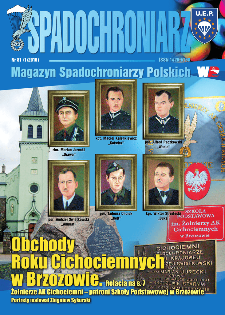 SPIS TREŚCI • Słowo wstępne – Prezes ZG ZPS gen. dyw. (w st. spocz.) Jan Kempara . . . 1 ROK 2016 ROKIEM CICHOCIEMNYCH • 2016 r. Rokiem Cichociemnych . . . . . . . . . . . . . . . . . . . . . . . . . . . . . . . . . . 2 • Walczyli o wolną Polskę . . . . . . . . . . . . . . . . . . . . . . . . . . . . . . . . . . . . . . . . . . 3 • Pierwszy zrzut . . . . . . . . . . . . . . . . . . . . . . . . . . . . . . . . . . . . . . . . . . . . . . . . . . . 4 • Rok Cichociemnych w Brzozowie . . . . . . . . . . . . . . . . . . . . . . . . . . . . . . . . . 7 • Konkurs„Cichociemni …wracali do ojczyzny pod osłoną nocy” . . . . 8 Z ŻYCIA ZWIĄZKU POLSKICH SPADOCHRONIARZY • Plenarne posiedzenie Zarządu Głównego ZPS . . . . . . . . . . . . . . . . . . . . • Uchwała ZG ZPS w sprawie określ. wzoru stroju organizacyjnego . . . . • Zaproszenie na Dzień z Mistrzami Sportów Lotniczych . . . . . . . . . . . • Konkurs„Gen. E. Rozłubirski – dowódca, żołnierz, człowiek” . . . . . . . . . . . 9 11 12 13 SPORT SPADOCHRONOWY • World Air Games Dubai 2015 . . . . . . . . . . . . . . . . . . . . . . . . . . . . . . . . . . . . . • Rzeszów w tunelu . . . . . . . . . . . . . . . . . . . . . . . . . . . . . . . . . . . . . . . . . . . . . . . . • Spadochronowe Mistrzostwa Śląska 2015 w Gliwicach . . . . . . . . . . . . • Spadochronowe podsumowanie sezonu 2015 . . . . . . . . . . . . . . . . . . . . 14 15 16 17 Z ŻYCIA ODDZIAŁÓW ZPS • W świątecznym nastroju… . . . . . . . . . . . . . . . . . . . . . . . . . . . . . . . . . . . . . . . • 25 lat IV Oddziału ZPS w Inowrocławiu . . . . . . . . . . . . . . . . . . . . . . . . . . . • Podsumowanie 25-letniej kadencji ZPS w Kole nr 1 Spadochroniarzy Krakowskich . . . . . . . . . . . . . . . . . . . . . . . . . . • W trosce o rytm społecznej aktywności . . . . . . . . . . . . . . . . . . . . . . . . . . . • Twardo po ziemi z finezją w przestworzach . . . . . . . . . . . . . . . . . . . . . . • Piknik spadochronowo-lotniczy w Goleszowie . . . . . . . . . . . . . . . . . . . . • Gryf Zachodniopomorski dla III Oddziału ZPS w Dziwnowie . . . . . . . • Spotkanie wigilijne w III Oddziale . . . . . . . . . . . . . . . . . . . . . . . . . . . . . . . . . • Bal XXVII Oddziału ZPS w Siedlcach . . . . . . . . . . . . . . . . . . . . . . . . . . . . . . . • Spotkanie opłatkowe XXVII Oddziału ZPS w Siedlcach . . . . . . . . . . . . . 18 19 22 24 25 26 27 27 28 30 WIADOMOŚCI Z 6. BPD • Polscy spadochroniarze w operacji„Toy Drop” . . . . . . . . . . . . . . . . . . . . . . . 31 • Spadochroniarze na poligonie w Nowej Dębie . . . . . . . . . . . . . . . . . . . . . . 32 • Ogniowy poligon spadochroniarzy . . . . . . . . . . . . . . . . . . . . . . . . . . . . . . . 33 WIADOMOŚCI Z 25. BKPOW. • Polacy i Kanadyjczycy szkolą się dalej . . . . . . . . . . . . . . . . . . . . . . . . . . . . . . . 34 • Polsko-kanadyjskie szkolenie spadochronowe . . . . . . . . . . . . . . . . . . . . 35 REPORTAŻE – WYWIADY – WSPOMNIENIA • Wizyta XXVII Oddz. ZPS w Siedlcach w Domu Dziecka . . . . . . . . . . . . . • CIU-PA-GA . . . . . . . . . . . . . . . . . . . . . . . . . . . . . . . . . . . . . . . . . . . . . . . . . . . . . . . • 4101 Dziwnów – film o komandosach 1. bat. szturmowego . . . . . . . • Plan działania Koła Historyczno-Krajoznawczego na rok 2016 . . . . . • Daj się ponieść przygodzie . . . . . . . . . . . . . . . . . . . . . . . . . . . . . . . . . . . . . . . 36 38 40 41 42 WOJSKO I HISTORIA SPADOCHRONIARSTWA • 75. rocznica zrzutu Cichociemnych – Dębowiec 2016 . . . . . . . . . . . . . • Kapelani 1. Samodzielnej Brygady Spadochronowej, cz. I . . . . . . . . . . • „Zielone diabły” z orłem w koronie . . . . . . . . . . . . . . . . . . . . . . . . . . . . . . . • Święto Kompanii Commando . . . . . . . . . . . . . . . . . . . . . . . . . . . . . . . . . . . . • Świadczyć posługę miłosierdzia . . . . . . . . . . . . . . . . . . . . . . . . . . . . . . . . . . 44 46 47 49 50 Z ŻAŁOBNEJ KARTY • Pożegnanie gen. dyw. Adama Rębacza . . . . . . . . . . . . . . . . . . . . . . . . . . . • Wspomnienie o por. inż. Kazimierzu Kaweckim . . . . . . . . . . . . . . . . . . . • Pożegnanie ppłk. Romana Michałka . . . . . . . . . . . . . . . . . . . . . . . . . . . . . . • Pożegnanie płk. Tadeusza Celeja . . . . . . . . . . . . . . . . . . . . . . . . . . . . . . . . . • Pożegnanie Tadeusza Jana Łaukajtysa . . . . . . . . . . . . . . . . . . . . . . . . . . . 51 52 52 53 53 • Spadochroniarze ćwiczyli w mroźnej Kanadzie . . . . . . . . . . . okładka s. 4 APEL DO CZYTELNIKÓW „SPADOCHRONIARZA” Szanowni Czytelnicy! Aktualne wpływy finansowe do Zarządu Głównego ZPS w coraz większym stopniu ograniczają prowadzenie działalności bieżącej naszego Związku. Przewidywane w przyszłości dochody, głównie z działalności naszych podmiotów gospodarczych, mają tendencję spadkową i wskazują na dalsze pogorszanie się kondycji finansowej. Ta pogarszająca się sytuacja finansowa stanowi poważne zagrożenie również dla kwartalnika „Spadochroniarz”, który w coraz mniejszym stopniu może być finansowany przez ZG ZPS. Dalsze utrzymanie tego stanu może skutkować zminimalizowaniem, a w konsekwencji nawet zaprzestaniem wydawania „Spadochroniarza”. Jedynym wyjściem na utrzymanie tego wydawnictwa i nie zaprzepaszczenie ponad dwudziestoletniego dorobku, wydaje się być powrót do praktykowanej już w przeszłości dobrowolnej wpłaty na utworzony na subkoncie ZG ZPS tzw. „fundusz wydawniczy”. Jest to zgodne z podjętą na posiedzeniu ZG w grudniu ubiegłego roku uchwałą o samofinansowaniu wydawnictwa „Spadochroniarz”. W związku z tym, Rada Redakcyjna i Redakcja „Spadochroniarza” zwraca się do Was, drodzy czytelnicy poczytnego magazynu polskich spadochroniarzy, o dokonywanie dowolnych opłat na niżej pod