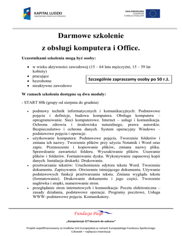 Darmowe szkolenie z obsługi komputera i Office. Uczestnikami szkolenia mogą być osoby:  w wieku aktywności zawodowej (15 – 64 lata mężczyźni, 15 – 59 lat kobiety)  pracujące Szczególnie zapraszamy osoby po 50 r.ż.  bezrobotne  nieaktywne zawodowo W ramach szkolenia dostępne są dwa moduły: - START 80h (grupy od sierpnia do grudnia)     podstawy technik informatycznych i komunikacyjnych: Podstawowe pojęcia i definicje, budowa komputera. Obsługa komputera – oprogramowanie. Sieci komputerowe. Internet – usługi i komunikacja. Ochrona zdrowia i środowiska naturalnego, prawa autorskie. Bezpieczeństwo i ochrona danych. System operacyjny Windows – podstawowe pojęcia i operacje. użytkowanie komputera: Podstawowe pojęcia. Tworzenie folderów i zmiana ich nazwy. Tworzenie plików przy użyciu Notatnik i Word oraz zapis. Przenoszenie i kopiowanie plików, zmiana nazwy pliku. Sprawdzanie zawartości folderu. Wyszukiwanie plików. Usuwanie plików i folderów. Formatowanie dysku. Wykonywanie zapasowej kopii danych. Instalacja drukarki. Drukowanie. przetwarzanie tekstów: Uruchomienie edytora tekstu Word. Tworzenie dokumentu. Zapisywanie. Otwieranie istniejącego dokumentu. Używanie podstawowych funkcji przetwarzania tekstu. Zmiana wyglądu tekstu (formatowanie). Drukowanie dokumentu i jego części. Tworzenie nagłówka i stopki, numerowanie stron. przeglądanie stron internetowych i komunikacja: Poczta elektroniczna – zasady działania, podstawowe operacje. Programy pocztowe, Usługa WWW–podstawowe pojęcia. Komunikatory. „Kompetencje ICT kluczem do sukcesu” Projekt współfinansowany ze środków Unii Europejskiej w ramach Europejskiego Funduszu Społecznego Człowiek – najlepsza inwestycja -CORE 120h (grupy od stycznia do czerwca)  wszystkie opisane w START  arkusze kalkulacyjne: Uruchomienie arkusza kalkulacyjnego Excel. Korzystanie z funkcji Pomocy. Tworzenie, otwieranie i zapisywanie skoroszytu. Podstawowe operacje. Formatowanie komórek i sortowanie danych. Tworzenie arkusza kalkulacyjnego, funkcje, operacje, wykresy, analiza danych. bazy danych: Otwieranie i przeglądanie istniejącej bazy danych. Tworzenie bazy danych. Projektowanie bazy danych. Tworzenie tabeli. Definiowanie kluczy. Wprowadzanie danych – operacje na rekordach. Praca z polami (kolumnami). Kwerendy. Zapisywanie danych na dysku. grafika menedżerska i prezentacyjna: Podstawowe definicje. Rozpoczęcie pracy z programem MS PowerPoint. Zapisywanie danych na dysku. Obszar roboczy programu PowerPoint. Dodawanie nowych slajdów. Edycja slajdów. Dodawanie do slajdów pól tekstowych, wykresów. Efektowne przejścia między slajdami. Animacja i dźwięk. Hiperprezentacja. Przyciski akcji. Zakończenie pracy z MS PowerPoint.   Więcej informacji na www.ict.pasje.org.pl Liczba miejsc ograniczona! Fundacja „Pasje” ul. Obozowa 62, 01-426 Warszawa tel. 22 836 23 64 e-mail: [email protected] „Kompetencje ICT kluczem do sukcesu” Projekt współfinansowany ze środków Unii Europejskiej w ramach Europejskiego Funduszu Społecznego Człowiek – najlepsza inwestycja
