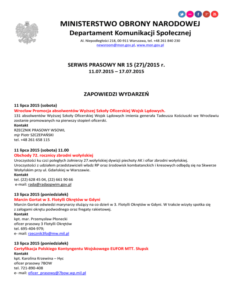 MINISTERSTWO OBRONY NARODOWEJ Departament Komunikacji Społecznej Al. Niepodległości 218, 00-911 Warszawa, tel. +48 261 840 230 [email protected], www.mon.gov.pl SERWIS PRASOWY NR 15 (27)/2015 r. 11.07.2015 – 17.07.2015 ZAPOWIEDZI WYDARZEŃ 11 lipca 2015 (sobota) Wrocław Promocja absolwentów Wyższej Szkoły Oficerskiej Wojsk Lądowych. 131 absolwentów Wyższej Szkoły Oficerskiej Wojsk Lądowych imienia generała Tadeusza Kościuszki we Wrocławiu zostanie promowanych na pierwszy stopień oficerski. Kontakt RZECZNIK PRASOWY WSOWL mjr Piotr SZCZEPAŃSKI tel. +48 261 658 115 11 lipca 2015 (sobota) 11.00 Obchody 72. rocznicy zbrodni wołyńskiej Uroczystości ku czci poległych żołnierzy 27.wołyńskiej dywizji piechoty AK i ofiar zbrodni wołyńskiej. Uroczystości z udziałem przedstawicieli władz RP oraz środowisk kombatanckich i kresowych odbędą się na Skwerze Wołyńskim przy ul. Gdańskiej w Warszawie. Kontakt tel. (22) 628 45 04, (22) 661 90 66 e-mail: [email protected] 13 lipca 2015 (poniedziałek) Marcin Gortat w 3. Flotylli Okrętów w Gdyni Marcin Gortat odwiedzi marynarzy służący na co dzień w 3. Flotylli Okrętów w Gdyni. W trakcie wizyty spotka się z załogami okrętu podwodnego oraz fregaty rakietowej. Kontakt kpt. mar. Przemysław Płonecki oficer prasowy 3 Flotylli Okrętów tel. 695-404-979; e- mail: [email protected] 13 lipca 2015 (poniedziałek) Certyfikacja Polskiego Kontyngentu Wojskowego EUFOR MTT. Słupsk Kontakt kpt. Karolina Krzewina – Hyc oficer prasowy 7BOW tel. 721-890-408 e- mail: [email protected] 14 lipca 2015 (wtorek) Zegrze Akcja honorowego krwiodawstwa z udziałem żołnierzy i pracowników wojska. Kontakt kpt. Krzysztof Baran oficer prasowy CSŁiI tel. 722-380-054 261-883-378 e-mail: [email protected] ĆWICZENIA Lipiec- wrzesień 2015 Airborne Detachment Żołnierze z 6 Brygady Powietrznodesantowej oraz amerykańscy z 2 Regimentu Kawalerii i 173 Powietrznodesantowej Brygadowej Grupy Bojowej Piechoty przez trzy miesiące szkolą się na terenie Polski. Zasadniczym celem ćwiczenia jest doskonalenie sojuszniczej współpracy w zakresie prowadzenia działań przez wojska powietrznodesantowe na współczesnym polu walki. Kontakt kpt. Marcin GIL tel: 261 13 47 71 tel. kom. 693 357 110 e-mail: [email protected] KRONIKA 5 lipca 2015 (niedziela) Oświadczenie SKW w związku z doniesieniami opublikowanymi na portalu tygodnika "DO RZECZY"... Więcej... 6 lipca 2015 (poniedziałek) Zmiana właściwości procesowej ŻW 1 lipca br. weszła w życie zmiana i rozszerzenie karno-procesowej kompetencji Żandarmerii Wojskowej. zdjęcie - Zmiana właściwości procesowej ŻW Więcej... 06 lipca 2015 (poniedziałek) Oświadczenie wicepremiera Tomasza Siemoniaka W związku z ostatnią publikacją tygodnika „Do Rzeczy", oświadczam, że nigdy i w żaden sposób nie byłem związany z żadną sprawą korupcyjną lub nieprawidłowościami. Nigdy nie naruszyłem prawa wypełniając zadania szefa resortu obrony. Więcej... 07 lipca 2015 (wtorek) Kolejny sukces ŻW w walce z korupcją We wtorek Żandarmeria Wojskowa dokonała zatrzymań 12 osób wchodzących w skład zorganizowanej grupy przestępczej związanej z działalnością Rejonowego Zarządu Infrastruktury w Bydgoszczy. Więcej… 08 lipca 2015 (środa) Znak normalności Wiceminister obrony narodowej Robert Kupiecki o znaczeniu intensyfikacji ćwiczeń NATO w Polsce, kolektywnej obronie i stałej rotacyjnej obecności wojsk sojuszniczych w naszym kraju mówił w wywiadzie dla Polski Zbrojnej. Więcej...