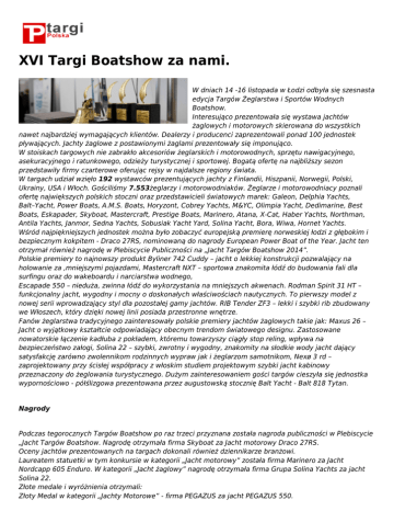 XVI Targi Boatshow za nami. W dniach 14 -16 listopada w Łodzi odbyła się szesnasta edycja Targów Żeglarstwa i Sportów Wodnych Boatshow. Interesująco prezentowała się wystawa jachtów żaglowych i motorowych skierowana do wszystkich nawet najbardziej wymagających klientów. Dealerzy i producenci zaprezentowali ponad 100 jednostek pływających. Jachty żaglowe z postawionymi żaglami prezentowały się imponująco. W stoiskach targowych nie zabrakło akcesoriów żeglarskich i motorowodnych, sprzętu nawigacyjnego, asekuracyjnego i ratunkowego, odzieży turystycznej i sportowej. Bogatą ofertę na najbliższy sezon przedstawiły firmy czarterowe oferując rejsy w najdalsze regiony świata. W targach udział wzięło 192 wystawców prezentujących jachty z Finlandii, Hiszpanii, Norwegii, Polski, Ukrainy, USA i Włoch. Gościliśmy 7.553żeglarzy i motorowodniaków. Żeglarze i motorowodniacy poznali ofertę największych polskich stoczni oraz przedstawicieli światowych marek: Galeon, Delphia Yachts, Balt–Yacht, Power Boats, A.M.S. Boats, Horyzont, Cobrey Yachts, M&YC, Olimpia Yacht, Dedimarine, Best Boats, Eskapader, Skyboat, Mastercraft, Prestige Boats, Marinero, Atana, X-Cat, Haber Yachts, Northman, Antila Yachts, Janmor, Sedna Yachts, Sobusiak Yacht Yard, Solina Yacht, Bora, Wiwa, Hornet Yachts. Wśród najpiękniejszych jednostek można było zobaczyć europejską premierę norweskiej łodzi z głębokim i bezpiecznym kokpitem - Draco 27RS, nominowaną do nagrody European Power Boat of the Year. Jacht ten otrzymał również nagrodę w Plebiscycie Publiczności na „Jacht Targów Boatshow 2014”. Polskie premiery to najnowszy produkt Byliner 742 Cuddy – jacht o lekkiej konstrukcji pozwalający na holowanie za ,mniejszymi pojazdami, Mastercraft NXT – sportowa znakomita łódź do budowania fali dla surfingu oraz do wakeboardu i narciarstwa wodnego, Escapade 550 – nieduża, zwinna łódź do wykorzystania na mniejszych akwenach. Rodman Spirit 31 HT – funkcjonalny jacht, wygodny i mocny o doskonałych właściwościach nautycznych. To pierwszy model z nowej serii wprowadzający styl dla pozostałej gamy jachtów. RIB Tender ZF3 – lekki i szybki rib zbudowany we Włoszech, który dzięki nowej linii posiada przestronne wnętrze. Fanów żeglarstwa tradycyjnego zainteresowały polskie premiery jachtów żaglowych takie jak: Maxus 26 – Jacht o wyjątkowy kształtcie odpowiadający obecnym trendom światowego designu. Zastosowane nowatorskie łączenie kadłuba z pokładem, któremu towarzyszy ciągły stop reling, wpływa na bezpieczeństwo załogi, Solina 22 – szybki, zwrotny i wygodny, znakomity na słodkie wody jacht dający satysfakcję zarówno zwolennikom rodzinnych wypraw jak i żeglarzom samotnikom, Nexø 3 rd – zaprojektowany przy ścisłej współpracy z włoskim studiem projektowym szybki jacht kabinowy przeznaczony do żeglowania turystycznego. Dużym zainteresowaniem gości targów cieszyła się jednostka wypornościowo - półślizgowa prezentowana przez augustowską stocznię Balt Yacht - Balt 818 Tytan. Nagrody Podczas tegorocznych Targów Boatshow po raz trzeci przyznana została nagroda publiczności w Plebiscycie „Jacht Targów Boatshow. Nagrodę otrzymała firma Skyboat za Jacht motorowy Draco 27RS. Oceny jachtów prezentowanych na targach dokonali również dziennikarze branżowi. Laureatem statuetki w tym konkursie w kategorii „Jacht motorowy” została firma Marinero za Jacht Nordcapp 605 Enduro. W kategorii „Jacht żaglowy” nagrodę otrzymała firma Grupa Solina Yachts za jacht Solina 22. Złote medale i wyróżnienia otrzymali: Złoty Medal w kategorii „Jachty Motorowe” - firma PEGAZUS za jacht PEGAZUS 550. Wyróżnienie dla firmy BEST BOATS SERVICE Sp. z o.o. za jacht RODMAN SPIRIT 31 HT. Złoty Medal w kategorii „Jachty Żaglowe” – Stocznia Northman za jacht MAXUS 26. Wyróżnienie dla firmy Sułkowski Boats za jacht NEXO THIRD. Złoty Medal w kategorii „Wyposażenie, osprzęt, usługi…”: otrzymała firma TAURUS za silnik przyczepny EVINRUDE E-Tec G2. Wyróżnienie dla firmy DECATHLON za kamizelkę IZEBER. Po raz pierwszy wręczona została statuetka za „Innowacyjny Produkt Targów Boatshow”. Statuetkę otrzymała firma MASTRCRAFT za „GEN2 system” – system wytwarzania fali do surfingu. „Złoty Dzwon” Polskiego Związku Żeglarskiego otrzymał za całokształt Pan Michał Korneszczuk (Nautica Nord) Wszystkim wyróżnionym serdecznie gratulujemy. Prezentacje, warsztaty, koncerty. W trakcie targów odbywało się szereg imprez towarzyszących a szczególnym zainteresowaniem cieszyły się warsztaty z nawigacji tradycyjnej i elektronicznej, warsztaty meteorologiczne, ABC radiooperatora, prezentacje: jak bezpieczne pływać z dziećmi, najczęstsze wypadki na wodzie, „Jeśli na morze to z jachtem kilowym”, trym żagli… W tawernie targowej można było spotkać się i posłuchać muzyki szantowej. Każdego dnia odbywały się koncerty „Live”. Zaprezentowały się takie grupy jak Mariusz Qcza Kuczewski, Ostatnie Takie Trio, EKT Gdynia oraz Flash Creep. Uprzejmie dziękujemy wystawcom, zwiedzającym, patronom i mediom za udział w tegorocznej edycji Targów Żeglarstwa i Sportów Wodnych Boatshow. Mamy nadzieję, że pobyt na targach spełnił Państwa oczekiwania i przyniósł oczekiwane efekty. Informujemy, rozpoczęliśmy prace nad XVII edycją Targów Żeglarstwa i Sportów Wodnych Boatshow, które odbędą się w Łodzi w dniach 20-22 listopada 2015 roku. Zapraszamy