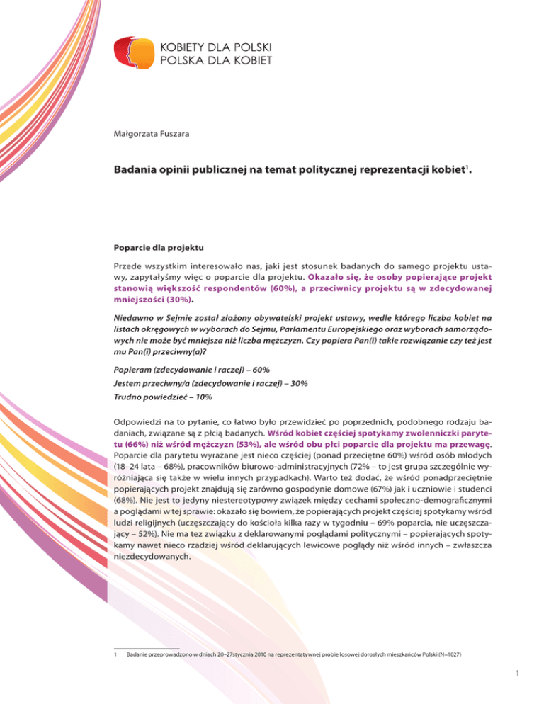 Małgorzata Fuszara Badania opinii publicznej na temat politycznej reprezentacji kobiet1. Poparcie dla projektu Przede wszystkim interesowało nas, jaki jest stosunek badanych do samego projektu ustawy, zapytałyśmy więc o poparcie dla projektu. Okazało się, że osoby popierające projekt stanowią większość respondentów (60%), a przeciwnicy projektu są w zdecydowanej mniejszości (30%). Niedawno w Sejmie został złożony obywatelski projekt ustawy, wedle którego liczba kobiet na listach okręgowych w wyborach do Sejmu, Parlamentu Europejskiego oraz wyborach samorządowych nie może być mniejsza niż liczba mężczyzn. Czy popiera Pan(i) takie rozwiązanie czy też jest mu Pan(i) przeciwny(a)? Popieram (zdecydowanie i raczej) – 60% Jestem przeciwny/a (zdecydowanie i raczej) – 30% Trudno powiedzieć – 10% Odpowiedzi na to pytanie, co łatwo było przewidzieć po poprzednich, podobnego rodzaju badaniach, związane są z płcią badanych. Wśród kobiet częściej spotykamy zwolenniczki parytetu (66%) niż wśród mężczyzn (53%), ale wśród obu płci poparcie dla projektu ma przewagę. Poparcie dla parytetu wyrażane jest nieco częściej (ponad przeciętne 60%) wśród osób młodych (18–24 lata – 68%), pracowników biurowo-administracyjnych (72% – to jest grupa szczególnie wyróżniająca się także w wielu innych przypadkach). Warto też dodać, że wśród ponadprzeciętnie popierających projekt znajdują się zarówno gospodynie domowe (67%) jak i uczniowie i studenci (68%). Nie jest to jedyny niestereotypowy związek między cechami społeczno-demograficznymi a poglądami w tej sprawie: okazało się bowiem, że popierających projekt częściej spotykamy wśród ludzi religijnych (uczęszczający do kościoła kilka razy w tygodniu – 69% poparcia, nie uczęszczający – 52%). Nie ma tez związku z deklarowanymi poglądami politycznymi – popierających spotykamy nawet nieco rzadziej wśród deklarujących lewicowe poglądy niż wśród innych – zwłaszcza niezdecydowanych. 1 Badanie przeprowadzono w dniach 20–27stycznia 2010 na reprezentatywnej próbie losowej dorosłych mieszkańców Polski (N=1027) 1 Warto jeszcze dodać, zwłaszcza wobec spotykanych często argumentów o niechęci kobiet do kandydowania, że respondenci przekonani są, że system kwotowy zachęciłby kobiety do startu w wyborach. Pogląd taki podzielają zarówno kobiety (68%) jak i mężczyźni (63%). Obecnie mniej kobiet niż mężczyzn jest umieszczanych na listach wyborczych. Czy, Pana(i) zdaniem, zapewnienie kobietom określonego procentu (minimum) miejsc na listach wyborczych zachęciłoby je do uczestnictwa w polityce, czy też nie? Tak i raczej tak – 66% Nie i raczej nie – 24% Trudno powiedzieć – 10% Gotowość do głosowania na kobiety Wiele mitów narosło w Polsce wokół tego, czy elektorat sprzyja kobietom, kto gotów jest głosować na kobiety. Nasze badania wskazują, że wśród badanych, którzy deklarują w tej chwili, na kogo gotowi/e byliby/byłyby głosować, częściej spotykamy osoby deklarujące chęć głosowania na kobiety niż na mężczyzn. Gdyby miał(a) Pan(i) do wyboru kobietę i mężczyznę, którzy startowaliby w wyborach do Sejmu z tej samej listy, byli w podobnym wieku, mieli podobne wykształcenie, kompetencje oraz doświadczenie w polityce, to na kogo by Pan(i) głosował(a)? Raczej na mężczyznę – 26% Raczej na kobietę – 40% Nie chodzę na wybory – 10% Trudno powiedzieć – 24% W tym przypadku związek z płcią jest niezwykle silny – większość badanych kobiet zadeklarowała, że chce głosować na kobietę (56%!), a tylko 23% mężczyzn również dokonuje takiego wyboru. Mężczyźni zdecydowanie częściej (36%) niż kobiety (16%) są skłonni wybierać mężczyzn. Ponadto na kobiety często chcą głosować osoby z największych miast, ze skrajnych grup – o podstawowym i wyższym wykształceniu, osoby często uczestniczące w praktykach religijnych częściej niż w nich nie uczestniczące, ponownie zdecydowanie wyróżniają się pracownicy administracyjno-biurowi – w tej grupie aż 60% chce głosować na kobietę. Wbrew stereotypom bierność wyborczą zadeklarowało nieco więcej mężczyzn niż kobiet. 2 Przewidywane skutki zwiększenia obecności kobiet w polityce Bardzo znaczące różnice w poglądach kobiet i mężczyzn zaznaczyły się w przypadku poglądów dotyczących udziału kobiet w życiu publicznym. O ile większość kobiet uważa, że więcej kobiet niż obecnie powinno sprawować odpowiedzialne funkcje w życiu publicznym (kobiety – 53%, mężczyźni – 34%), to mężczyźni znacznie częściej niż kobiety uważają, że sprawujących takie funkcje kobiet jest obecnie tyle, ile powinno być (mężczyźni – 44%, kobiety – 26%). Ciekawy i zwracający uwagę jest fakt, że niezależnie od tych różnic, respondentki i respondenci przewidują przede wszystkim pozytywne skutki większej obecności kobiet w polityce. Zdaniem badanych wzrost liczby kobiet w sferze publicznej zapewniłby zwłaszcza lepszą reprezentację interesów kobiet – aż 80% deklaruje takie przekonanie. Co ciekawe – pogląd taki nie zależy od płci (k–81%, m–79%). Można więc przypuszczać, że tym samym respondentki i respondenci nie są dobrego zdania o obecnej reprezentacji interesów kobiet. Większość badanych uważa także, że większa obecność kobiet przyczyniłaby się do przywiązywania większej wagi do spraw społecznych (73%), większej współpracy w polityce, bardziej merytorycznej pracy w instytucjach, w których większa byłaby obecność kobiet (ponad 60%), zmniejszenia liczby konfliktów, wzrostu uczciwości i zmniejszenia korupcji (54%). We wszystkich tych przypadkach kobiety częściej niż mężczyźni przekonane są o korzyściach płynących ze zwiększenia obecności kobiet w polityce. Zwłaszcza zauważalne to jest w przypadku ocen odnoszących się do współpracy – aż 70%