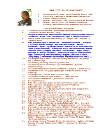 KIM JEST ZENON DYLEWSKI? 1. 2. 3. 4. 5. 6. 7. 8. 9. 10. 11. 12. 13. 14. 15. 16. 17. 18. 19. 20. 21. 22. 23. 24. 25. 26. 27. 28. 29. 30. 31. Były radny Miasta Płocka I Kadencji w latach 1990 – 1994. Założyciel w nowej Polsce, Miejskiego Komitetu Ochrony Pamięci Walk Męczeństwa. Od roku 1993 do roku 1998 – Przewodniczący ww. Komitetu Od roku 1990 do 1999 – czyli do końca istnienia woj. Płockiego, Wiceprzewodniczący Wojewódzkiego Komitetu Ochrony Pamięci Walk i Męczeństwa. Odznaczony Złotym Medalem Opiekun Miejsc Pamięci Narodowej. Odznaczony Srebrnym Krzyżem Zasługi. Fotograf lat Solidarności. Współzałożyciel Współzałożyciel SKOPPN przy Regionie Płockim NSZZ „Solidarność” w roku 1981. Autor Wystawy o gen. Z.Padlewskim w 1981r. Autor 4 filmów o tematyce MPNarodowej. 157 małych form filmowych w Googlach wideo. Autor publikacji o gen. Z.Padlewskim „Zapomniane Pokolenie” –„Epilog 98”. „Czy Istnieje Jedność Naszego Dziedzictwa Narodowego z Historią”, „ Z.Padlewski – Walki”, „Egzekucje Żołnierzy Niemieckich na Terenie Płocka w Czasie II Wojny Światowej”, Światowej”, „Poświęcenie Krzyża na Kurhanie Bratnia MOGIłA Obrońców Płocka, poległych w walkach z Bolszewikami”, „ Ingres Biskupa Płockiego hr. Jerzego Szembeka”, „Poszukiwanie Przyjaźni, Poszukiwaniem Boga”, tomiku poezji o treści narodowej i religijnej „Spotkania „Spotkania w czasie”, . „ Losy Mogiły 2 Powstańców Styczniowych. Kapliczka Powstańcza 1863r. „ Inicjator powstałej w Płocku Grupy Inicjatywnej „Wyniesienia z niepamięci gen. Z. Padlewskiego”. Inicjator Sesji naukowej, poświęconej Generałowi. Inicjator i współautor książki wydanej przez WKOPWiM „Synowie Rzeczypospolitej” Współautor Tablicy Pamięci Obrońców Płocka na budynku Telekomunikacji. Inicjator założenia Tablicy, poświęconej gen. Z.Padlewskiemu na murze Z. Karnego. Inicjator powrotu nazw ulic do historycznych nazw. Inicjator budowy Pomnika przy Katedrze - „ZIEMIA BRATNIA’’ Wydawca Pisma MKOPWIM – „Wiadomości z Ratusza” Bioenergoterapeuta. Autor wielu publikacji w prasie płockiej. Archiwista wydarzeń płockich. Autor i uczestnik wielu programów telewizyjnych TV Kablowej. Organizator wielu uroczystości płockich. Ojciec Obchodów Święta 18 sierpnia, Obrony Płocka przed bolszewikami, zgodnie z Uchwałą Rady M. Płocka. Inicjator kontynuowania Idei Miejsc Pamięci Narodowej. Autor publikacji na bieżąco, płockich wydarzeń związanych z MPNarodowej. Współodkrywca faktu rozstrzeliwania żołnierzy niemieckich w czasie II Wojny Światowej – przez Niemców. Rejestracja Świadka AK. Pisma do Niemiec. Autor spisu – „Płockie Miejsca Pamięci Narodowej.” Autor projektu Tablicy Pamięci na Krzyżu „Solidarności” 20 r. – cmentarz wojenny. Projektant Tablicy Repliki na Krzyżu Katyńskim – cm. Komunalny. Współautor wydanego przez UM folderu –„Śladami Miejsc Pamięci Narodowej”. Autor projektu Repliki, ufundowanej przez ostatniego wojewodę płockiego, A.Drętkiewicza na Krzyżu „Bohaterów Powstania Styczniowego 1863r. ” W kościele Farnym posługa, rejestracja Mszy Św. „Bitowych” , Ks. R. Dybińskiego w latach 60/70. Wiele lat pomagał Parafii Św. Stanisława Kostki” - Nagłośnienie Uroczystości Peregrynacji Obrazu M. Bożej – 1976 r. Rejestracja archiwalna. Współpraca w ramach Płockiego Ruchu Obywatelskiego –wydanie „Płockiego Rocznika Wydarzeń Patriotycznych 2007r.” – rocznicowych „Bilecików Katyńskich”