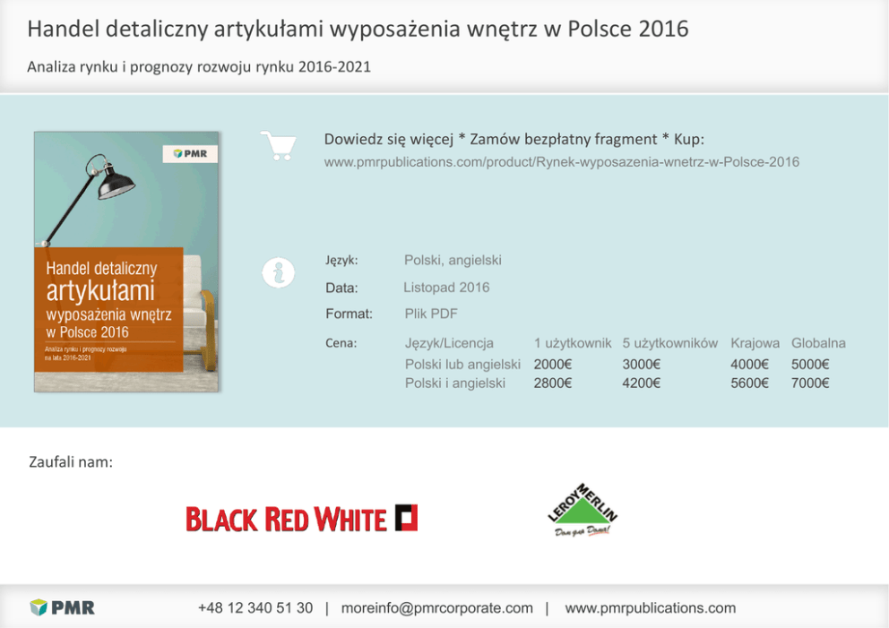 Handel detaliczny artykułami wyposażenia wnętrz w Polsce 2016 Analiza rynku i prognozy rozwoju rynku 2016-2021 Dowiedz się więcej * Zamów bezpłatny fragment * Kup: www.pmrpublications.com/product/Rynek-wyposazenia-wnetrz-w-Polsce-2016 Język: Polski, angielski Data: Listopad 2016 Format: Plik PDF Cena: Język/Licencja 1 użytkownik 5 użytkowników Krajowa Globalna Polski lub angielski 2000€ Polski i angielski 2800€ 3000€ 4200€ 4000€ 5600€ Zaufali nam: +48 12 340 51 30 | [email protected] | www.pmrpublications.com 5000€ 7000€ Handel detaliczny artykułami wyposażenia wnętrz w Polsce 2016 Analiza rynku i prognozy rozwoju rynku 2016-2021 Jakie informacje zawiera ten raport? Kto skorzysta z tej analizy? Detaliści i producenci mebli oraz artykułów wyposażenia wnętrz aktywnych na polskim rynku Łączna wartość sektora Wartość poszczególnych segmentów – meble i dodatki, podłogi, tekstylia domowe, artykuły dekoracyjne, akcesoria sanitarne oraz artykuły kuchenne i nakrycie stołu Firmy działające na rynku DIY Producenci sprzętu i wyposażenia domowego Sklepy i platformy e-commerce Wiodące trendy na rynku Organizacje handlu i przemysłu Wpływ zmian makroekonomicznych na detaliczny rynek wyposażenia wnętrz w Polsce Inwestorzy, analitycy, banki i inni specjaliści detaliczni Dystrybucja na rynku wyposażenia wnętrz Dlaczego warto kupić ten raport? Wartość, przychody, liczba sklepów Pomoże stworzyć strategię rozwoju biznesu Wartość polskiego rynku wyposażenia wnętrz i jego kluczowych segmentów: meble i dodatki, podłogi, tekstylia domowe, artykuły dekoracyjne, akcesoria sanitarne oraz artykuły kuchenne i nakrycie stołu Urealni dane w biznesplanach i budżetach Prognozy rozwoju do 2021 r. dla całego rynku, każdego z poszczególnych segmentów i głównych kanałów Plany remontowe oraz zakupowe Polaków odnośnie mebli i artykułów wyposażenia wnętrz +48 12 340 51 30 | [email protected] | Umożliwi monitoring rynku i jego potencjału rozwojowego Usprawni przeprowadzanie analiz otoczenia konkurencyjnego Zmniejszy ryzyko inwestycyjne np. w czasie wchodzenia na nowy rynek, fuzji lub przejęcia www.pmrpublications.com