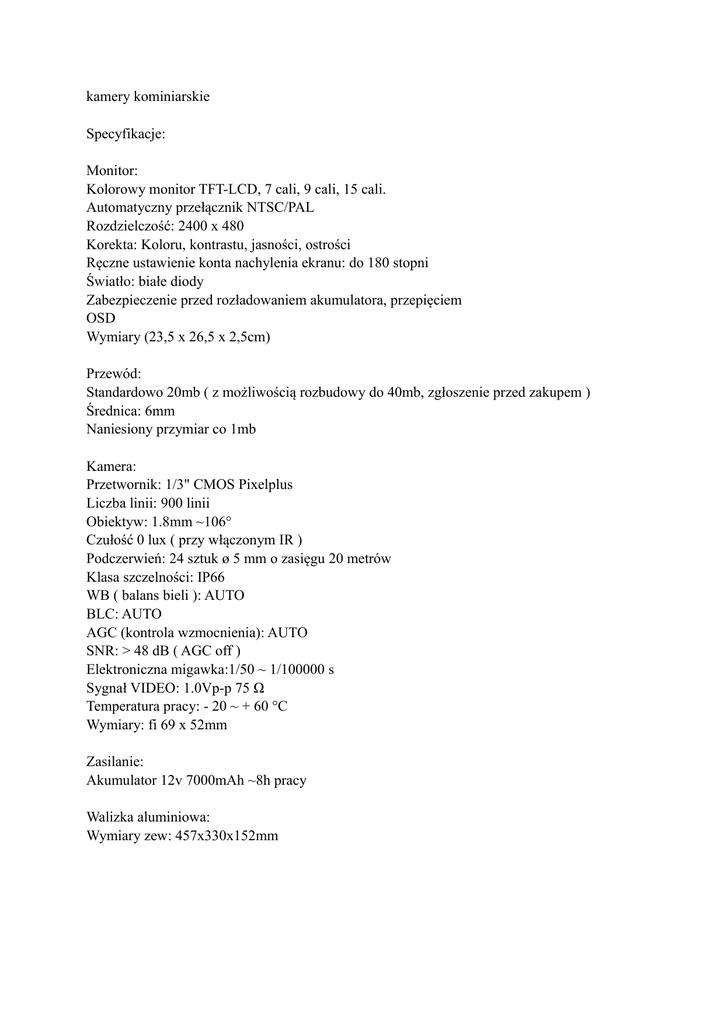 kamery kominiarskie Specyfikacje: Monitor: Kolorowy monitor TFT-LCD, 7 cali, 9 cali, 15 cali. Automatyczny przełącznik NTSC/PAL Rozdzielczość: 2400 x 480 Korekta: Koloru, kontrastu, jasności, ostrości Ręczne ustawienie konta nachylenia ekranu: do 180 stopni Światło: białe diody Zabezpieczenie przed rozładowaniem akumulatora, przepięciem OSD Wymiary (23,5 x 26,5 x 2,5cm) Przewód: Standardowo 20mb ( z możliwością rozbudowy do 40mb, zgłoszenie przed zakupem ) Średnica: 6mm Naniesiony przymiar co 1mb Kamera: Przetwornik: 1/3" CMOS Pixelplus Liczba linii: 900 linii Obiektyw: 1.8mm ~106° Czułość 0 lux ( przy włączonym IR ) Podczerwień: 24 sztuk ø 5 mm o zasięgu 20 metrów Klasa szczelności: IP66 WB ( balans bieli ): AUTO BLC: AUTO AGC (kontrola wzmocnienia): AUTO SNR: > 48 dB ( AGC off ) Elektroniczna migawka:1/50 ~ 1/100000 s Sygnał VIDEO: 1.0Vp-p 75 Ω Temperatura pracy: - 20 ~ + 60 °C Wymiary: fi 69 x 52mm Zasilanie: Akumulator 12v 7000mAh ~8h pracy Walizka aluminiowa: Wymiary zew: 457x330x152mm