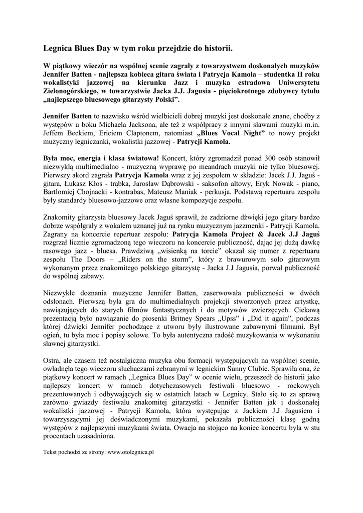 Legnica Blues Day w tym roku przejdzie do historii. W piątkowy wieczór na wspólnej scenie zagrały z towarzystwem doskonałych muzyków Jennifer Batten - najlepsza kobieca gitara świata i Patrycja Kamola – studentka II roku wokalistyki jazzowej na kierunku Jazz i muzyka estradowa Uniwersytetu Zielonogórskiego, w towarzystwie Jacka J.J. Jagusia - pięciokrotnego zdobywcy tytułu „najlepszego bluesowego gitarzysty Polski”. Jennifer Batten to nazwisko wśród wielbicieli dobrej muzyki jest doskonale znane, choćby z występów u boku Michaela Jacksona, ale też z współpracy z innymi sławami muzyki m.in. Jeffem Beckiem, Ericiem Claptonem, natomiast „Blues Vocal Night” to nowy projekt muzyczny legniczanki, wokalistki jazzowej - Patrycji Kamola. Była moc, energia i klasa światowa! Koncert, który zgromadził ponad 300 osób stanowił niezwykłą multimedialno - muzyczną wyprawę po meandrach muzyki nie tylko bluesowej. Pierwszy akord zagrała Patrycja Kamola wraz z jej zespołem w składzie: Jacek J.J. Jaguś gitara, Łukasz Kłos - trąbka, Jarosław Dąbrowski - saksofon altowy, Eryk Nowak - piano, Bartłomiej Chojnacki - kontrabas, Mateusz Maniak - perkusja. Podstawą repertuaru zespołu były standardy bluesowo-jazzowe oraz własne kompozycje zespołu. Znakomity gitarzysta bluesowy Jacek Jaguś sprawił, że zadziorne dźwięki jego gitary bardzo dobrze współgrały z wokalem uznanej już na rynku muzycznym jazzmenki - Patrycji Kamola. Zagrany na koncercie repertuar zespołu: Patrycja Kamola Project & Jacek J.J Jaguś rozgrzał licznie zgromadzoną tego wieczoru na koncercie publiczność, dając jej dużą dawkę rasowego jazz - bluesa. Prawdziwą „wisienką na torcie” okazał się numer z repertuaru zespołu The Doors – „Riders on the storm”, który z brawurowym solo gitarowym wykonanym przez znakomitego polskiego gitarzystę - Jacka J.J Jagusia, porwał publiczność do wspólnej zabawy. Niezwykłe doznania muzyczne Jennifer Batten, zaserwowała publiczności w dwóch odsłonach. Pierwszą była gra do multimedialnych projekcji stworzonych przez artystkę, nawiązujących do starych filmów fantastycznych i do motywów zwierzęcych. Ciekawą prezentacją było nawiązanie do piosenki Britney Spears „Upss” i „Did it again”, podczas której dźwięki Jennifer pochodzące z utworu były ilustrowane zabawnymi filmami. Był ogień, tu była moc i popisy solowe. To była autentyczna radość muzykowania w wykonaniu sławnej gitarzystki. Ostra, ale czasem też nostalgiczna muzyka obu formacji występujących na wspólnej scenie, owładnęła tego wieczoru słuchaczami zebranymi w legnickim Sunny Clubie. Sprawiła ona, że piątkowy koncert w ramach „Legnica Blues Day” w ocenie wielu, przeszedł do historii jako najlepszy koncert w ramach dotychczasowych festiwali bluesowo - rockowych prezentowanych i odbywających się w ostatnich latach w Legnicy. Stało się to za sprawą zarówno gwiazdy festiwalu znakomitej gitarzystki - Jennifer Batten jak i doskonałej wokalistki jazzowej - Patrycji Kamola, która występując z Jackiem J.J Jagusiem i towarzyszącymi jej doświadczonymi muzykami, pokazała publiczności klasę godną występów z najlepszymi muzykami świata. Owacja na stojąco na koniec koncertu była w stu procentach uzasadniona. Tekst pochodzi ze strony: www.otolegnica.pl