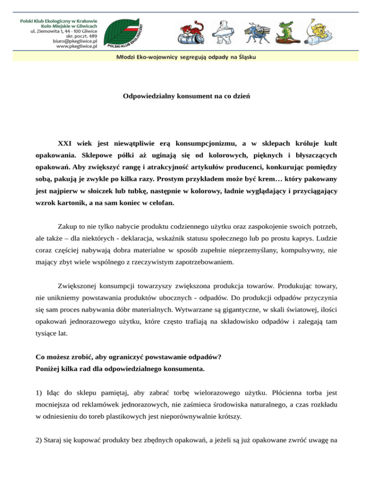 Odpowiedzialny konsument na co dzień XXI wiek jest niewątpliwie erą konsumpcjonizmu, a w sklepach króluje kult opakowania. Sklepowe półki aż uginają się od kolorowych, pięknych i błyszczących opakowań. Aby zwiększyć rangę i atrakcyjność artykułów producenci, konkurując pomiędzy sobą, pakują je zwykle po kilka razy. Prostym przykładem może być krem… który pakowany jest najpierw w słoiczek lub tubkę, następnie w kolorowy, ładnie wyglądający i przyciągający wzrok kartonik, a na sam koniec w celofan. Zakup to nie tylko nabycie produktu codziennego użytku oraz zaspokojenie swoich potrzeb, ale także – dla niektórych - deklaracja, wskaźnik statusu społecznego lub po prostu kaprys. Ludzie coraz częściej nabywają dobra materialne w sposób zupełnie nieprzemyślany, kompulsywny, nie mający zbyt wiele wspólnego z rzeczywistym zapotrzebowaniem. Zwiększonej konsumpcji towarzyszy zwiększona produkcja towarów. Produkując towary, nie unikniemy powstawania produktów ubocznych - odpadów. Do produkcji odpadów przyczynia się sam proces nabywania dóbr materialnych. Wytwarzane są gigantyczne, w skali światowej, ilości opakowań jednorazowego użytku, które często trafiają na składowisko odpadów i zalegają tam tysiące lat. Co możesz zrobić, aby ograniczyć powstawanie odpadów? Poniżej kilka rad dla odpowiedzialnego konsumenta. 1) Idąc do sklepu pamiętaj, aby zabrać torbę wielorazowego użytku. Płócienna torba jest mocniejsza od reklamówek jednorazowych, nie zaśmieca środowiska naturalnego, a czas rozkładu w odniesieniu do toreb plastikowych jest nieporównywalnie krótszy. 2) Staraj się kupować produkty bez zbędnych opakowań, a jeżeli są już opakowane zwróć uwagę na materiał, z którego zostało wykonane opakowanie, czy powstało ono z materiałów przyjaznych środowisku, czy jest możliwość poddania go odzyskowi, bądź też czy czas i sposób jego rozkładu nie obciąży zanadto środowiska naturalnego. W tym celu wprowadzone są specjalne kody oznaczenia różnych materiałów. Kody zawierają trzy strzałki, które tworzą trójkąt, z grotami skierowanymi zgodnie z ruchem wskazówek zegara. Wewnątrz trójkąta znajduje się liczba oznaczająca kod użytego materiału, a pod trójkątem umieszczany jest skrót literowy. Tab.1. Rodzaje tworzyw sztucznych. PET (politereftalanu etylenu) - tworzywo wykorzystywane przede wszystkim do produkcji opakowań, głównie żywności oraz w przemyśle tekstylnym. Możemy go spotkać najczęściej w postaci butelek PET do różnego typu napojów. Jego recykling jest bardzo opłacalny, z przemielonych butelek PET otrzymuje się włókno poliestrowe bardzo wysokiej jakości, które wykorzystywane jest m.in. do produkcji odzieży polarowej, plecaków, namiotów czy butów. PE (polietylen) - jedno z najpospolitszych tworzyw, głównie wykorzystywane do produkcji reklamówek, cienkich folii do pakowania żywności, rur, pojemników. PCW (PVC) - polichlorek winylu - tani i powszechny materiał stosowany przede wszystkim w budownictwie. Produkuje się z niego wykładziny, rury, profile okienne, opakowania, zabawki, ale także woreczki na krew, rurki do kroplówek, rękawice chirurgiczne, karty identyfikacyjne, spody do obuwia, odzież ochronną i przeciwdeszczową. PP (polipropylen) - lekki polimer wysoce odporny na korozję, działanie kwasów, zasad i soli. Stosowany w przemyśle chemicznym i farmaceutycznym jako materiał na naczynia, przewody, sprzęt medyczny i laboratoryjny. Wykonuje się z niego również izolacje kabli, części samochodowe, opakowania do żywności, artykuły gospodarstwa domowego i zabawki. PS (polistyren) - tworzywo produkowane przede wszystkim w postaci spienionej, dzięki temu cechuje się doskonałymi właściwościami termo-izolacyjnym. Stosowane pod postacią styropianu w budownictwie, w przemyśle spożywczym do wyrobu tacek i kubków jednorazowych, w opakowaniach w postaci wypełnienia lub kształtek ochronnych. Inne - produkty wykonane z innych tworzyw również podlegających recyklingowi. 3) Dokonuj przemyślanych zakupów. Często mimowolnie ulegamy różnego rodzaju zabiegom marketingowym. Skutkiem tego jest nabywanie rzeczy niepotrzebnych czy wręcz zbędnych. Po powrocie do domu, okazuje się, feralny zakup prędzej, czy później i tak ląduje w koszu na śmieci. Podobnie rzecz ma się z towarami wyprodukowanymi „tanim kosztem”, które dla konsumenta mają tę zaletę, że ich cena generalnie nie jest zbyt wysoka w zestawieniu z innymi w danym segmencie rynku. Prawda jest jednak taka, że często jest to oszczędność pozorna, okupiona niską jakością towaru, jego krótką przydatnością i brakiem możliwości naprawy w przypadku wystąpienia awarii, bo jest ona nieopłacalna ekonomicznie. W efekcie zmuszeni jesteśmy nabywać kolejny produkt, podczas gdy ten chwilę wcześniej przez nas zakupiony, ląduje na wysypisku. Przykładem takich towarów są m.in. sprzęty elektryczne i elektroniczne, które „taniej” jest wyrzucić niż naprawiać. Podobnie jest z tanimi ubraniami, czy obuwiem produkowanym w krajach Azji Wschodniej. Ich jakość pozostawia wiele do życzenia, gdzie często już po pierwszym kontakcie z wodą (czy to podczas prania odzieży w pralce, czy na deszczu) okazuje się, że zakupiony przez nas towar nie spełnia żadnych z naszych oczekiwań i po pierwszym użyciu do niczego się już nie nadaje. 4) Kupuj odpowiedzialnie. Niezwykle istotną rolę w procesie odpowiedzialnej konsumpcji odgrywa nabywanie dóbr, których eksploatacja nie będzie powodowała szkód w środowisku naturalnym. Mowa tu na przykład o samochodach spalających małe ilości paliwa, stosowaniu akumulatorów, które po rozładowaniu można ponownie naładować, czy też energooszczędnym sprzęcie gospodarstwa domowego. Ponadto pamiętajmy, że produkty przez nas kupowane wcale nie muszą być fabrycznie nowe. Warto przyjrzeć się bliż