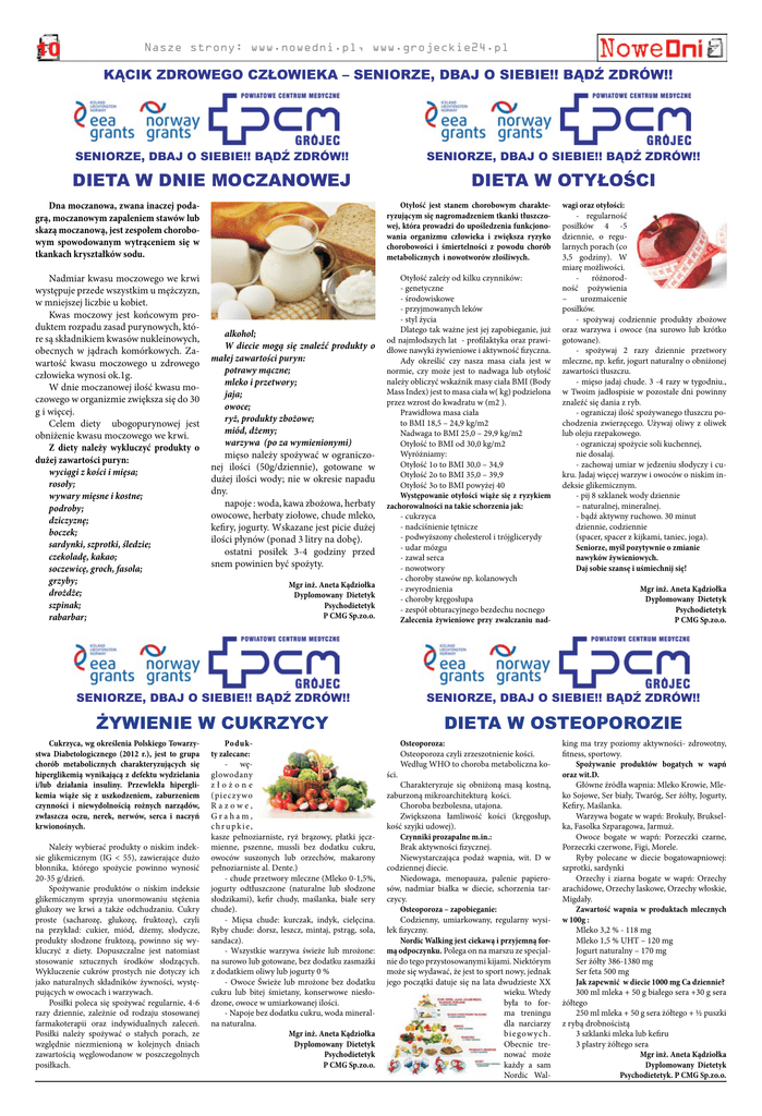 Nasze strony: www.nowedni.pl, www.grojeckie24.pl KĄCIK ZDROWEGO CZŁOWIEKA – SENIORZE, DBAJ O SIEBIE!! BĄDŹ ZDRÓW!! SENIORZE, DBAJ O SIEBIE!! BĄDŹ ZDRÓW!! SENIORZE, DBAJ O SIEBIE!! BĄDŹ ZDRÓW!! DIETA W DNIE MOCZANOWEJ DIETA W OTYŁOŚCI Dna moczanowa, zwana inaczej podagrą, moczanowym zapaleniem stawów lub skazą moczanową, jest zespołem chorobowym spowodowanym wytrąceniem się w tkankach kryształków sodu. Otyłość jest stanem chorobowym charakteryzującym się nagromadzeniem tkanki tłuszczowej, która prowadzi do upośledzenia funkcjonowania organizmu człowieka i zwiększa ryzyko chorobowości i śmiertelności z powodu chorób metabolicznych i nowotworów złośliwych. Nadmiar kwasu moczowego we krwi występuje przede wszystkim u mężczyzn, w mniejszej liczbie u kobiet. Kwas moczowy jest końcowym produktem rozpadu zasad purynowych, które są składnikiem kwasów nukleinowych, obecnych w jądrach komórkowych. Zawartość kwasu moczowego u zdrowego człowieka wynosi ok.1g. W dnie moczanowej ilość kwasu moczowego w organizmie zwiększa się do 30 g i więcej. Celem diety ubogopurynowej jest obniżenie kwasu moczowego we krwi. Z diety należy wykluczyć produkty o dużej zawartości puryn: wyciągi z kości i mięsa; rosoły; wywary mięsne i kostne; podroby; dziczyznę; boczek; sardynki, szprotki, śledzie; czekoladę, kakao; soczewicę, groch, fasola; grzyby; drożdże; szpinak; rabarbar; Otyłość zależy od kilku czynników: - genetyczne - środowiskowe - przyjmowanych leków - styl życia Dlatego tak ważne jest jej zapobieganie, już od najmłodszych lat - profilaktyka oraz prawidłowe nawyki żywieniowe i aktywność fizyczna. Ady określić czy nasza masa ciała jest w normie, czy może jest to nadwaga lub otyłość należy obliczyć wskaźnik masy ciała BMI (Body Mass Index) jest to masa ciała w( kg) podzielona przez wzrost do kwadratu w (m2 ). Prawidłowa masa ciała to BMI 18,5 – 24,9 kg/m2 Nadwaga to BMI 25,0 – 29,9 kg/m2 Otyłość to BMI od 30,0 kg/m2 Wyróżniamy: Otyłość 1o to BMI 30,0 – 34,9 Otyłość 2o to BMI 35,0 – 39,9 Otyłość 3o to BMI powyżej 40 Występowanie otyłości wiąże się z ryzykiem zachorowalności na takie schorzenia jak: - cukrzyca - nadciśnienie tętnicze - podwyższony cholesterol i trójglicerydy - udar mózgu - zawał serca - nowotwory - choroby stawów np. kolanowych - zwyrodnienia - choroby kręgosłupa - zespół obturacyjnego bezdechu nocnego Zalecenia żywieniowe przy zwalczaniu nad- alkohol; W diecie mogą się znaleźć produkty o małej zawartości puryn: potrawy mączne; mleko i przetwory; jaja; owoce; ryż, produkty zbożowe; miód, dżemy; warzywa (po za wymienionymi) mięso należy spożywać w ograniczonej ilości (50g/dziennie), gotowane w dużej ilości wody; nie w okresie napadu dny. napoje : woda, kawa zbożowa, herbaty owocowe, herbaty ziołowe, chude mleko, kefiry, jogurty. Wskazane jest picie dużej ilości płynów (ponad 3 litry na dobę). ostatni posiłek 3-4 godziny przed snem powinien być spożyty. Mgr inż. Aneta Kądziołka Dyplomowany Dietetyk Psychodietetyk P CMG Sp.zo.o. wagi oraz otyłości: - regularność posiłków 4 -5 dziennie, o regularnych porach (co 3,5 godziny). W miarę możliwości. - różnorodność pożywienia – urozmaicenie posiłków. - spożywaj codziennie produkty zbożowe oraz warzywa i owoce (na surowo lub krótko gotowane). - spożywaj 2 razy dziennie przetwory mleczne, np. kefir, jogurt naturalny o obniżonej zawartości tłuszczu. - mięso jadaj chude. 3 -4 razy w tygodniu., w Twoim jadłospisie w pozostałe dni powinny znaleźć się dania z ryb. - ograniczaj ilość spożywanego tłuszczu pochodzenia zwierzęcego. Używaj oliwy z oliwek lub oleju rzepakowego. - ograniczaj spożycie soli kuchennej, nie dosalaj. - zachowaj umiar w jedzeniu słodyczy i cukru. Jadaj więcej warzyw i owoców o niskim indeksie glikemicznym. - pij 8 szklanek wody dziennie – naturalnej, mineralnej. - bądź aktywny ruchowo. 30 minut dziennie, codziennie (spacer, spacer z kijkami, taniec, joga). Seniorze, myśl pozytywnie o zmianie nawyków żywieniowych. Daj sobie szansę i uśmiechnij się! Mgr inż. Aneta Kądziołka Dyplomowany Dietetyk Psychodietetyk P CMG Sp.zo.o. SENIORZE, DBAJ O SIEBIE!! BĄDŹ ZDRÓW!! SENIORZE, DBAJ O SIEBIE!! BĄDŹ ZDRÓW!! ŻYWIENIE W CUKRZYCY DIETA W OSTEOPOROZIE Cukrzyca, wg określenia Polskiego Towarzystwa Diabetologicznego (2012 r.), jest to grupa chorób metabolicznych charakteryzujących się hiperglikemią wynikającą z defektu wydzielania i/lub działania insuliny. Przewlekła hiperglikemia wiąże się z uszkodzeniem, zaburzeniem czynności i niewydolnością rożnych narządów, zwłaszcza oczu, nerek, nerwów, serca i naczyń krwionośnych. Należy wybierać produkty o niskim indeksie glikemicznym (IG < 55), zawierające dużo błonnika, którego spożycie powinno wynosić 20-35 g/dzień. Spożywanie produktów o niskim indeksie glikemicznym sprzyja unormowaniu stężenia glukozy we krwi a także odchudzaniu. Cukry proste (sacharozę, glukozę, fruktozę), czyli na przykład: cukier, miód, dżemy, słodycze, produkty słodzone fruktozą, powinno się wykluczyć z diety. Dopuszczalne jest natomiast stosowanie sztucznych środków słodzących. Wykluczenie cukrów prostych nie dotyczy ich jako naturalnych składników żywności, występujących w owocach i warzywach. Posiłki poleca się spożywać regularnie, 4-6 razy dziennie, zależnie od rodzaju stosowanej farmakoterapii oraz indywidualnych zaleceń. Posiłki należy spożywać o stałych porach, ze względnie niezmienioną w kolejnych dniach zawartością węglowodanow w poszczegolnych posiłkach. Podukty zalecane: - węglowodany złożone (pieczy wo Razowe, Graham, chrupkie, kasze pełnoziarniste, ryż brązowy, płatki jęczmienne, pszenne, mussli bez dodatku cukru, owoców suszonych lub orzechów, makarony pełnoziarniste al. Dente.) - chude przetwory mleczne (Mleko