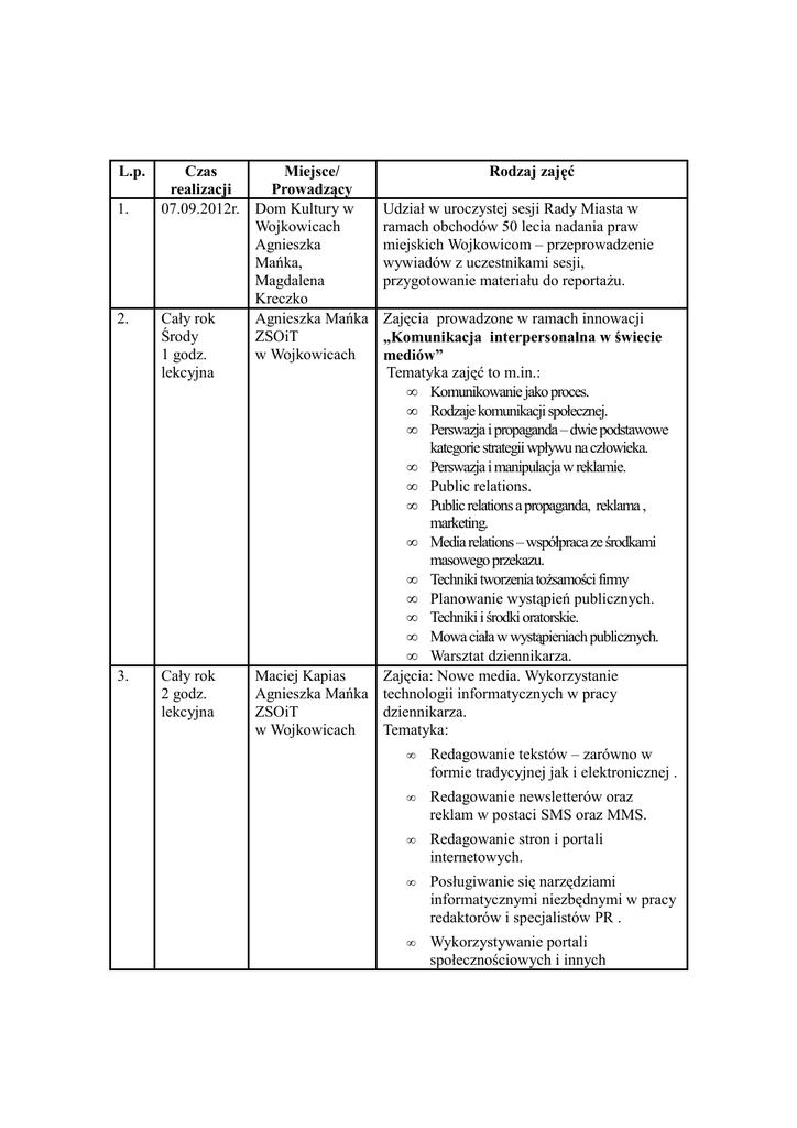 L.p. 1. 2. 3. Czas Miejsce/ realizacji Prowadzący 07.09.2012r. Dom Kultury w Wojkowicach Agnieszka Mańka, Magdalena Kreczko Cały rok Agnieszka Mańka ZSOiT Środy 1 godz. w Wojkowicach lekcyjna Cały rok 2 godz. lekcyjna Rodzaj zajęć Udział w uroczystej sesji Rady Miasta w ramach obchodów 50 lecia nadania praw miejskich Wojkowicom – przeprowadzenie wywiadów z uczestnikami sesji, przygotowanie materiału do reportażu. Zajęcia prowadzone w ramach innowacji „Komunikacja interpersonalna w świecie mediów” Tematyka zajęć to m.in.: • Komunikowanie jako proces. • Rodzaje komunikacji społecznej. • Perswazja i propaganda – dwie podstawowe kategorie strategii wpływu na człowieka. • Perswazja i manipulacja w reklamie. • Public relations. • Public relations a propaganda, reklama , marketing. • Media relations – współpraca ze środkami masowego przekazu. • Techniki tworzenia tożsamości firmy • Planowanie wystąpień publicznych. • Techniki i środki oratorskie. • Mowa ciała w wystąpieniach publicznych. • Warsztat dziennikarza. Maciej Kapias Zajęcia: Nowe media. Wykorzystanie Agnieszka Mańka technologii informatycznych w pracy ZSOiT dziennikarza. w Wojkowicach Tematyka: • Redagowanie tekstów – zarówno w formie tradycyjnej jak i elektronicznej . • Redagowanie newsletterów oraz reklam w postaci SMS oraz MMS. • Redagowanie stron i portali internetowych. • Posługiwanie się narzędziami informatycznymi niezbędnymi w pracy redaktorów i specjalistów PR . • Wykorzystywanie portali społecznościowych i innych nowoczesnych narzędzi informatycznych do komunikowania się. • Tworzenie prezentacji multimedialnych udostępnianych np. na YouTube oraz w portalach korporacyjnych . • Podstawy typografii. • Podstawy kompozycji. • Layout. • Grafika komputerowa- formaty plików coreldraw – podstawy. 4. Raz Prof. K. Gajdka w miesiącu UE - od w Katowicach października Cykliczne wyjazdy na Uniwersytet Ekonomiczny w Katowicach - wykłady w ramach programu zajęć kierunku: Dziennikarstwo Ekonomiczne. Tematyka: • Wprowadzenie do nauk o komunikowaniu. • Historia prasy i mediów w Polsce i na świecie. • Systemy medialne na świecie. 5. 24.10 2012r. Prof. K. Gajdka Morsko Warsztaty szkoleniowe. Tematyka: Autoprezentacja i wystąpienia publiczne. 6. Cały rok, 3 razy w semestrze Zajęcia w szkole z pracownikami Uniwersytetu Ekonomicznego. Tematyka: • Czym jest dziennikarstwo, zwłaszcza ekonomiczne i internetowe • Jakie są sekrety komunikacji społecznej i biznesowej? Prof. K. Gajdka ZSOiT w Wojkowicach • Jak poprawnie budować komunikację firmy z otoczeniem? • Jak budować wizerunek firmy w Internecie? • Co to takiego nowe media i jak je wykorzystuje się we współczesnej komunikacji? 7. Co najmniej 1 raz w semestrze 8. 3 lata 9. Cały rok A. Mańka Prowadzenie bloga, komentującego rzeczywistość szkolną i lokalną. 10. Cały rok A. Mańka M. Kapias 11 Październik 2012r. A. Mańka Opracowanie materiałów promocyjnych : • Cykliczne wydawanie biuletynów: MAK i W mundurze nam do twarzy… • Opracowanie projektu ulotek dla wszystkich kierunków kształcenia w LO i TAK. • Opracowanie projektu folderu promocyjnego. Przygotowanie i przeprowadzenie konkursu na recenzję wybranej powieści wydanej po 2000 roku. Grudzień 2012r. styczeń 2013r. Luty – marzec 2013r. A. Manka M. Kapias P. Lis Przeprowadzenie konkursu na fotoreportaż: Święta w szkole… Przygotowanie ekspozycji prac w szkole. A. Mańka M. Kapias P. Lis Przeprowadzenie konkursu na fotoreportaż: Dzień z życia szkoły… Przygotowanie ekspozycji prac w szkole. 12. Prof. K. Gajdka A. Mańka ZSOiT w Wojkowicach Prof. K. Gajdka Spotkanie z dziennikarzem. Zajęcia prowadzone przez dziennikarzy – praktyków – Warsztat dziennikarza. Udział w Akademii Dziennikarskiej ADEPT – 3 stopnie potwierdzone certyfikatem (po każdej klasie).