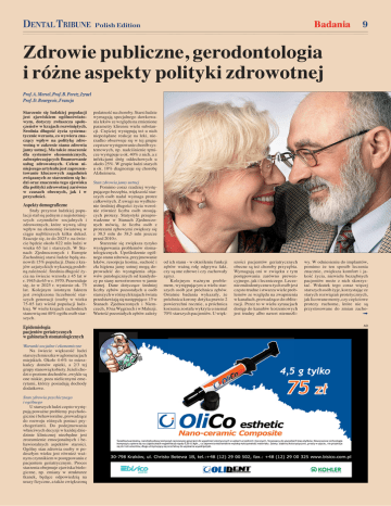 DENTAL TRIBUNE Badania Polish Edition 9 Zdrowie publiczne, gerodontologia i różne aspekty polityki zdrowotnej Prof. A. Mersel, Prof. B. Peretz, Izrael Prof. D. Bourgeois, Francja Starzenie się ludzkiej populacji jest zjawiskiem ogólnoświatowym, dotyczy zwłaszcza społeczeństw w krajach rozwiniętych. Średnia długość życia systematycznie wzrasta, co wywiera znaczący wpływ na politykę zdrowotną w zakresie stanu zdrowia jamy ustnej. Ma także znaczenie dla systemów ekonomicznych, zabezpieczających finansowanie usług zdrowotnych. Celem niniejszego artykułu jest zaprezentowanie kluczowych zagadnień związanych ze starzeniem się ludzi oraz znaczenia tego zjawiska dla polityki zdrowotnej zarówno w czasach obecnych, jak i w przyszłości. Aspekty demograficzne Stały przyrost ludzkiej populacji stał się jednym z najistotniejszych czynników socjalnych i zdrowotnych, które wywrą silny wpływ na ekonomię światową w ciągu najbliższych kilku dekad. Szacuje się, że do 2025 r. na świecie będzie około 822 mln ludzi w wieku 65 lat i starszych. W Stanach Zjednoczonych i Europie Zachodniej starsi ludzie będą stanowili 15% populacji. Dane z krajów azjatyckich wykazują podobną zależność. Średnia długość życia na świecie wzrosła z 45 lat w r. 1945 do 65 w r. 1970. Przewiduje się, że w 2025 r. wyniesie ok. 75 lat. Kolejnym istotnym faktem jest zwiększona liczebność starszych generacji (osoby w wieku 75-85 lat) wśród populacji ludzkiej. W wielu krajach zachodnich stanowią oni 40% ogółu osób starszych. Epidemiologia pacjentów geriatrycznych w gabinetach stomatologicznych Warunki socjalne i ekonomiczne Na świecie większość ludzi starszych mieszka w aglomeracjach miejskich. Około 4-6% to mieszkańcy domów opieki, a 2/3 tej grupy stanowią kobiety. Jeżeli chodzi o poziom dochodów, zwykle są one niskie, poza nielicznymi emerytami, którzy posiadają dochody dodatkowe. Stan zdrowia psychicznego i ogólnego U starszych ludzi często występują poważne problemy psychologiczne i behawioralne, prowadzące do rozwoju różnych postaci psychogeriatrii. Do podejmowania właściwych decyzji w każdej dziedzinie klinicznej niezbędne jest zrozumienie emocjonalnych i behawioralnych aspektów starości. Ogólny stan zdrowia osoby w podeszłym wieku jest również ważnym czynnikiem w postępowaniu z pacjentem geriatrycznym. Proces starzenia obejmuje zjawiska biologiczne, np. zmiany w strukturze tkanek, będące odpowiedzią na urazy fizyczne, a także zwiększoną podatność na choroby. Starsi ludzie wymagają specjalnego dawkowania leków ze względu na zmienione parametry klirensu wielu substancji. Częściej występują też u nich niepożądane reakcje na leki, nierzadko obserwuje się w tej grupie częstsze występowanie chorób systemowych, np. nadciśnienie tętnicze występuje u ok. 40% z nich, a z infekcjami dróg oddechowych u około 25%. W grupie ludzi starych u ok. 10% diagnozuje się chorobę Alzheimera. Stan zdrowia jamy ustnej Pomimo coraz rzadziej występującego bezzębia, większość starszych osób nadal wymaga protez całkowitych. Z uwagi na wydłużenie średniej długości życia wzrośnie również liczba osób stosujących protezy. Statystyki przeprowadzone w Stanach Zjednoczonych mówią, że liczba osób z protezami zębowymi zwiększy się z 30,5 mln do 38,5 mln jeszcze przed 2010 r. Starzenie się zwiększa ryzyko występowania problemów stomatologicznych. Upośledzenie ogólnego stanu zdrowia, przyjmowanie leków, resorpcja kostna, suchość i zła higiena jamy ustnej mogą doprowadzić do wystąpienia objawów patologicznych od kandydozy po stany nowotworowe w jamie ustnej. Dane dotyczące średniej liczby zębów pozostałych u osób starszych w różnych krajach świata przedstawiają się następująco: 15 w Stanach Zjednoczonych i Niemczech, 10 na Węgrzech i w Malezji. Wartość pozostałych zębów zależy od ich stanu - w określeniu funkcji zębów ważną rolę odgrywa fakt, czy są one zdrowe i czy zachowały zgryz. Kolejnym ważnym problemem, występującym u wielu starszych osób jest próchnica zębów. Ostatnie badania wykazały, że próchnica korony dotyka prawie 2 powierzchni rocznie, a próchnica korzenia została wykryta u niemal 70% starszych pacjentów. U więk- szości pacjentów geriatrycznych obecne są też choroby przyzębia. Wymagają oni w związku z tym postępowania zarówno prewencyjnego, jak i leczniczego. Leczenie endodontyczne u tych osób jest często trudne i stwarza wiele problemów ze względu na zwapnienia w kanałach, prowadzące do obliteracji. Przez to w wielu sytuacjach dostęp do kanałów korzeniowych jest trudny albo nawet niemożli- wy. W odniesieniu do implantów, pomimo że ten sposób leczenia znacznie, zwiększa komfort i jakość życia, niewielu bezzębnych pacjentów może z nich skorzystać. Wskutek tego coraz więcej starszych osób żyje, korzystając ze starych rozwiązań protetycznych, jak licowane mosty, czy częściowe protezy ruchome, które nie są przystosowane do zmian zacho- ➟ AD DENTAL TRIBUNE 10 Badania Polish Edition ➟ dzących w tkankach jamy ustnej. Funkcje, a także zdolności przeżuwania i mowy są często upośledzone w wyniku utraty zębów, nieprawidłowego ich ustawienia, mało wartościowych protez i ogólnego dyskomfortu w jamie ustnej. Poważnie upośledzona jest też estetyka. Polityka zdrowotna w zakresie zdrowia jamy ustnej Potrzeby i wymagania Niezwykle ważne jest oszacowanie tych potrzeb. Zazwyczaj istnieje ogromna przepaść pomiędzy rzeczywistymi potrzebami leczniczymi a wymaganiami wyrażanymi przez starsze osoby. Główną przyczyną skarg są problemy protetyczne (25%) lub czynniki związane z zębami (63%). Najczęściej stosowanym rozwiązaniem jest ekstrakcja. Brak świadomości problemów zdrowotnych w obrębie jamy ustnej zarówno u ludzi starszych, jak i instytucji zajmujących się organizacją opieki zdrowotnej prowa