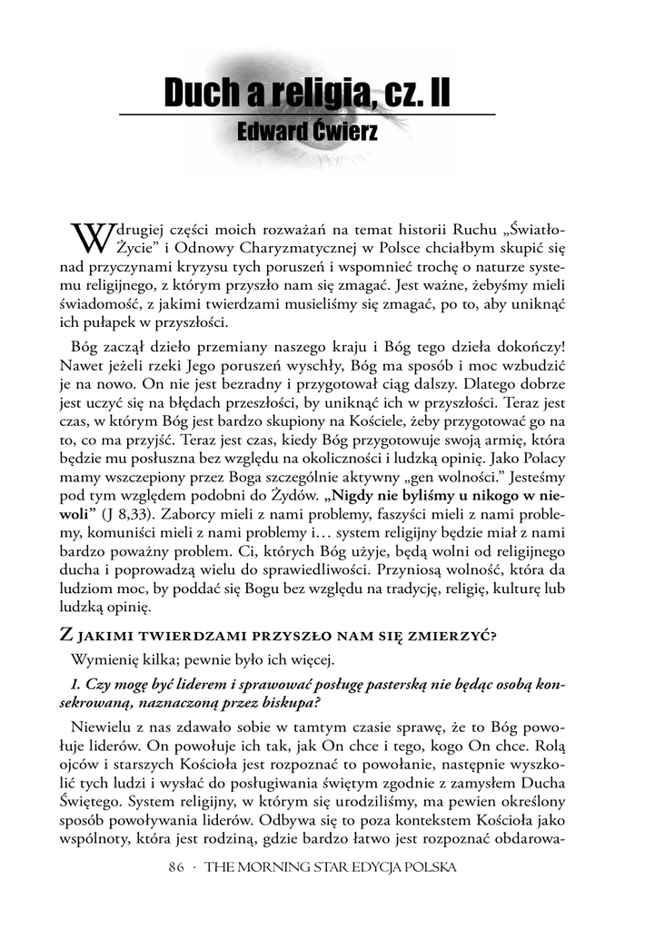 Duch a religia, cz. II Edward Ćwierz W drugiej części moich rozważań na temat historii Ruchu „ŚwiatłoŻycie” i Odnowy Charyzmatycznej w Polsce chciałbym skupić się nad przyczynami kryzysu tych poruszeń i wspomnieć trochę o naturze systemu religijnego, z którym przyszło nam się zmagać. Jest ważne, żebyśmy mieli świadomość, z jakimi twierdzami musieliśmy się zmagać, po to, aby uniknąć ich pułapek w przyszłości. Bóg zaczął dzieło przemiany naszego kraju i Bóg tego dzieła dokończy! Nawet jeżeli rzeki Jego poruszeń wyschły, Bóg ma sposób i moc wzbudzić je na nowo. On nie jest bezradny i przygotował ciąg dalszy. Dlatego dobrze jest uczyć się na błędach przeszłości, by uniknąć ich w przyszłości. Teraz jest czas, w którym Bóg jest bardzo skupiony na Kościele, żeby przygotować go na to, co ma przyjść. Teraz jest czas, kiedy Bóg przygotowuje swoją armię, która będzie mu posłuszna bez względu na okoliczności i ludzką opinię. Jako Polacy mamy wszczepiony przez Boga szczególnie aktywny „gen wolności.” Jesteśmy pod tym względem podobni do Żydów. „Nigdy nie byliśmy u nikogo w niewoli” (J ,). Zaborcy mieli z nami problemy, faszyści mieli z nami problemy, komuniści mieli z nami problemy i… system religijny będzie miał z nami bardzo poważny problem. Ci, których Bóg użyje, będą wolni od religijnego ducha i poprowadzą wielu do sprawiedliwości. Przyniosą wolność, która da ludziom moc, by poddać się Bogu bez względu na tradycję, religię, kulturę lub ludzką opinię. Z jakimi twierdzami przyszło nam si zmierzy? Wymienię kilka; pewnie było ich więcej. . Czy mogę być liderem i sprawować posługę pasterską nie będąc osobą konsekrowaną, naznaczoną przez biskupa? Niewielu z nas zdawało sobie w tamtym czasie sprawę, że to Bóg powołuje liderów. On powołuje ich tak, jak On chce i tego, kogo On chce. Rolą ojców i starszych Kościoła jest rozpoznać to powołanie, następnie wyszkolić tych ludzi i wysłać do posługiwania świętym zgodnie z zamysłem Ducha Świętego. System religijny, w którym się urodziliśmy, ma pewien określony sposób powoływania liderów. Odbywa się to poza kontekstem Kościoła jako wspólnoty, która jest rodziną, gdzie bardzo łatwo jest rozpoznać obdarowa86 · THE MORNING STAR EDYCJA POLSKA DUCH A RELIGIA, CZ. II nie i powołanie konkretnej osoby. W systemie religijnym, jeśli chcesz być księdzem, idziesz do seminarium duchownego, gdzie kształcony jesteś na duchownego. Kiedy zostajesz w końcu księdzem, masz pozycję i pewną władzę w Kościele, w zależności od tego, na jakim szczeblu hierarchicznej drabiny się znajdujesz. Ruch „Światło-Życie” i Odnowa Charyzmatyczna zrodziły świeckich liderów, którzy nie mieli pozycji w Kościele. Mieli jednak coś bardziej cennego: duchowy autorytet. I to było miejsce potencjalnego konfliktu i frustracji, zarówno dla świeckich jak i duchownych. Ludzie rozpoznawali, kto ma namaszczenie i autorytet, a kto „tylko” pozycję i władzę w Kościele. Dzieje się tak zawsze, kiedy Kościół staje się bardziej instytucją niż Ciałem Chrystusa, czyli wspólnotą wiernych. Pozycję i władzę można zdobyć. Namaszczenia nie można kupić, skopiować ani się nauczyć. Namaszczenie i autorytet pochodzą od Boga i są owocem intymnej relacji z Jezusem oraz chodzenia Jego drogami. Właśnie w tym miejscu wielu świeckich liderów się zmagało. Jakie jest nasze miejsce w Kościele? Jak pogodzić naszą pasterską posługę z posługą księży? Jak dalece mamy korygować i napominać ludzi? Większość liderów szukała wsparcia u księży opiekunów i szczerze chciała im być poddana. Jak jednak być poddanym komuś, kto - choć jest nam życzliwy - zupełnie nie uczestniczy w naszym duchowym doświadczeniu, a nawet nie doświadczył osobistego spotkania z Bogiem? Nie możesz prosić takiego człowieka o to, by sprawował nad tobą duchowy autorytet. Bóg tak nie działa. Szczerze współczułem tym księżom. Wykształcili się w tym systemie, stając się jego urzędnikami. A tak naprawdę większość z nich chciała szczerze służyć Bogu. B óg nie walczy z systemami religijnymi. Bog sprzeciwia się duchowi religijnemu, a ten jest w człowieku. Niestety, byli tacy liderzy świeccy, którzy nie wytrzymali tej duchowej konfrontacji i odeszli w buncie. Mieli prawo odejść. Ale nie mieli prawa się gniewać i być buntownikami. Wszyscy bowiem jesteśmy ofiarami duch religijnego. Bóg nie walczy z systemami religijnymi. Gdyby tak było, zniszczyłby judaizm, który nie rozpoznał Mesjasza, a nawet go zabił. Bóg sprzeciwia się duchowi religijnemu, a ten duch jest w człowieku. Można opuścić system religijny, ale zabrać ze sobą ducha tego systemu i z czasem założyć własny system np. zielonoświątkowy. (Biedni zielonoświątkowcy, coś się ich za bardzo dzisiaj czepiam. Wybaczcie, to tylko przykład!) EDWARD ÆWIERZ · 87 PROROCZE PERSPEKTYWY . Jak iść za Duchem Świętym, kiedy kwestionuje to Twój biskup? To pytanie przypomina mi o pewnej duchowej twierdzy w naszych umysłach. Mogę ją wyrazić w taki oto sposób: „Jeśli jakieś dzieło jest od Boga, to biskup musi to rozpoznać i zaakceptować.” Niestety, w systemach religijnych są to wyjątki. Więcej mamy przykładów sprzeciwu duchowych liderów wobec tego, co nowe. Bo co zrobisz, kiedy Twój biskup nie słyszy Boga, a przez to nie ma rozeznania tego, co jest z Boga a co nie? Wielu biskupów ma władzę i pozycję, ale często jest to bardziej autorytet urzędnika kościelnego niż duchowego ojca. Często jest to tragedią tych ludzi. Gdyby Duch Święty czekał na ich pozwolenie, nigdy by się nie doczekał. Oczywiście jest prawdą, że biskupi mają mieć duchowe rozeznanie i uczyć się iść za obłokiem. Jednak religijny system skutecznie ten dar rozeznania zaćmił. To był kolejny trudny moment dla lider