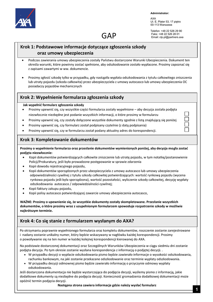 Administrator: AXA UI. E. Plater 53, 17 piętro 00-113 Warszawa GAP Telefon: +48 22 526 29 90 Faks: +48 22 526 28 01 Email: [email protected] Krok 1: Podstawowe informacje dotyczące zgłoszenia szkody oraz umowy ubezpieczenia Podczas zawierania umowy ubezpieczenia zostały Państwu dostarczone Warunki Ubezpieczenia. Dokument ten określa warunki, które powinny zostać spełnione, aby odszkodowanie zostało wypłacone. Prosimy zapoznać się z zapisami zawartymi w ww. dokumencie. Prosimy zgłosić szkodę tylko w przypadku, gdy nastąpiła wypłata odszkodowania z tytułu całkowitego zniszczenia lub utraty pojazdu (szkoda całkowita) przez ubezpieczyciela z umowy autocasco lub umowy ubezpieczenia OC posiadaczy pojazdów mechanicznych Krok 2: Wypełnienie formularza zgłoszenia szkody Jak wypełnić formularz zgłoszenia szkody Prosimy upewnić się, czy wszystkie części formularza zostały wypełnione – aby decyzja została podjęta niezwłocznie niezbędne jest podanie wszystkich informacji, o które prosimy w formularzu Prosimy upewnić się, czy zostały dołączone wszystkie dokumenty zgodnie z listą znajdującą się poniżej Prosimy upewnić się, czy formularz został podpisany czytelnie (z datą podpisania) Prosimy upewnić się, czy w formularzu został podany aktualny adres do korespondencji. Krok 3: Kompletowanie dokumentów Prosimy o wypełnienie formularza oraz przesłanie dokumentów wymienionych poniżej, aby decyzja mogła zostać podjęta niezwłocznie: Kopii dokumentów potwierdzających całkowite zniszczenie lub utratę pojazdu, w tym notatkę/postanowienie Policji/Prokuratury, jeśli było prowadzone postępowanie w sprawie zdarzenia Kopii dowodu rejestracyjnego pojazdu, Kopii dokumentów sporządzonych przez ubezpieczyciela z umowy autocasco lub umowy ubezpieczenia odpowiedzialności cywilnej z tytułu szkody całkowitej potwierdzających: wartość rynkową pojazdu (wycena rynkowa pojazdu jeśli była sporządzona), wartość pozostałości, wyliczenie szkody całkowitej, decyzję wypłaty odszkodowania autocasco / odpowiedzialności cywilnej; Kopii faktury zakupu pojazdu, Kopii polisy autocasco potwierdzającej zawarcie umowy ubezpieczenia autocasco, WAŻNE: Prosimy o upewnienie się, że wszystkie dokumenty zostały skompletowane. Przesłanie wszystkich dokumentów, o które prosimy wraz z uzupełnionym formularzem spowoduje rozpatrzenie szkody w możliwie najkrótszym terminie. Krok 4: Co się stanie z formularzem wysłanym do AXA? Po otrzymaniu poprawnie wypełnionego formularza oraz kompletu dokumentów, roszczenie zostanie zarejestrowane i nadany zostanie unikalny numer, który będzie wskazywany w nagłówku każdej korespondencji. Prosimy o powoływanie się na ten numer w każdej kolejnej korespondencji kierowanej do AXA. Na podstawie dostarczonej dokumentacji oraz Szczególnych Warunków Ubezpieczenia w ciągu siedmiu dni zostanie podjęta decyzja. Po tym okresie zostanie wysłana korespondencja z informacją o podjętej decyzji. . W przypadku decyzji o wypłacie odszkodowania pismo będzie zawierało informacje o wysokości odszkodowania, rachunku bankowym, na jaki zostanie przekazane odszkodowanie oraz terminie wypłaty odszkodowania. W przypadku decyzji odmownej pismo będzie zawierało informację o przyczynie odmowy wypłaty odszkodowania. Jeśli dostarczona dokumentacja nie będzie wystarczająca do podjęcia decyzji, wyślemy pismo z informacją, jakie dodatkowe dokumenty są niezbędne do podjęcia decyzji. Konieczność gromadzenia dodatkowej dokumentacji może opóźnić termin podjęcia decyzji. Następna strona zawiera informacje gdzie należy wysłać formularz 1 1 Gdzie należy wysłać formularz i dokumenty Po wypełnieniu całego formularza oraz skompletowaniu dodatkowej dokumentacji prosimy przesłać pełną dokumentację jedną z poniższych dróg: Pocztą elektroniczną: Zeskanowany formularz oraz dodatkowe dokumenty prosimy wysłać na adres [email protected] Faxem na numer: Pocztą na adres: +48 22 526 28 01 AXA ul. E. Plater 53, 17 piętro 00-113 Warszawa Prosimy zatrzymać kopię wniosku oraz oryginały przekazywanych dokumentów w przypadku, gdyby były potrzebne w przyszłości. Wszystkie informacje, o które pytamy w formularzu oraz dokumenty, o które prosimy pozwolą nam podjąć decyzję niezwłocznie. Niekompletny formularz lub brak wymaganych przez nas dokumentów opóźni proces podjęcia decyzji. Może się jednak zdarzyć, ze będziemy potrzebować dodatkowych dokumentów, w takim przypadku poprosimy Państwa o uzupełnienie dokumentacji. Oświadczenie Niniejszym zaświadczam, iż udzielone przeze mnie informacje są prawdziwe. Wyrażam zgodę na udostępnienie Ubezpieczycielowi oraz działającemu w jego imieniu i na jego rzecz Financial Insurance Group Services Spółka z o. o. Oddział w Polsce (część Axa), przez Zakłady Ubezpieczeń, które zawarły umowę autocasco dla pojazdu określonego powyżej, wszelkich informacji dotyczących tej umowy i likwidacji roszczeń z niej wynikających i upoważniam Ubezpieczyciela i Financial Insurance Group Services Spółka z o. o. Oddział w Polsce (część Axa) do wglądu do dokumentacji związanej z zawartą umową ubezpieczenia autocasco, dokumentacji szkodowej oraz do uzyskiwania kopii tej dokumentacji w zakresie i na zasadach, jakie dotyczą ubezpieczonego lub ubezpieczającego z umowy autocasco. Czytelny podpis osoby zgłaszającej roszczenie (w przypadku BZ WBK Leasing S.A. czytelny podpis oraz pieczątka osoby upoważnionej do zgłoszenia roszczenia) Data: d d m m r r 2 Dane osobowe Korzystającego z umowy leasingu Dane Korzystającego / Pożyczkobiorcy (imię i nazwisko lub nazwa firmy): Numer umowy / umów leasingu/pożyczki: Adres korespondencyjny: Telefon do kontaktu Adres e-mail: Dane dotyczące pojazdu Rok produkcji: Data rejestracji: Nr rejestracyjny pojazdu: d d m m Marka pojazdu: Wartość fakturowa pojazdu: Pojazd ubezpieczony Tak był z tytułu aut