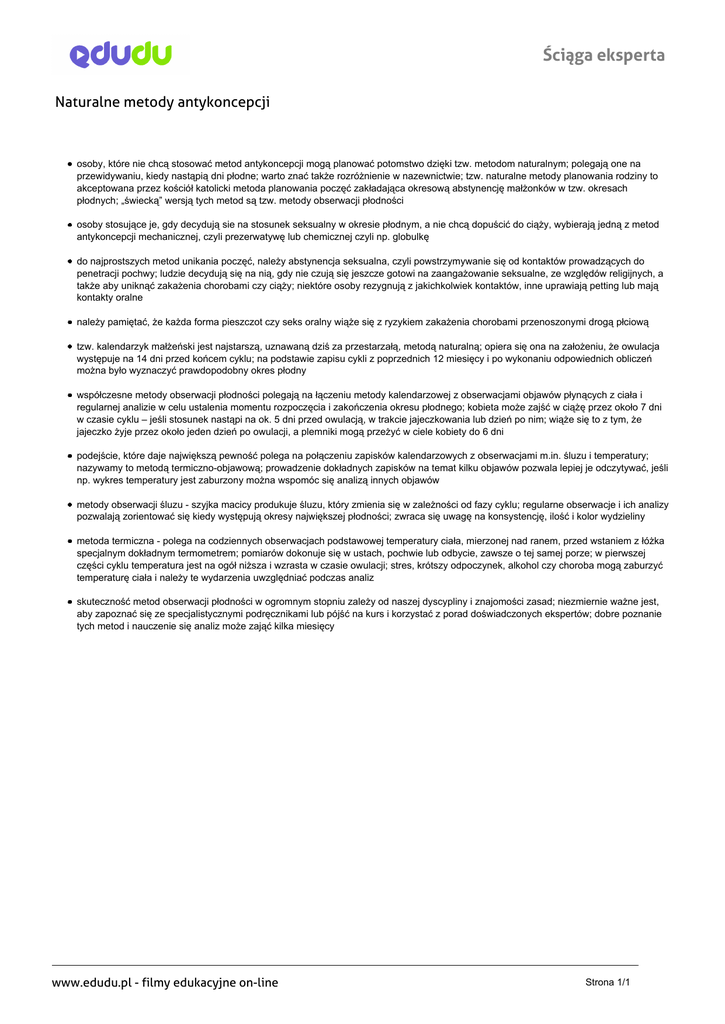 Ściąga eksperta Naturalne metody antykoncepcji osoby, które nie chcą stosować metod antykoncepcji mogą planować potomstwo dzięki tzw. metodom naturalnym; polegają one na przewidywaniu, kiedy nastąpią dni płodne; warto znać także rozróżnienie w nazewnictwie; tzw. naturalne metody planowania rodziny to akceptowana przez kościół katolicki metoda planowania poczęć zakładająca okresową abstynencję małżonków w tzw. okresach płodnych; „świecką” wersją tych metod są tzw. metody obserwacji płodności osoby stosujące je, gdy decydują sie na stosunek seksualny w okresie płodnym, a nie chcą dopuścić do ciąży, wybierają jedną z metod antykoncepcji mechanicznej, czyli prezerwatywę lub chemicznej czyli np. globulkę do najprostszych metod unikania poczęć, należy abstynencja seksualna, czyli powstrzymywanie się od kontaktów prowadzących do penetracji pochwy; ludzie decydują się na nią, gdy nie czują się jeszcze gotowi na zaangażowanie seksualne, ze względów religijnych, a także aby uniknąć zakażenia chorobami czy ciąży; niektóre osoby rezygnują z jakichkolwiek kontaktów, inne uprawiają petting lub mają kontakty oralne należy pamiętać, że każda forma pieszczot czy seks oralny wiąże się z ryzykiem zakażenia chorobami przenoszonymi drogą płciową tzw. kalendarzyk małżeński jest najstarszą, uznawaną dziś za przestarzałą, metodą naturalną; opiera się ona na założeniu, że owulacja występuje na 14 dni przed końcem cyklu; na podstawie zapisu cykli z poprzednich 12 miesięcy i po wykonaniu odpowiednich obliczeń można było wyznaczyć prawdopodobny okres płodny współczesne metody obserwacji płodności polegają na łączeniu metody kalendarzowej z obserwacjami objawów płynących z ciała i regularnej analizie w celu ustalenia momentu rozpoczęcia i zakończenia okresu płodnego; kobieta może zajść w ciążę przez około 7 dni w czasie cyklu – jeśli stosunek nastąpi na ok. 5 dni przed owulacją, w trakcie jajeczkowania lub dzień po nim; wiąże się to z tym, że jajeczko żyje przez około jeden dzień po owulacji, a plemniki mogą przeżyć w ciele kobiety do 6 dni podejście, które daje największą pewność polega na połączeniu zapisków kalendarzowych z obserwacjami m.in. śluzu i temperatury; nazywamy to metodą termiczno-objawową; prowadzenie dokładnych zapisków na temat kilku objawów pozwala lepiej je odczytywać, jeśli np. wykres temperatury jest zaburzony można wspomóc się analizą innych objawów metody obserwacji śluzu - szyjka macicy produkuje śluzu, który zmienia się w zależności od fazy cyklu; regularne obserwacje i ich analizy pozwalają zorientować się kiedy występują okresy największej płodności; zwraca się uwagę na konsystencję, ilość i kolor wydzieliny metoda termiczna - polega na codziennych obserwacjach podstawowej temperatury ciała, mierzonej nad ranem, przed wstaniem z łóżka specjalnym dokładnym termometrem; pomiarów dokonuje się w ustach, pochwie lub odbycie, zawsze o tej samej porze; w pierwszej części cyklu temperatura jest na ogół niższa i wzrasta w czasie owulacji; stres, krótszy odpoczynek, alkohol czy choroba mogą zaburzyć temperaturę ciała i należy te wydarzenia uwzględniać podczas analiz skuteczność metod obserwacji płodności w ogromnym stopniu zależy od naszej dyscypliny i znajomości zasad; niezmiernie ważne jest, aby zapoznać się ze specjalistycznymi podręcznikami lub pójść na kurs i korzystać z porad doświadczonych ekspertów; dobre poznanie tych metod i nauczenie się analiz może zająć kilka miesięcy www.edudu.pl - filmy edukacyjne on-line Powered by TCPDF (www.tcpdf.org) Strona 1/1