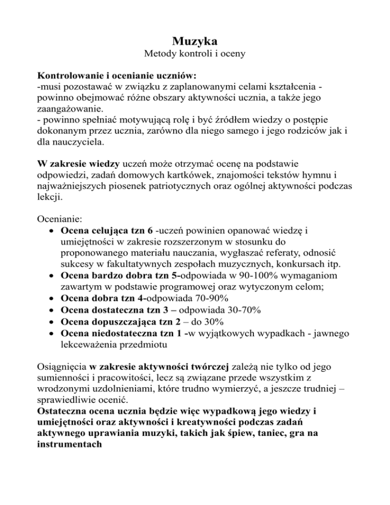 Muzyka Metody kontroli i oceny Kontrolowanie i ocenianie uczniów: -musi pozostawać w związku z zaplanowanymi celami kształcenia powinno obejmować różne obszary aktywności ucznia, a także jego zaangażowanie. - powinno spełniać motywującą rolę i być źródłem wiedzy o postępie dokonanym przez ucznia, zarówno dla niego samego i jego rodziców jak i dla nauczyciela. W zakresie wiedzy uczeń może otrzymać ocenę na podstawie odpowiedzi, zadań domowych kartkówek, znajomości tekstów hymnu i najważniejszych piosenek patriotycznych oraz ogólnej aktywności podczas lekcji. Ocenianie: Ocena celująca tzn 6 -uczeń powinien opanować wiedzę i umiejętności w zakresie rozszerzonym w stosunku do proponowanego materiału nauczania, wygłaszać referaty, odnosić sukcesy w fakultatywnych zespołach muzycznych, konkursach itp. Ocena bardzo dobra tzn 5-odpowiada w 90-100% wymaganiom zawartym w podstawie programowej oraz wytyczonym celom; Ocena dobra tzn 4-odpowiada 70-90% Ocena dostateczna tzn 3 – odpowiada 30-70% Ocena dopuszczająca tzn 2 – do 30% Ocena niedostateczna tzn 1 -w wyjątkowych wypadkach - jawnego lekceważenia przedmiotu Osiągnięcia w zakresie aktywności twórczej zależą nie tylko od jego sumienności i pracowitości, lecz są związane przede wszystkim z wrodzonymi uzdolnieniami, które trudno wymierzyć, a jeszcze trudniej – sprawiedliwie ocenić. Ostateczna ocena ucznia będzie więc wypadkową jego wiedzy i umiejętności oraz aktywności i kreatywności podczas zadań aktywnego uprawiania muzyki, takich jak śpiew, taniec, gra na instrumentach Zajęcia artystyczne Metody oceniania osiągnięć uczniów Kryteria jakimi należy kierować się , oceniając wiedzę i umiejętności uczniów powinny uwzględniać potencjalne zdolności plastyczne uczniów w określonym przedziale wiekowym oraz ich możliwości kreacyjne. Nauczyciel powinien dostosować do nich wymagania edukacyjne. Na ocenę powinny składać się: 1. stosunek ucznia do przedmiotu 2. wysiłek wkładany w realizację wymagań 3. Stopień opanowania wiadomości i umiejętności oraz działania plastyczne: zaangażowanie, niekonwencjonalność rozwiązań zarówno tematu, jak i formy. 4. Stopień wykorzystania posiadanej wiedzy w praktycznym działaniu Uzdolnienia plastyczne ucznia nie mogą być podstawowym kryterium oceniania. Muzyka Metody kontroli i oceny dla osób z orzeczeniem Ocenianie: Ocena bardzo dobra tzn 5-odpowiada 70-90% Ocena dobrą tzn 4 – odpowiada 30-70% Ocena dostateczną tzn 3 – 30% Ocena dopuszczającą tzn 2 – 10-20% Ocena niedostateczna- w wyjątkowych wypadkach jawnego lekceważenia przedmiot Osiągnięcia w zakresie aktywności twórczej zależą nie tylko od jego sumienności i pracowitości, lecz są związane przede wszystkim z wrodzonymi uzdolnieniami, które trudno wymierzyć, a jeszcze trudniej – sprawiedliwie ocenić. Ostateczna ocena ucznia będzie więc wypadkową jego wiedzy i umiejętności oraz aktywności i kreatywności podczas zadań aktywnego uprawiania muzyki, takich jak śpiew, taniec, gra na instrumentach Zajęcia artystyczne Metody oceniania osiągnięć uczniów Kryteria jakimi należy kierować się , oceniając wiedzę i umiejętności uczniów powinny uwzględniać potencjalne zdolności plastyczne uczniów w określonym przedziale wiekowym oraz ich możliwości kreacyjne. Nauczyciel powinien dostosować do nich wymagania edukacyjne. Na ocenę powinny składać się: 5. stosunek ucznia do przedmiotu 6. wysiłek wkładany w realizację wymagań 7. Stopień opanowania wiadomości i umiejętności oraz działania plastyczne: zaangażowanie, niekonwencjonalność rozwiązań zarówno tematu, jak i formy. 8. Stopień wykorzystania posiadanej wiedzy w praktycznym działaniu