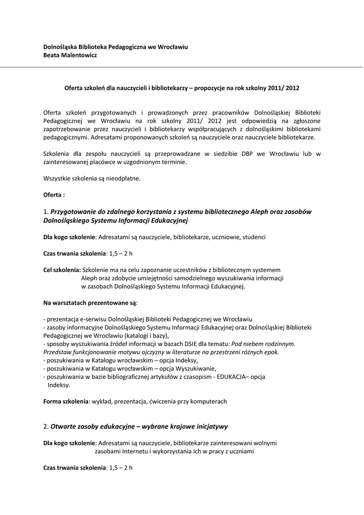 Dolnośląska Biblioteka Pedagogiczna we Wrocławiu Beata Malentowicz Oferta szkoleń dla nauczycieli i bibliotekarzy – propozycje na rok szkolny 2011/ 2012 Oferta szkoleń przygotowanych i prowadzonych przez pracowników Dolnośląskiej Biblioteki Pedagogicznej we Wrocławiu na rok szkolny 2011/ 2012 jest odpowiedzią na zgłoszone zapotrzebowanie przez nauczycieli i bibliotekarzy współpracujących z dolnośląskimi bibliotekami pedagogicznymi. Adresatami proponowanych szkoleń są nauczyciele oraz nauczyciele bibliotekarze. Szkolenia dla zespołu nauczycieli są przeprowadzane w siedzibie DBP we Wrocławiu lub w zainteresowanej placówce w uzgodnionym terminie. Wszystkie szkolenia są nieodpłatne. Oferta : 1. Przygotowanie do zdalnego korzystania z systemu bibliotecznego Aleph oraz zasobów Dolnośląskiego Systemu Informacji Edukacyjnej Dla kogo szkolenie: Adresatami są nauczyciele, bibliotekarze, uczniowie, studenci Czas trwania szkolenia: 1,5 – 2 h Cel szkolenia: Szkolenie ma na celu zapoznanie uczestników z bibliotecznym systemem Aleph oraz zdobycie umiejętności samodzielnego wyszukiwania informacji w zasobach Dolnośląskiego Systemu Informacji Edukacyjnej. Na warsztatach prezentowane są: - prezentacja e-serwisu Dolnośląskiej Biblioteki Pedagogicznej we Wrocławiu - zasoby informacyjne Dolnośląskiego Systemu Informacji Edukacyjnej oraz Dolnośląskiej Biblioteki Pedagogicznej we Wrocławiu (katalogi i bazy), - sposoby wyszukiwania źródeł informacji w bazach DSIE dla tematu: Pod niebem rodzinnym. Przedstaw funkcjonowanie motywu ojczyzny w literaturze na przestrzeni różnych epok. - poszukiwania w Katalogu wrocławskim – opcja Indeksy, - poszukiwania w Katalogu wrocławskim – opcja Wyszukiwanie, - poszukiwania w bazie bibliograficznej artykułów z czasopism - EDUKACJA– opcja Indeksy. Forma szkolenia: wykład, prezentacja, ćwiczenia przy komputerach 2. Otwarte zasoby edukacyjne – wybrane krajowe inicjatywy Dla kogo szkolenie: Adresatami są nauczyciele, bibliotekarze zainteresowani wolnymi zasobami Internetu i wykorzystania ich w pracy z uczniami Czas trwania szkolenia: 1,5 – 2 h Cel szkolenia: Celem prezentacji jest przybliżenie otwartych zasobów edukacyjnych w Internecie, możliwych do zastosowania na wszystkich etapach kształcenia oraz w bibliotekach. Na szkoleniu omawiane są: - Prawo autorskie, - Creative Commons, - Biblioteki cyfrowe, - Otwarte zasoby cyfrowe – krajowe inicjatywy, - Rozwiązania wspomagające procesy realizowane za pomocą otwartych zasobów edukacyjnych. Forma szkolenia: wykład, prezentacja 3. Tablica interaktywna… i co dalej? Dla kogo szkolenie: Adresatami są nauczyciele, bibliotekarze zainteresowani wykorzystaniem technologii informacyjno-komunikacyjnych w pracy z uczniami Czas trwania szkolenia: 1,5 – 2 h Cel szkolenia: Szkolenie ma na celu zapoznanie uczestników z funkcjami tablicy oraz sposobami wykorzystania jej na lekcjach. Na szkoleniu omawiane są: - podstawowe funkcje tablicy, - podstawowe programu Workspace, - przykładowe zastosowania. Forma szkolenia: wykład, prezentacja 4. Możliwości wyszukiwarki Google jako zaawansowanego narzędzia przeszukiwania zasobów Internetu Dla kogo szkolenie: Adresatami są nauczyciele, bibliotekarze zainteresowani wykorzystaniem technologii informacyjno-komunikacyjnych w pracy z uczniami Czas trwania szkolenia: 2 h Cel szkolenia: Szkolenie ma na celu zapoznanie uczestników ze specyfiką wyszukiwarki Google Na szkoleniu omawiane są: - zaawansowane metody wyszukiwawcze wyszukiwarki - podstawy formułowania skutecznych zapytań - usługi specjalne Google’a: Goole Book, Google Scholar, Google Maps, Google Sky Forma szkolenia: wykład, prezentacja, ćwiczenia przy komputerach 5. Wykorzystanie Windows Live w pracy nauczyciela Dla kogo szkolenie: Adresatami są nauczyciele, bibliotekarze zainteresowani wykorzystaniem technologii informacyjno-komunikacyjnych w pracy z uczniami Czas trwania szkolenia: 1,5 - 2 h Cel szkolenia: Szkolenie ma na celu zaprezentowanie bezpłatnej edukacyjnej sieci społecznościowej Live@edu Na szkoleniu prezentowane są usługi: - Live Hotmail - serwis webmail, oferujący pocztę elektroniczną i adres email w domenie szkoły oraz kalendarz wydarzeń osobistych, klasowych, szkolnych, - Live SkyDrive - wirtualny dysk, na którym można przechowywać pliki i mieć do nich dostęp z każdego komputera podłączonego do Internetu, który umożliwia pracę kilku osób w jednym dokumencie, - Live Movie Marker - aplikacja zastępująca wbudowany w system Windows program Movie Maker, - Galeria fotografii - umożliwia edytowanie i porządkowanie fotografii oraz publikowanie ich w trybie online i wysyłanie znajomym. Forma szkolenia: wykład, prezentacja, ćwiczenia przy komputerach 6. Sposób na dobrą prezentację Dla kogo szkolenie: Adresatami są nauczyciele, bibliotekarze, uczniowie zainteresowani przeprowadzeniem ciekawej prezentacji Czas trwania szkolenia: 2 h Cel szkolenia: Szkolenie ma na celu zapoznanie uczestników z zasadami i technikami przygotowania oraz prowadzenia prezentacji. Na szkoleniu są omawiane treści: 1. Techniki prezentacji 2. Rodzaje prezentacji 3. Cechy dobrej prezentacji 4. Przygotowanie plansz (slajdów i pomocy wizualnych) – wskazówki techniczne 5. Postawa i zachowanie prowadzącego Forma szkolenia: wykład, prezentacja 7. Tworzenie treści kursu na platformie edukacyjnej Moodle Dla kogo szkolenie: Adresatami są nauczyciele, bibliotekarze zainteresowani tworzeniem i udostępnianiem kursów na platformie edukacyjnej Moodle Czas trwania szkolenia: 2 h Cel szkolenia: Szkolenie ma na celu zapoznanie uczestników z podstawowymi zasadami tworzenia treści kursów e-learningowych. Na szkoleniu omawiane są: 1. 2. 3. 4. Organizacja i tworzenie kursu Interfejs kursu Wprowadzanie składników do treści kursu Zasoby kursu Forma szkolenia: wykład, prezentacja, ćwiczenia przy komputerach