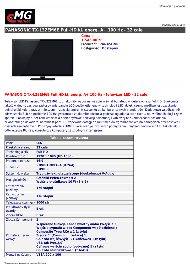 Informacje o produkcie Utworzono 02-03-2017 PANASONIC TX-L32EM6E Full-HD kl. energ. A+ 100 Hz - 32 cale Cena : 1.543,00 zł Producent : PANASONIC Dostępność : Dostępny PANASONIC TX-L32EM6E Full HD kl. energ. A+ 100 Hz - telewizor LED - 32 cale Telewizor LED Panasonic TX-L32EM6E to znakomity wybór na wejście w świat bogatego w detale obrazu Full HD. Znakomita jakość wideo to zasługa zastosowania panelu LCD podświetlanego w technologii LED, dzięki czemu możliwe jest uzyskanie pełnej głębi koloru przy zmniejszonym zużyciu energii w stosunku do konkurencyjnych standardów. Dodatkowo współczynnik odświeżania BLB na poziomie 100 Hz gwarantuje znakomite odczucia podczas oglądania scen ruchu, np. w filmach akcji czy w sporcie. Podwójny tuner DVB umożliwia odbiór cyfrowej telewizji naziemnej i kablowej bez konieczności posiadania zewnętrznego dekodera, natomiast port USB zapewnia dostęp do multimediów zgromadzonych na pamięciach przenośnych i dyskach zewnętrznych. Podwójny interfejs HDMI z kolei oferuje możliwość podłączenia urządzeń źródłowych HD, takich jak odtwarzacze Blu-ray, konsole czy komputery ze zgodnym interfejsem. Tabela parametryczna Panel Przekątna ekranu Technologia HD Rozdzielczość Proporcje obrazu Tuner TV System dźwięku Moc głośników Kąt widzenia poziomy Kąt widzenia pionowy Telegazeta (pamięć) Wbudowany dysk twardy Złącza HDMI Złącza Component Pozostałe złącza we/wy Montaż na ścianie LED 32 cale Full HD 1920 x 1080 (HD 1080) 16:9 • DVB-T MPEG-4 (H.264) • DVB-C Tryb dźwięku otaczającego (dookólnego) V-Audio Głośniki Pełen zakres x 2 Wyjście głośnikowe 10 W (5 + 5) 176 stopni 176 stopni 1000 str. Brak Brak 2 Wspierane funkcje Kanał zwrotny audio (Wejście 2) Wejście sygnału wideo Component współdzielone z Composite Typu RCA x 1 (z tyłu) Złącze CI (Common Interface) 1 Gniazdo wejść/wyjść, 21 końcówek 1 (z tyłu) USB tak (ver.2.0) Cyfrowe wyjście audio (optyczne) 1 (z tyłu) Gniazdo słuchawkowe 1 (z boku) VESA 200 x 100 Wygenerowano w programie www.oscGold.com Obudowa Pobór mocy Błyszcząca 66 W Wymiary bez stojaka (szer. x wys. x głęb.) 738 x 454 x 66 mm Wymiary Wymiary ze stojakiem (szer. x wys. x głęb.) 738 x 512 x 206 mm Waga 8.5 kg Media Player Media Player (zdjęcia/filmy/dźwięk) tak Pozostałe parametry Obsługiwane formaty AVI/MKV/WMV/MP4/M4v/FLV/3GPP/VRO/VOB/TS/PS, MP3/AAC/WMA/FLAC/WAV, JPEG Gwarancja producenta - 24 miesiące.