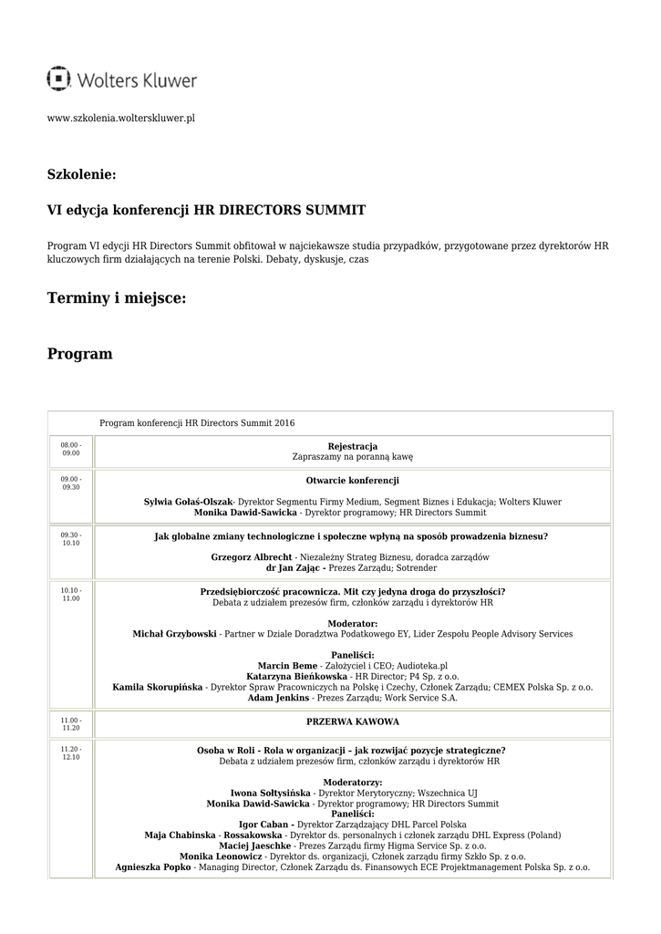 www.szkolenia.wolterskluwer.pl Szkolenie: VI edycja konferencji HR DIRECTORS SUMMIT Program VI edycji HR Directors Summit obfitował w najciekawsze studia przypadków, przygotowane przez dyrektorów HR kluczowych firm działających na terenie Polski. Debaty, dyskusje, czas Terminy i miejsce: Program Program konferencji HR Directors Summit 2016 08.00 09.00 Rejestracja Zapraszamy na poranną kawę 09.00 09.30 Otwarcie konferencji Sylwia Gołaś-Olszak- Dyrektor Segmentu Firmy Medium, Segment Biznes i Edukacja; Wolters Kluwer Monika Dawid-Sawicka - Dyrektor programowy; HR Directors Summit 09.30 10.10 Jak globalne zmiany technologiczne i społeczne wpłyną na sposób prowadzenia biznesu? Grzegorz Albrecht - Niezależny Strateg Biznesu, doradca zarządów dr Jan Zając - Prezes Zarządu; Sotrender 10.10 11.00 Przedsiębiorczość pracownicza. Mit czy jedyna droga do przyszłości? Debata z udziałem prezesów firm, członków zarządu i dyrektorów HR Moderator: Michał Grzybowski - Partner w Dziale Doradztwa Podatkowego EY, Lider Zespołu People Advisory Services Paneliści: Marcin Beme - Założyciel i CEO; Audioteka.pl Katarzyna Bieńkowska - HR Director; P4 Sp. z o.o. Kamila Skorupińska - Dyrektor Spraw Pracowniczych na Polskę i Czechy, Członek Zarządu; CEMEX Polska Sp. z o.o. Adam Jenkins - Prezes Zarządu; Work Service S.A. 11.00 11.20 PRZERWA KAWOWA 11.20 12.10 Osoba w Roli - Rola w organizacji – jak rozwijać pozycje strategiczne? Debata z udziałem prezesów firm, członków zarządu i dyrektorów HR Moderatorzy: Iwona Sołtysińska - Dyrektor Merytoryczny; Wszechnica UJ Monika Dawid-Sawicka - Dyrektor programowy; HR Directors Summit Paneliści: Igor Caban - Dyrektor Zarządzający DHL Parcel Polska Maja Chabinska - Rossakowska - Dyrektor ds. personalnych i członek zarządu DHL Express (Poland) Maciej Jaeschke - Prezes Zarządu firmy Higma Service Sp. z o.o. Monika Leonowicz - Dyrektor ds. organizacji, Członek zarządu firmy Szkło Sp. z o.o. Agnieszka Popko - Managing Director, Członek Zarządu ds. Finansowych ECE Projektmanagement Polska Sp. z o.o. LUNCH 12.10 13.00 POLONIA I NOWE WYZWANIA 13.00 13.40 Historia 11 akwizycji – doświadczenia Oracle Beata WróblewskaMazurkiewicz - Dyrektor HR na Polskę i Region Europy Środkowej, Afryki i Środkowego Wschodu; ORACLE Leszek Smęt - HR Manager; ORACLE 13.55 14.35 Znaczenie HR dla Compliance w przedsiębiorstwie Prof. dr Bartosz Makowicz - Instytut Compliance Marta Cydejko – Dyrektor Naczelny ds. Zarządzania kapitałem Ludzkim; KGHM Polska Miedź S.A. 14.50 15.30 Spójność w zarządzaniu kompetencjami na przykładzie fabryk Jabile w Europie Marzena Grzonkowska– Przyklęk - European HR Manager; JABIL 15.45 16.30 SALA POLONIA II 16.30 POLONIA II KREOWANIE ZMIANY POLONIA III NOWE ROLE I KOMPETENCJE Jestem przedsiębiorcą, choć pracuję na etacie, czyli o kreowaniu kultury przedsiębiorczości w procesie zarządzania zmianą w organizacji HR Biznes Partner – moda czy realna potrzeba biznesowa? co oznacza w praktyce i kiedy partnerstwo HR z Biznesem może się udać? Agnieszka Olszewska - Dyrektor ds. Personalnych, od 01.01.2016 roku Dyrektor Sprzedaży, Członek Zarządu; Hilti (Poland) Sp. z o.o. Anna Niziołek - HR Business Partner; od 01.01.2016 roku Dyrektor ds. Personalnych, Członek Zarządu; Hilti (Poland) Sp. z o.o. Rafał Piskorski – Dyrektor Generalny na Europę Środkowo–Wschodnią; De Lage Landen Leasing Polska S.A. Marzena Budziszewska-Pettyn – Dyrektor Personalny na Europę Środkowo –Wschodnią; De Lage Landen Leasing Polska S.A. Lustro dla Zarządu – czyli jak HR może wspierać zmianę kulturową w działaniu Produktywność - czy jest to KPI dla HR? Monika Roznerska – Dyrektor Personalny; ArcelorMittal Poland Anna Wyczesany - Dyrektor Biura Rekrutacji i Szkoleń; ArcelorMittal Poland Barbara Rajmańska – Członek Zarządu i Dyrektor Obszaru Zarządzania Zasobami Ludzkimi; AXA Polska ‘Lesson learnt’ – stwórz odpowiednie warunki do tego, żeby zmiana mogła się dokonać Anna Brzozowska - HR Director; RTB House Czego IT i HR mogą się nauczyć od siebie nawzajem? Jak przełożyć trendy w IT na działania HR? Arkadiusz Gasperczyk - Dyrektor Personalny; Lingaro Poland goes global! Jak przygotować managerów do międzynarodowych wyzwań Debata z udziałem dyrektorów HR i managerów pełniących międzynarodowe pozycje Moderator: Monika Chutnik - Dyrektor Zarządzająca; ETTA Global Leadership Consulting Paneliści: Asen Gyczew- Dyrektor ds. Projektów Strategicznych; SMYK sp. z o. o. Elżbieta Malicka - Główny specjalista - Mobilność Międzynarodowa i Zarządzanie Talentem; KGHM Polska Miedź S.A. Bożena Matejuk - HR & Communications Director; VGL Group Sp. z o. o Aleksandra Paramuszczak - HR Manager; Pandora Jewelry Shared Services Sp. z o.o. Zakończenie konferencji Prelegenci dr hab. Adela Barabasz Jest certyfikowanym psychoterapeutą i superwizorem Polskiego Towarzystwa Psychiatrycznego, członkiem międzynarodowych stowarzyszeń, takich jak European Group for Organizational Studies (EGOS) oraz European Academy of Management (EURAM). Zainteresowania badawcze koncentruje na mechanizmach funkcjonowania organizacji, które opisuje w ujęciu psychochoanalitycznym. Szczególną wagę przywiązuje do identyfikacji mechanizmów obronnych w organizacji i zjawiska przeniesienia w relacjach przełożony – podwładny. Bada wpływ osobowości liderów organizacji na zachowania pozostałych jej członków oraz związki pomiędzy objawami dysfunkcjonalności jednostek a przejawami dysfunkcji w organizacji. Małgorzata Bartler Od początku swojej kariery zawiązana z HR w firmach z różnych branż i różnej wielkości, zarówno o charakterze usługowym jak i produkcyjnym. Specjalizuje się w tworzeniu strategii HR wspierającej cele biznesowe spółki oraz budowaniu zaangażowania wśród pracowników. Z Alior Bankiem związana od 2014. Pełni funkcje Dyrektora Departamentu Pracown