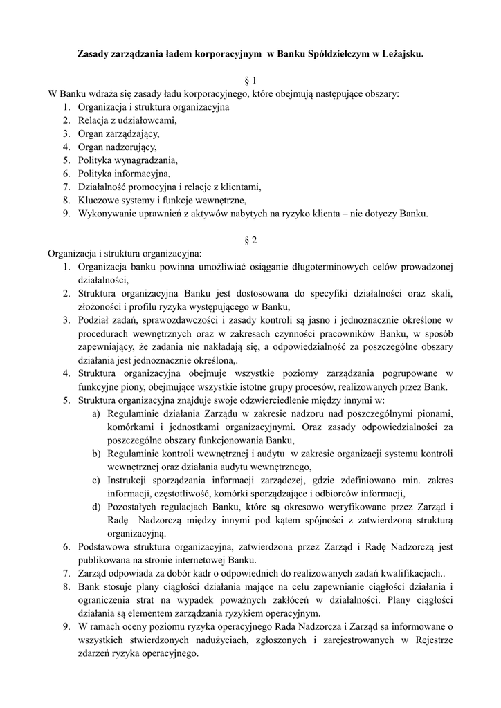 Zasady zarządzania ładem korporacyjnym w Banku Spółdzielczym w Leżajsku. §1 W Banku wdraża się zasady ładu korporacyjnego, które obejmują następujące obszary: 1. Organizacja i struktura organizacyjna 2. Relacja z udziałowcami, 3. Organ zarządzający, 4. Organ nadzorujący, 5. Polityka wynagradzania, 6. Polityka informacyjna, 7. Działalność promocyjna i relacje z klientami, 8. Kluczowe systemy i funkcje wewnętrzne, 9. Wykonywanie uprawnień z aktywów nabytych na ryzyko klienta – nie dotyczy Banku. §2 Organizacja i struktura organizacyjna: 1. Organizacja banku powinna umożliwiać osiąganie długoterminowych celów prowadzonej działalności, 2. Struktura organizacyjna Banku jest dostosowana do specyfiki działalności oraz skali, złożoności i profilu ryzyka występującego w Banku, 3. Podział zadań, sprawozdawczości i zasady kontroli są jasno i jednoznacznie określone w procedurach wewnętrznych oraz w zakresach czynności pracowników Banku, w sposób zapewniający, że zadania nie nakładają się, a odpowiedzialność za poszczególne obszary działania jest jednoznacznie określona,. 4. Struktura organizacyjna obejmuje wszystkie poziomy zarządzania pogrupowane w funkcyjne piony, obejmujące wszystkie istotne grupy procesów, realizowanych przez Bank. 5. Struktura organizacyjna znajduje swoje odzwierciedlenie między innymi w: a) Regulaminie działania Zarządu w zakresie nadzoru nad poszczególnymi pionami, komórkami i jednostkami organizacyjnymi. Oraz zasady odpowiedzialności za poszczególne obszary funkcjonowania Banku, b) Regulaminie kontroli wewnętrznej i audytu w zakresie organizacji systemu kontroli wewnętrznej oraz działania audytu wewnętrznego, c) Instrukcji sporządzania informacji zarządczej, gdzie zdefiniowano min. zakres informacji, częstotliwość, komórki sporządzające i odbiorców informacji, d) Pozostałych regulacjach Banku, które są okresowo weryfikowane przez Zarząd i Radę Nadzorczą między innymi pod kątem spójności z zatwierdzoną strukturą organizacyjną. 6. Podstawowa struktura organizacyjna, zatwierdzona przez Zarząd i Radę Nadzorczą jest publikowana na stronie internetowej Banku. 7. Zarząd odpowiada za dobór kadr o odpowiednich do realizowanych zadań kwalifikacjach.. 8. Bank stosuje plany ciągłości działania mające na celu zapewnianie ciągłości działania i ograniczenia strat na wypadek poważnych zakłóceń w działalności. Plany ciągłości działania są elementem zarządzania ryzykiem operacyjnym. 9. W ramach oceny poziomu ryzyka operacyjnego Rada Nadzorcza i Zarząd sa informowane o wszystkich stwierdzonych nadużyciach, zgłoszonych i zarejestrowanych w Rejestrze zdarzeń ryzyka operacyjnego. 10. Bank zapewnia pracownikom odpowiedni dostęp do informacji o zakresach uprawnień, obowiązkach i odpowiedzialności poszczególnych komórek organizacyjnych. Wszyscy pracownicy Banku są powiadamiani z każdą zmianą regulaminu organizacyjnego, co poświadczają w stosownych oświadczeniach. 11. Prawa pracowników są należycie chronione, a ich interesy należycie uwzględniane, Powyższe zasady znalazły odzwierciedlenie w Regulaminie pracy, Zakresach czynności, w Regulaminie organizacyjnym oraz w Instrukcji zarządzania kadrami Banku. §3 Relacja z udziałowcami: 1. Bank działa w interesie wszystkich udziałowców z poszanowaniem interesu klientów. 2. Bank zapewnia udziałowcom właściwy dostęp do informacji. 3. Udziałowcy mogą wpływać na funkcjonowanie instytucji nadzorowanej wyłącznie poprzez decyzje organu stanowiącego nie naruszając kompetencji pozostałych organów. 4. Udziałowcy w swych decyzjach powinni kierować się interesem Banku. 5. Udziałowcy nie powinni wykorzystywać swojej pozycji do podejmowania decyzji prowadzących do przeniesienia aktywów z Banku do innych podmiotów a także do nabycia lub zbycia albo zawierania innych transakcji powodujących rozporządzenie przez Bank jej majątkiem na warunkach innych niż rynkowe, czy też z narażeniem bezpieczeństwa lub interesu Banku. 6. Przeprowadzenie transakcji z podmiotem powiązanym powinno być uzasadnione interesem Banku i powinno być dokonane w sposób transparentny w oparciu o zapisy regulacji wewnętrznych Banku. 7. Udziałowcy odpowiadają za utrzymanie pozycji kapitałowej Banku zdefiniowanej w Polityce kapitałowej (w tym w Polityce dywidendowej) Banku. 8. Powyższe zasady mają odzwierciedlenie w regulaminach obejmujących zasady działania organów statutowych Banku. §4 Zarząd: 1. Członkowie Zarządu Banku posiadają odpowiednie kompetencje do prowadzenia spraw oraz dają rękojmię należytego wykonywania powierzonych im obowiązków. 2. Zarząd jest jedynym uprawnionym i odpowiedzialnym za zarządzanie działalnością Banku, w tym za prowadzenie spraw, planowanie, organizowanie, decydowanie, kierowanie oraz kontrolowanie działalności Banku. 3. Pracą Zarządu kieruje Prezes, a wewnętrzny podział obowiązków w Zarządzie zapewnia unikanie konfliktów interesów. 4. Pełnienie funkcji w Zarządzie powinno stanowić główny obszar aktywności zawodowej członka Zarządu. 5. Powyższe zasady reguluje Regulamin działania Zarządu . §5 Rada Nadzorcza: 1. Członkowie Rady Nadzorczej Banku posiadają odpowiednie kompetencje do prowadzenia spraw oraz dają rękojmię należytego wykonywania powierzonych im obowiązków. 2. Indywidualne kompetencje poszczególnych członków Rady Nadzorczej powinny uzupełniać 3. 4. 5. 6. się w taki sposób, aby umożliwiać zapewnienie odpowiedniego poziomu kolegialnego sprawowania nadzoru nad wszystkimi obszarami działania. Rada Nadzorcza oraz poszczególni jej członkowie przy wykonywaniu nadzoru kierują się obiektywną oceną i osądem. Określony w Statucie skład liczebny Rady Nadzorczej jest adekwatny do charakteru i skali prowadzonej przez Bank działalności. Członek Rady Nadzorczej powinien podejmować aktywność zawodową bez uszczerbku dl