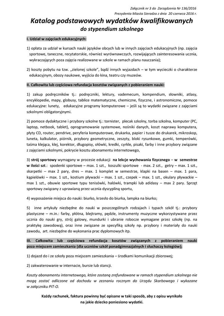Załącznik nr 3 do Zarządzenia Nr 136/2016 Prezydenta Miasta Sieradza z dnia 20 czerwca 2016 r. Katalog podstawowych wydatków kwalifikowanych do stypendium szkolnego I. Udział w zajęciach edukacyjnych: 1) opłata za udział w kursach nauki języków obcych lub w innych zajęciach edukacyjnych (np. zajęcia sportowe, taneczne, recytatorskie, również wyrównawczych, rozwijających zainteresowania ucznia, wykraczających poza zajęcia realizowane w szkole w ramach planu nauczania); 2) koszty pobytu na tzw. „zielonej szkole”, bądź innych wyjazdach – w tym wycieczki o charakterze edukacyjnym, obozy naukowe, wyjścia do kina, teatru czy muzeów. II. Całkowita lub częściowa refundacja kosztów związanych z pobieraniem nauki: 1) zakup podręczników tj.: podręczniki, lektury, vademecum, kompendium, słowniki, atlasy, encyklopedie, mapy, globusy, tablice matematyczne, chemiczne, fizyczne, i astronomiczne, pomoce edukacyjne: lunety, edukacyjne programy komputerowe – jeśli są to wydatki związane z zajęciami szkolnymi obligatoryjnymi. 2) pomoce dydaktyczne i przybory szkolne tj.: tornister, plecak szkolny, torba szkolna, komputer (PC, laptop, netbook, tablet), oprogramowanie systemowe, nośniki danych, koszt naprawy komputera, płyty CD, router, pendrive, peryferia komputerowe, drukarka, papier i tusze do drukarek, mikroskop, luneta, kalkulator, piórnik, przybory geometryczne, zeszyty, bloki rysunkowe, gumki, temperówki, taśma klejąca, klej, korektor, długopisy, ołówki, kredki, cyrkle, pisaki, farby i inne przybory związane z zajęciami szkolnymi, pokrycie kosztu abonamentu internetowego, 3) strój sportowy wymagany w procesie edukacji na lekcje wychowania fizycznego – w semestrze w ilości szt.: spodenki sportowe – max. 1 szt., koszulki sportowe - max. 2 szt., getry – max. 1 szt., skarpetki – max 2 pary, dres – max. 1 komplet w semestrze, klapki na basen – max. 1 para, kąpielówki – max. 1 szt., kostium pływacki – max. 1 szt., czepek – max. 1 szt., okulary pływackie – max 1 szt., obuwie sportowe typu tenisówki, halówki, trampki lub adidasy – max 2 pary. Sprzęt sportowy związany z uprawianą przez ucznia dyscypliną sportu, 4) wyposażenie miejsca do nauki: biurko, krzesło do biurka, lampka na biurko; 5) inne artykuły niezbędne do nauki w poszczególnych rodzajach i typach szkół tj.: przybory plastyczne – m.in.: farby, płótna, blejtramy, pędzle, instrumenty muzyczne wykorzystywane przez ucznia do nauki gry, strój galowy, mundurki i ubranie robocze wymagane przez szkołę (np. na praktykę zawodową), oraz inne związane ze specyfiką szkoły np. przybory i materiały do nauki zawodu, art. niezbędne do wykonania prac dyplomowych itp. III. Całkowita lub częściowa refundacja kosztów związanych z pobieraniem poza miejscem zamieszkania (dla uczniów szkół ponadgimnazjalnych i słuchaczy kolegiów); nauki 1) dojazd do i ze szkoły poza miejscem zamieszkania – środkami komunikacji zbiorowej; 2) zakwaterowanie w internacie, bursie lub stancji. Koszty abonamentu internetowego, które zostaną zrefundowane w ramach stypendium szkolnego nie mogą zostać odliczone od dochodu w zeznaniu rocznym do Urzędu Skarbowego i wykazane w załączniku PIT-O. Każdy rachunek, faktura powinny być opisane w taki sposób, aby z opisu wynikało na jakie dziecko poniesiono wydatki.