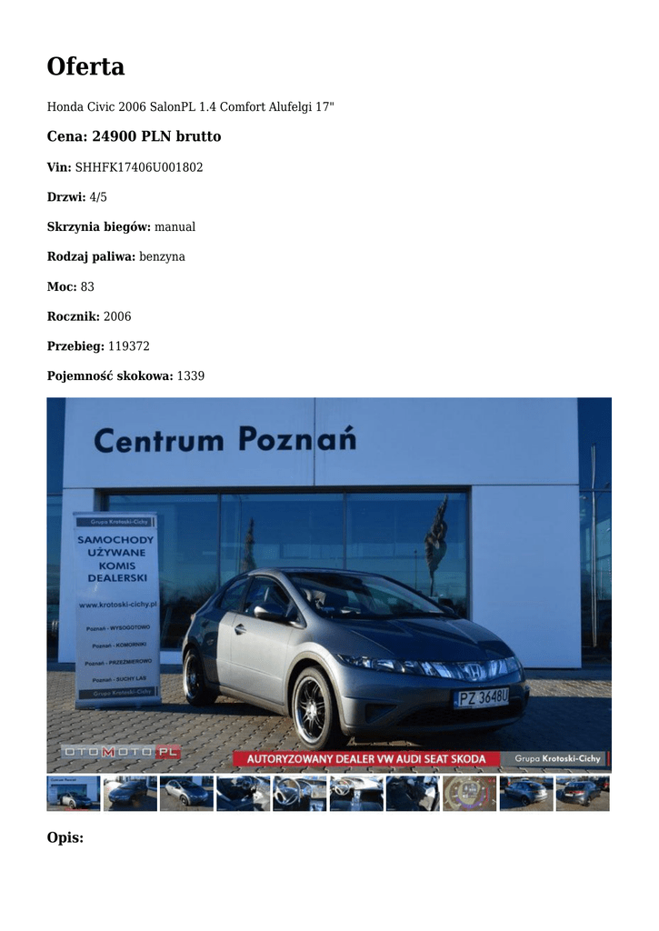 Oferta Honda Civic 2006 SalonPL 1.4 Comfort Alufelgi 17" Cena: 24900 PLN brutto Vin: SHHFK17406U001802 Drzwi: 4/5 Skrzynia biegów: manual Rodzaj paliwa: benzyna Moc: 83 Rocznik: 2006 Przebieg: 119372 Pojemność skokowa: 1339 Opis: Auto-Handel-Centrum Krotoski-Cichy Autoryzowany Dealer VW Audi Seat Skoda Opel GWARANCJA POCHODZENIA MOŻLIWOŚĆ SPRAWDZENIA POJAZDU W AUTORYZOWANEJ STACJI OBSŁUGI -----------------------------------------------------------------------------------------------------------------------------------------------------Uwaga: Miejsce ekspozycji pojazdu - Grupa Krotoski - Cichy Salon Volkswagen ul. Głogowska/Kowalewicka 3C, 60-002 Poznań - Komorniki Osoba kontaktowa tel: Romualda Kroll 601 751 199 Maciej Oblizajek 697 700 055 Maciej Śmigielski 781 440 157 tel.: +48 61 832 72 06 MOŻLIWA JAZDA PRÓBNA PO WCZEŚNIEJSZYM UZGODNIENIU TERMINU -----------------------------------------------------------------------------------------------------------------------------------------------------Kupiony w Polskim salonie Honda Data 1 rejestracji 14-04-2006 r. Silnik 1.4 83KM Manualna 6-biegowa skrzynia biegów Wersja wyposażenia COMFORT Wyposażenie: ABS - Układ zapobiegający blokowaniu kół EBD - Układ elektronicznego rozdziału siły hamowania BA - Układ wspomagania siły hamowania VSA - System kontroli stabilności jazdy Przełącznik dezaktywujący przednią poduszkę powietrzną pasażera Przednie poduszki powietrzne SRS Boczne poduszki powietrzne Kurtyny powietrzne Aktywne zagłówki przednie 2 zestawy kluczyków z systemem zdalnego sterowania Wyświetlacz wielofunkcyjny Głośniki z przodu Głośniki z tyłu Radio z RDS i odtwarzaczem płyt CD Kieszeń na oparciu fotela pasażera Uchwyt na napoje z przodu Oświetlenie bagażnika Lusterko w osłonie przeciwsłonecznej Podświetlenie lusterek w osłonach przeciwsłonecznych Manualnie regulowana wysokość fotela kierowcy Kolumna kierownicy regulowana w dwóch płaszczyznach Oświetlenie do czytania mapy Elektrycznie regulowane szyby przednie oraz tylne z funkcją automatycznego opuszczania i podnoszenia Klimatyzacja automatyczna Filtr przeciwpyłkowy Welurowa tapicerka Kierownica wielofunkcyjna Obręcze kół 17” ze stopów metali lekkich Lusterka zewnętrzne w kolorze nadwozia Zderzaki w kolorze nadwozia Kierunkowskazy boczne zintegrowane z lusterkami zewnętrznymi Przednie reflektory halogenowe Elektrycznie regulowane i podgrzewane lusterka zewnętrzne i inne Podana cena brutto - wystawiamy fakturę VAT Marża -----------------------------------------------------------------------------------------------------------------------------------------------------Oferujemy kompleksową obsługę sprzedaży ratalnej na bardzo dogodnych warunkach - w celu bliższego zapoznania się z aktualną ofertą finansowania prosimy o kontakt : Maciej Oblizajek 697-700-055. Oferujemy ubezpieczenia samochodowe z wiodących na rynku ubezpieczalni - możliwość zakupu pakietu ubezpieczeniowego na miejscu. Oferujemy możliwość jazdy próbnej przed zakupem oraz usługę inspekcji pojazdu w autoryzowanym serwisie Skoda. Przyjmujemy również w rozliczeniu każdy pojazd. -----------------------------------------------------------------------------------------------------------------------------------------------------Godziny otwarcia: pon - pt 9.00 - 19.00 sob 9.00 - 14.00 Uwaga: Miejsce ekspozycji pojazdu - Grupa Krotoski - Cichy Salon Volkswagen ul. Głogowska/Kowalewicka 3C, 60-002 Poznań - Komorniki Osoba kontaktowa tel: Romualda Kroll 601 751 199 Maciej Oblizajek 697 700 055 Maciej Śmigielski 781 440 157 tel.: +48 61 832 72 06 -----------------------------------------------------------------------------------------------------------------------------------------------------Ogłoszenie ma charakter informacyjny i stanowi zaproszenie do zawarcia umowy (art. 71 Kodeksu cywilnego); nie stanowi natomiast oferty handlowej w rozumieniu art. 66 § 1 Kodeksu cywilnego. W celu sprawdzenia zgodności oferty oraz uzyskania wszelkich informacji prosimy kontaktować się z handlowcem d.s. samochodów używanych Auto możesz zobaczyć: ul. Głogowska/Kowalewicka 3 60-002 Poznań tel: 61 832 72 05 Maciej Śmigielski GSM: 781-440-157 e-mail: [email protected] Romualda Kroll GSM: 601-751-199 e-mail: [email protected] Maciej Oblizajek GSM: 697-700-055 e-mail: [email protected]
