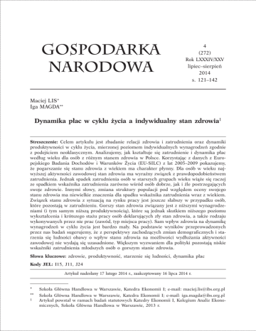 Maciej Lis, Iga Magda, Dynamika płac w cyklu życia a indywidualny stan zdrowia Gospodarka narodowa 121 4 (272) Rok LXXXIV/XXV lipiec–sierpień 2014 s. 121–142 Maciej LIS* Iga M AGDA** Dynamika płac w cyklu życia a indywidualny stan zdrowia1 Streszczenie: Celem artykułu jest zbadanie relacji zdrowia i zatrudnienia oraz dynamiki produktywności w cyklu życia, mierzonej poziomem indywidualnych wynagrodzeń zgodnie z podejściem neoklasycznym. Analizujemy, jak kształtuje się zatrudnienie i dynamika płac według wieku dla osób z różnym stanem zdrowia w Polsce. Korzystając z danych z Euro‑ pejskiego Badania Dochodów i Warunków Życia (EU‑SILC) z lat 2005–2009 pokazujemy, że pogarszanie się stanu zdrowia z wiekiem ma charakter płynny. Dla osób w wieku naj‑ wyższej aktywności zawodowej stan zdrowia ma wyraźny związek z prawdopodobieństwem zatrudnienia. Jednak spadek zatrudnienia osób w starszych grupach wieku wiąże się raczej ze spadkiem wskaźnika zatrudnienia zarówno wśród osób dobrze, jak i źle postrzegających swoje zdrowie. Innymi słowy, zmiana struktury populacji pod względem oceny swojego stanu zdrowia ma niewielkie znaczenia dla spadku wskaźnika zatrudnienia wraz z wiekiem. Związek stanu zdrowia z sytuacją na rynku pracy jest jeszcze słabszy w przypadku osób, które pozostają w zatrudnieniu. Gorszy stan zdrowia związany jest z niższymi wynagrodze‑ niami (i tym samym niższą produktywnością), które są jednak skutkiem niższego poziomu wykształcenia i krótszego stażu pracy osób deklarujących zły stan zdrowia, a także rodzaju wykonywanych przez nie prac (zawód, typ miejsca pracy). Sam wpływ zdrowia na dynamikę wynagrodzeń w cyklu życia jest bardzo mały. Na podstawie wyników przeprowadzonych przez nas badań sugerujemy, że z perspektywy zachodzących zmian demograficznych i sta‑ rzenia się ludności obawy o wpływ stanu zdrowia na możliwości wydłużania aktywności zawodowej nie wydają się uzasadnione. Większym wyzwaniem dla polityki pozostają niskie wskaźniki zatrudnienia młodszych osób o gorszym stanie zdrowia. Słowa kluczowe: zdrowie, produktywność, starzenie się ludności, dynamika płac Kody JEL: I15, J11, J24 Artykuł nadesłany 17 lutego 2014 r., zaakceptowany 16 lipca 2014 r. * ** 1 Szkoła Główna Handlowa w Warszawie, Katedra Ekonomii I; e-mail: [email protected] Szkoła Główna Handlowa w Warszawie, Katedra Ekonomii I; e-mail: [email protected] Artykuł powstał w ramach badań statutowych Katedry Ekonomii I, Kolegium Analiz Ekono‑ micznych, Szkoła Główna Handlowa w Warszawie, 2013 r. 122 GOSPODARKA NARODOWA nr 4/2014 Wprowadzenie Zmiany demograficzne skutkujące znaczącym wzrostem udziału w popula‑ cji ogółem osób starszych wywołują dyskusję o ich znaczeniu dla rynku pracy i niezbędnym zwiększaniu zatrudnienia w starszych grupach wieku oraz moż‑ liwości (konieczności) podnoszenia ustawowego wieku emerytalnego, nawet do 70–75 roku życia. W dyskursie publicznym często podnoszone są argumenty, że stan zdrowia osób starszych znacząco obniża ich produktywność, najczę‑ ściej nie pozwalając na zatrudnienie i/lub znacząco zmniejszając ich możliwo‑ ści zarobkowe. Obawy te wskazują na konieczność zbadania, jak kształtuje się relacja poziomu zatrudnienia i wynagrodzeń pracowników według ich wieku i stanu zdrowia. Badanie to pozwoli wykazać, w jakim stopniu malejąca ak‑ tywność w starszych grupach wieku związana jest z pogarszającym się stanem zdrowia oraz w jakim stopniu stan zdrowia przekłada się na dynamikę płac w cyku życia. Są to zagadnienia kluczowe dla rozważań o barierach wzrostu gospodarczego w przyszłości, jak i dla potencjalnie niższych przyrostów pro‑ duktywności na skutek zmiany struktury wieku pracowników. Zagadnienia te są szczególnie istotne z perspektywy Polski, gdzie postępujące zmiany demogra‑ ficzne są szczególnie dynamiczne, a głębokie zmiany w systemie emerytalnym w ostatnich latach znacząco zmieniają aktywność zawodową osób starszych i strukturę pracujących według wieku. W artykule staramy się odpowiedzieć na pytanie o wpływ stanu zdrowia na produktywność i jej dynamikę w cyklu życia. W tym celu analizujemy profile płacowe pracowników według wieku i stanu zdrowia, starając się odseparować jego wpływ od „klasycznych” determinant indywidualnych wynagrodzeń. Pre‑ zentujemy przegląd badań i analiz dotyczących zagadnienia zależności wieku, zdrowia i produktywności. Następnie opisujemy dane, które wykorzystujemy do analizy oraz przyjęte podejście metodyczne badania. Przedstawiamy analizę wy‑ ników oszacowanych modeli. W końcowej części artykułu podsumowujemy wy‑ niki i prezentujemy wnioski z badania dla polityki społeczno‑gospodarczej. Przegląd literatury i tło ekonomiczne Indywidualna produktywność pracowników jest trudno obserwowalna (a czę‑ sto niemożliwa do bezpośredniego zmierzenia). Z tego względu przybliża się ją różnymi miarami. Na przykład korzystając z danych przedsiębiorstw o wytwa‑ rzanej przez nie wartości dodanej oraz strukturze zatrudnienia według wieku szacuje się wkład pracowników do łącznej produktywności według wieku. Nie‑ które badania dostarczają danych o „sygnałach” świadczących o wyższej lub niższej (potencjalnej) produktywności, takich jak stan zdrowia czy fizyczna lub intelektualna sprawność. Z perspektywy makroekonomicznej za wyznacznik produktywności poszczególnych kohort często uznaje się ich wskaźniki zatrud‑ nienia. Najpopularniejszą miarą jest jednak płaca godzinowa danej osoby, która w świetle teorii neoklasycznej odzwierciedla krańcową produktywność. Maciej Lis, Iga Magda, Dynamika płac w cyklu życia a indywidualny stan zdrowia 123 Płaca jest niedoskonałym przybliżeniem indywidualnej produktywności danej osoby. Asymetria informacji na rynku pra